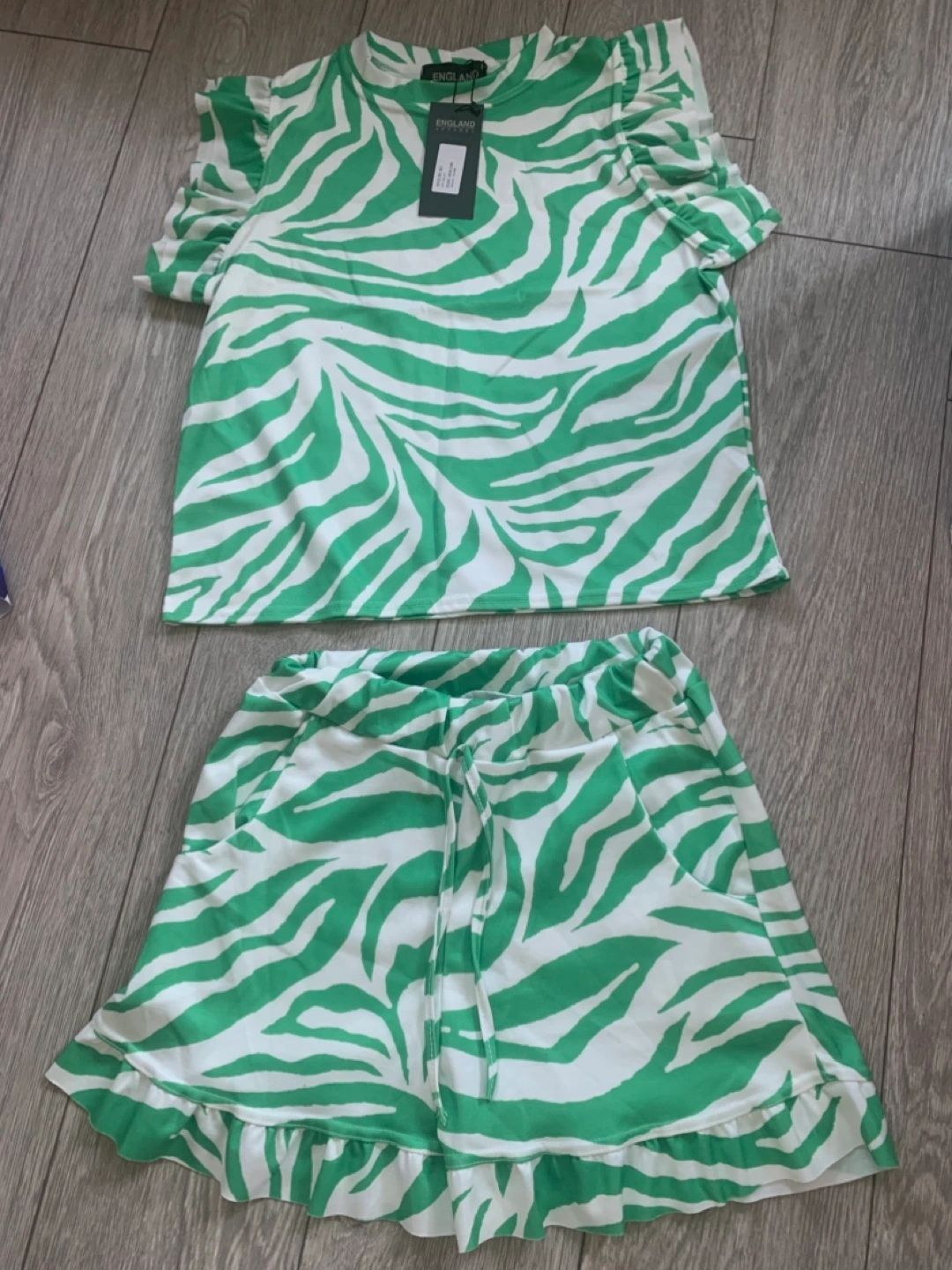 7 reviewsCute two-piece set. Features a cropped top with frilled sleeves and matching shorts. Zebra print design. Ideal for summer.