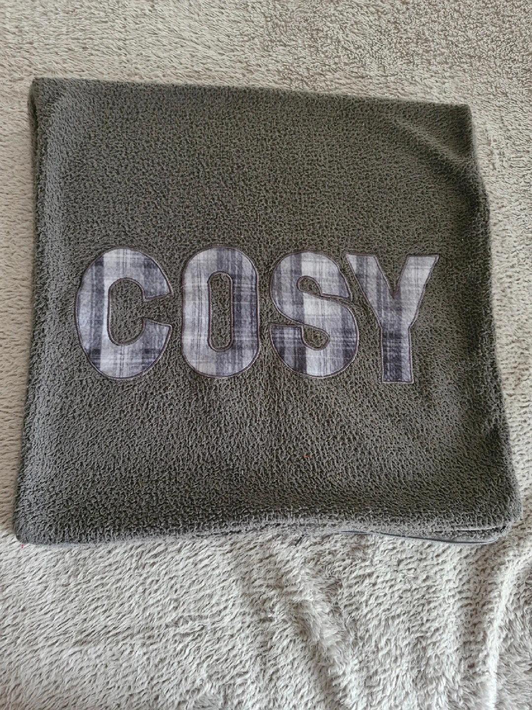21 reviewsHere's a lovely grey cushion cover with the word 'Cosy' on it. It's in great condition and would look perfect on a sofa or bed