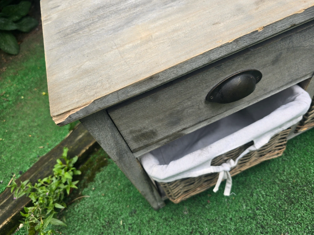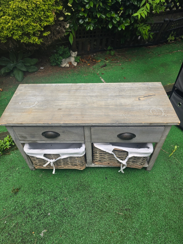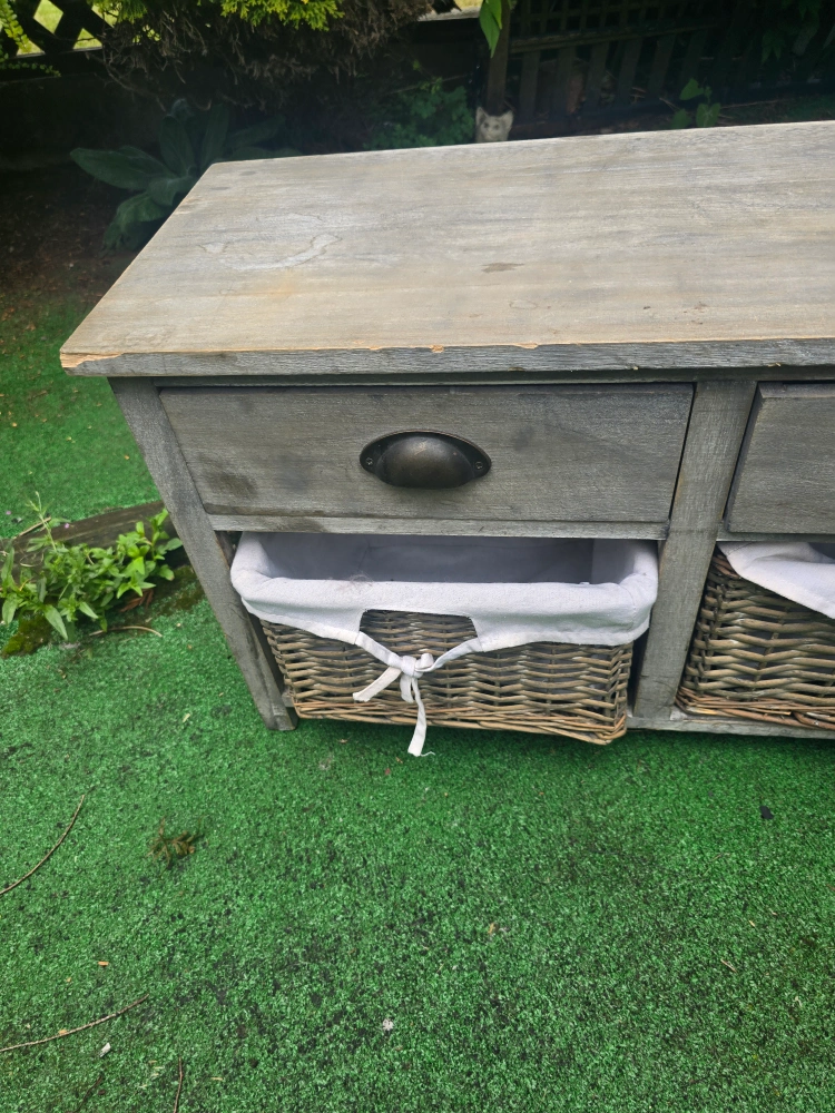 469 reviewsA lovely grey wooden storage unit, perfect for adding a touch of rustic charm to your home. It features drawers and woven baskets for storage. There are some signs of wear and tear on the top corners as shown in the photos, but it's still a very functional and stylish piece of furniture.