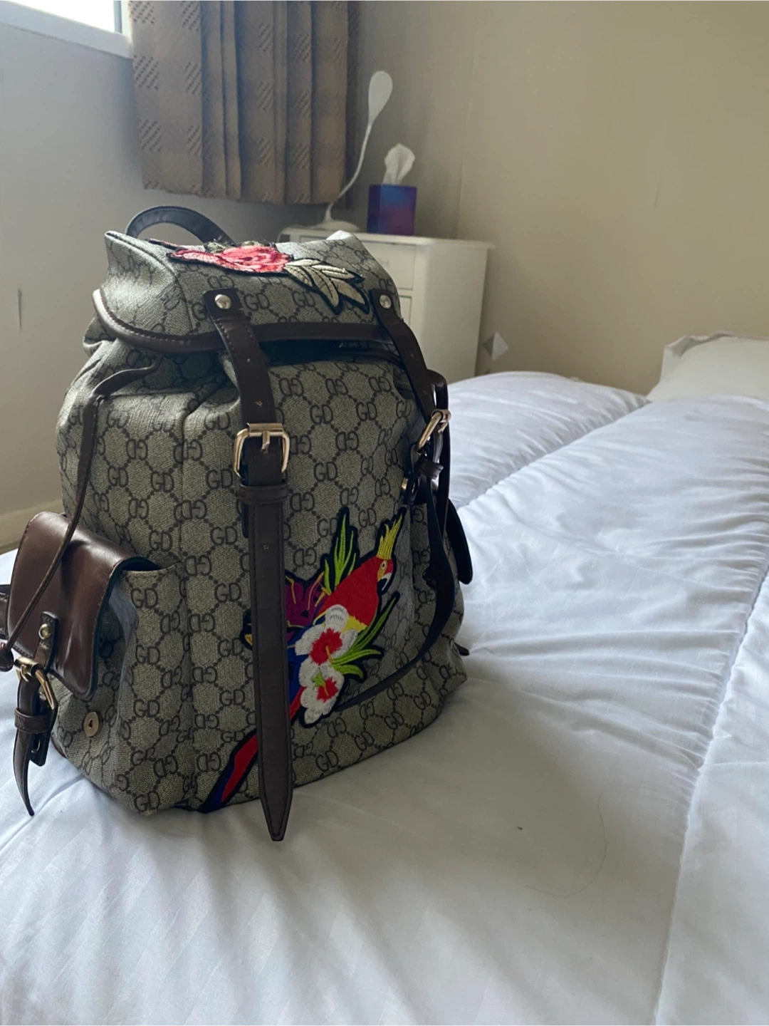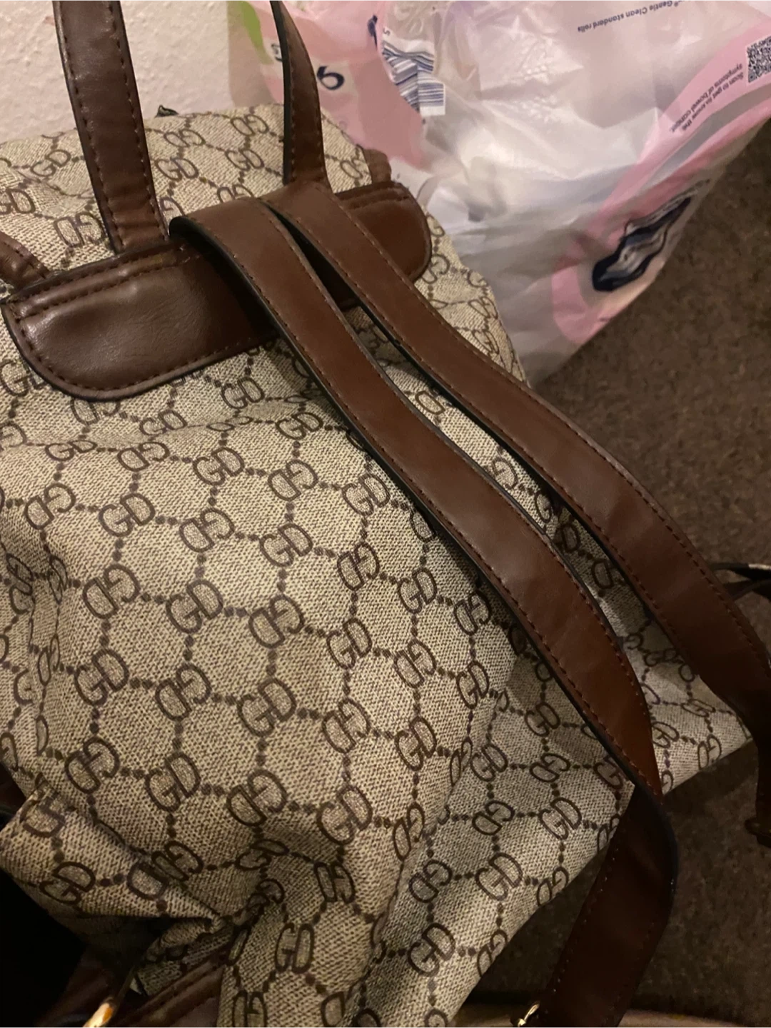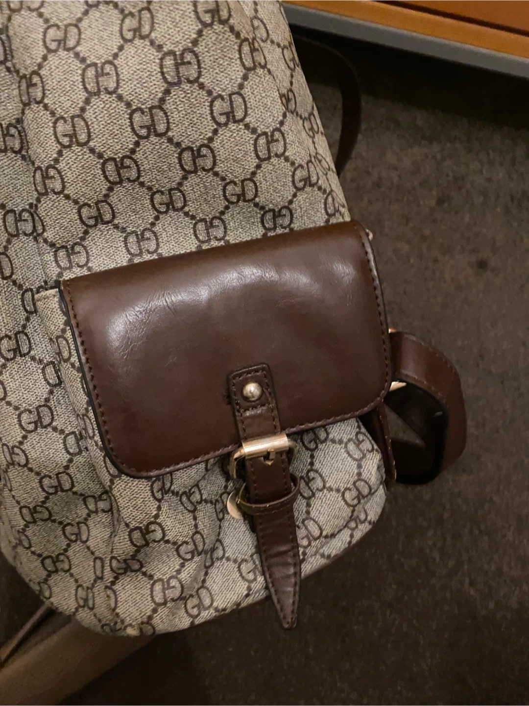 43 reviewsHere's a Gucci backpack. It has a GG pattern and brown leather straps and trim. There is a floral design on the front.bought as a dupe
