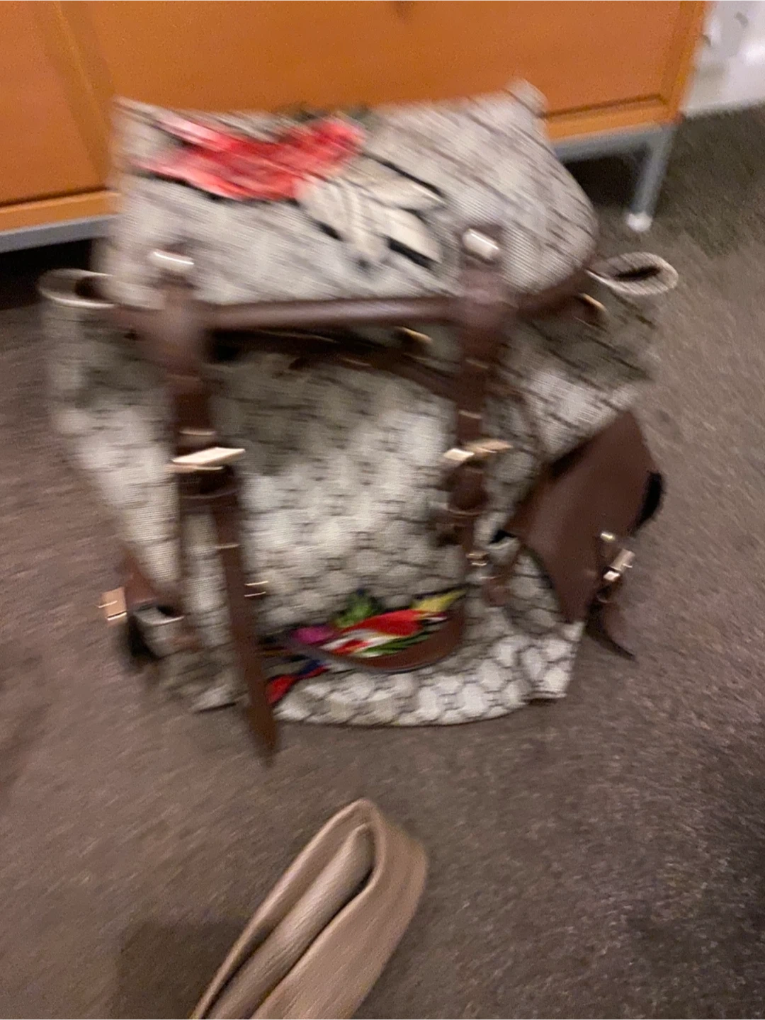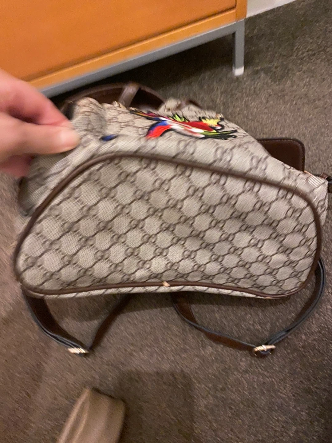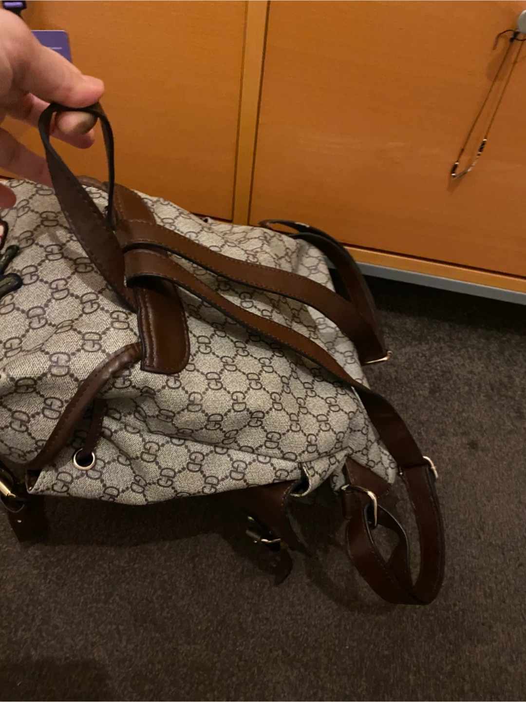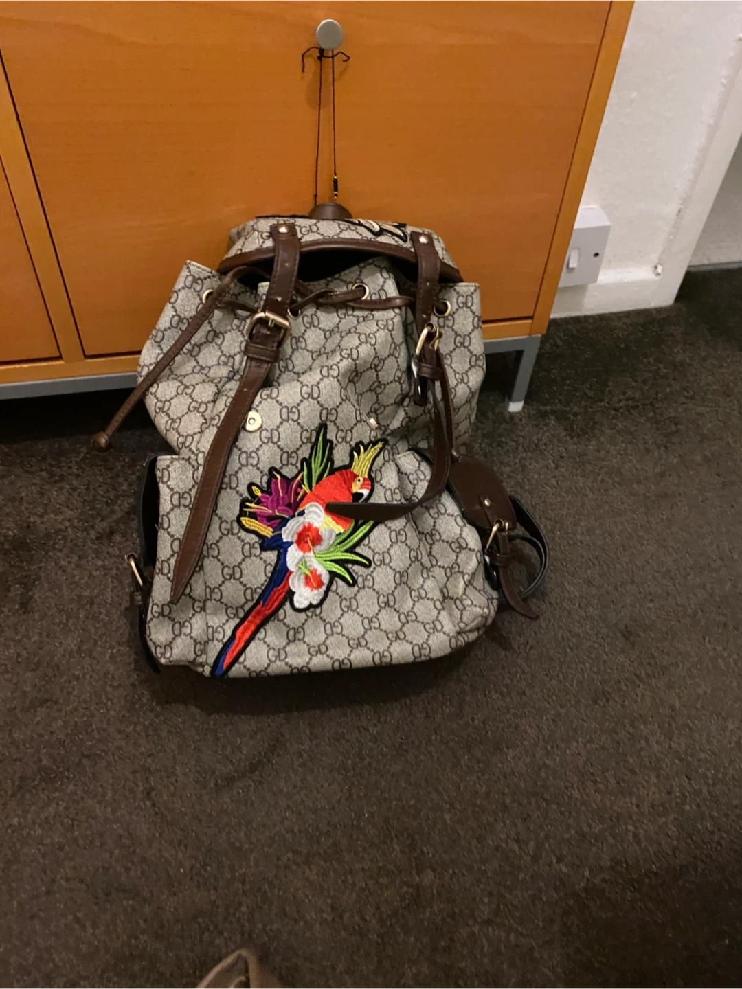 43 reviewsHere's a Gucci backpack. It has a GG pattern and brown leather straps and trim. There is a floral design on the front.bought as a dupe