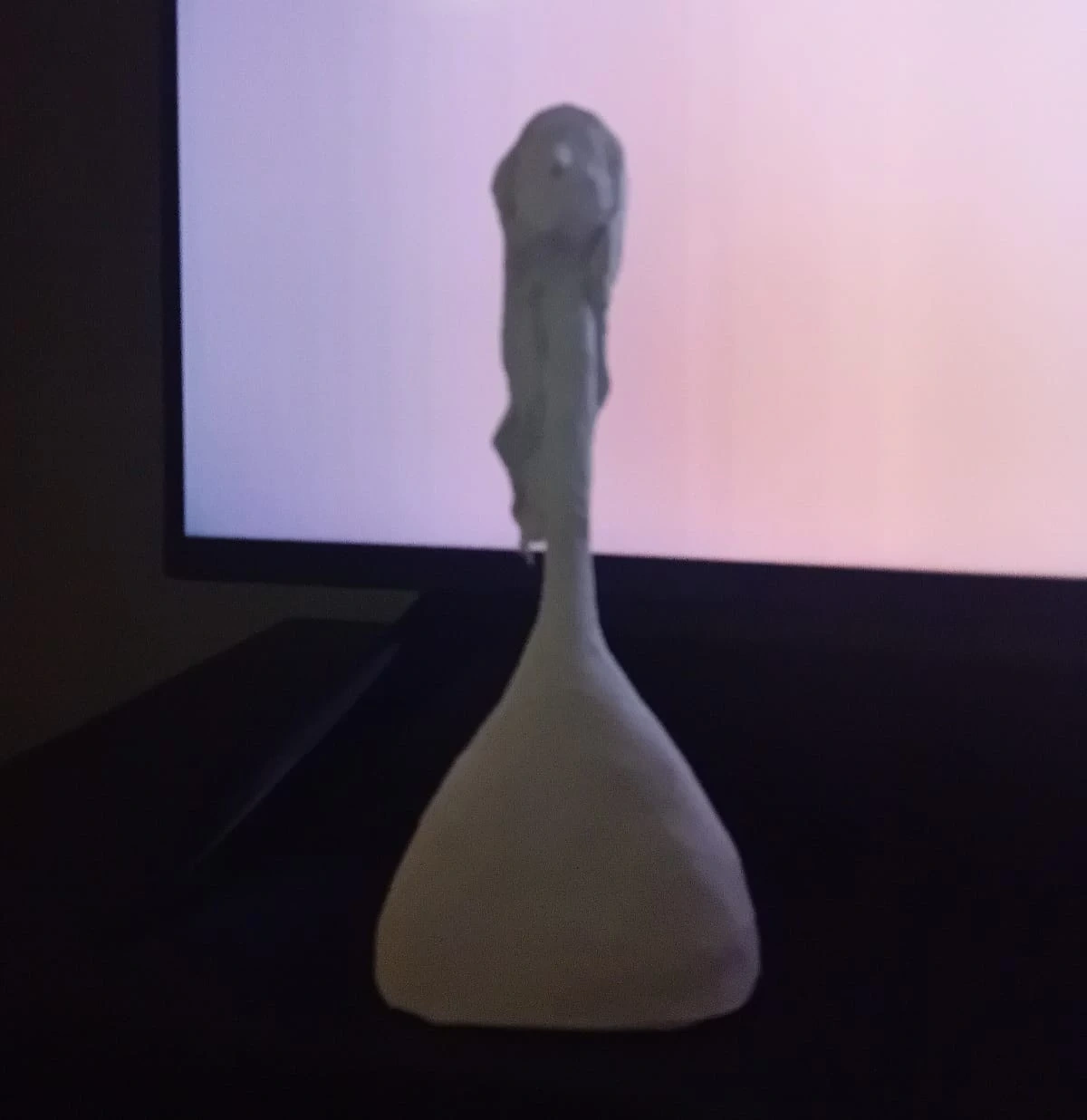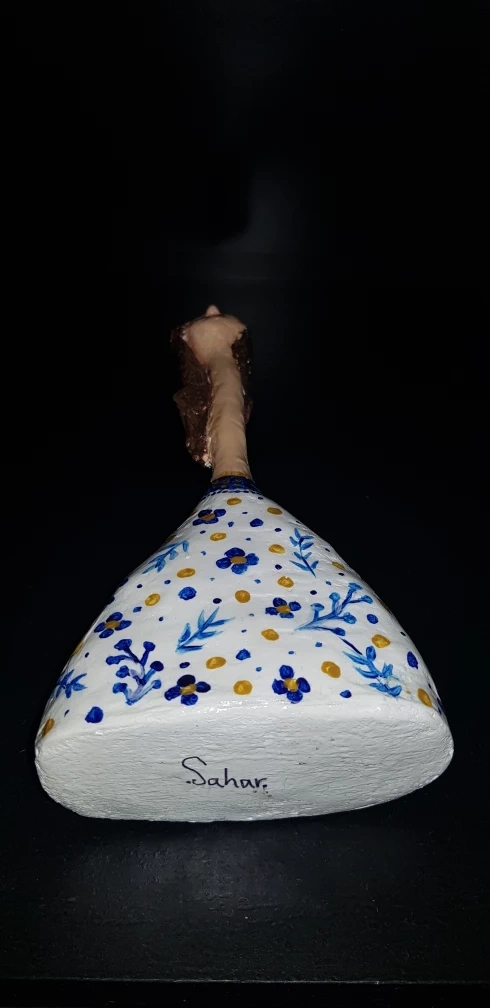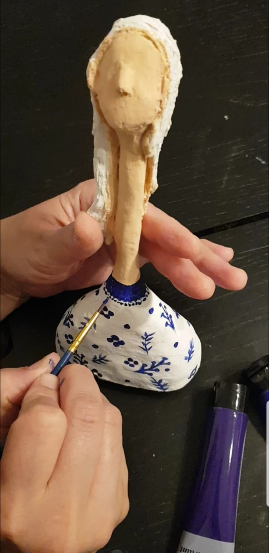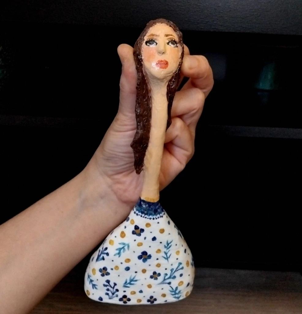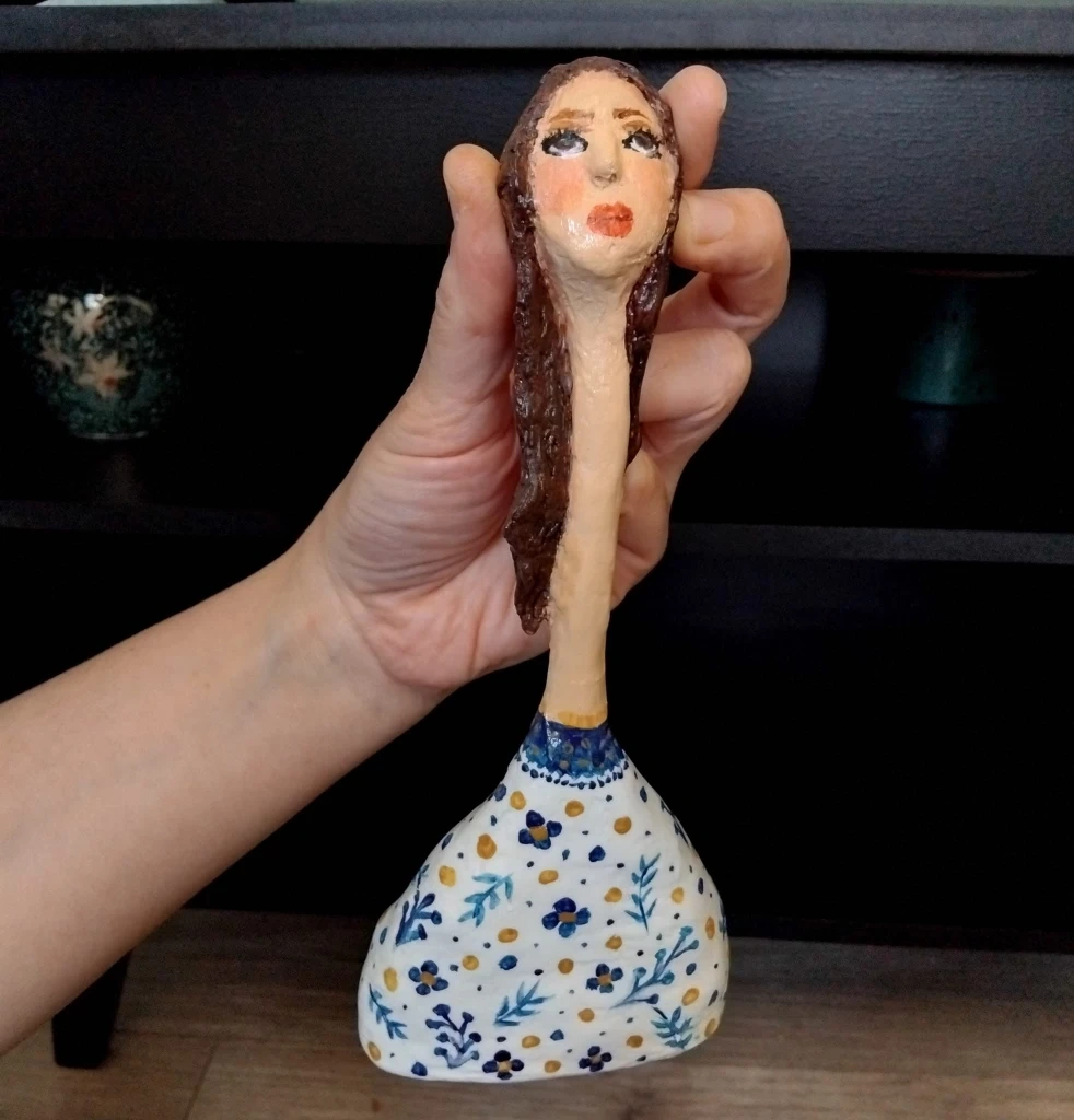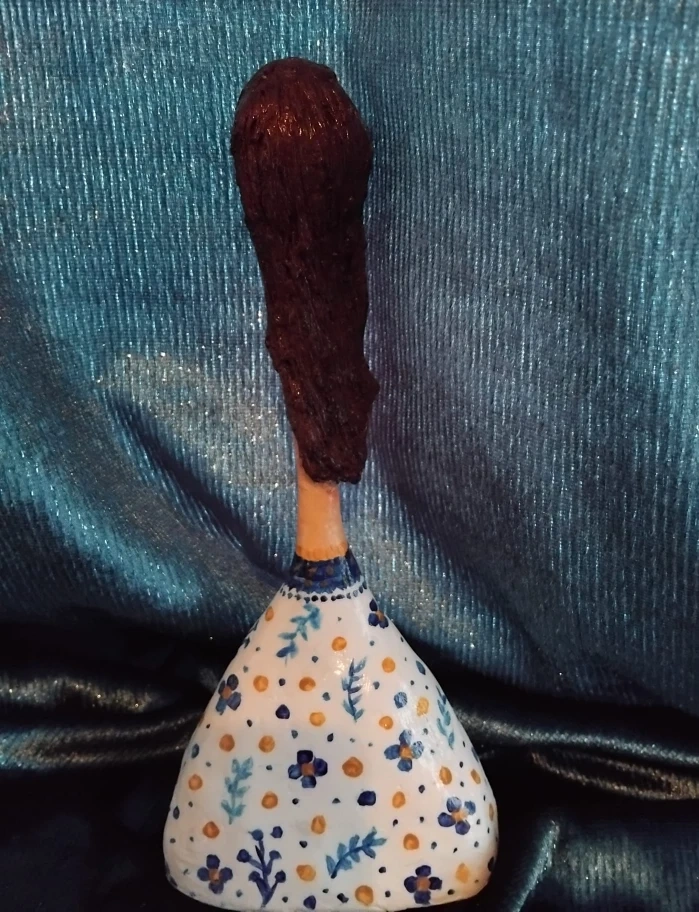 1 reviewA lovely handmade lady ornament. This would make a lovely, calming addition to any home or desk. The ornament has a long neck, and is wearing a flowery dress. The lady has long brown hair. The ornament has been signed on the bottom.