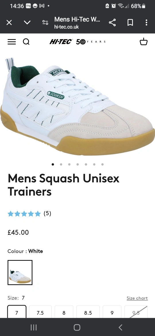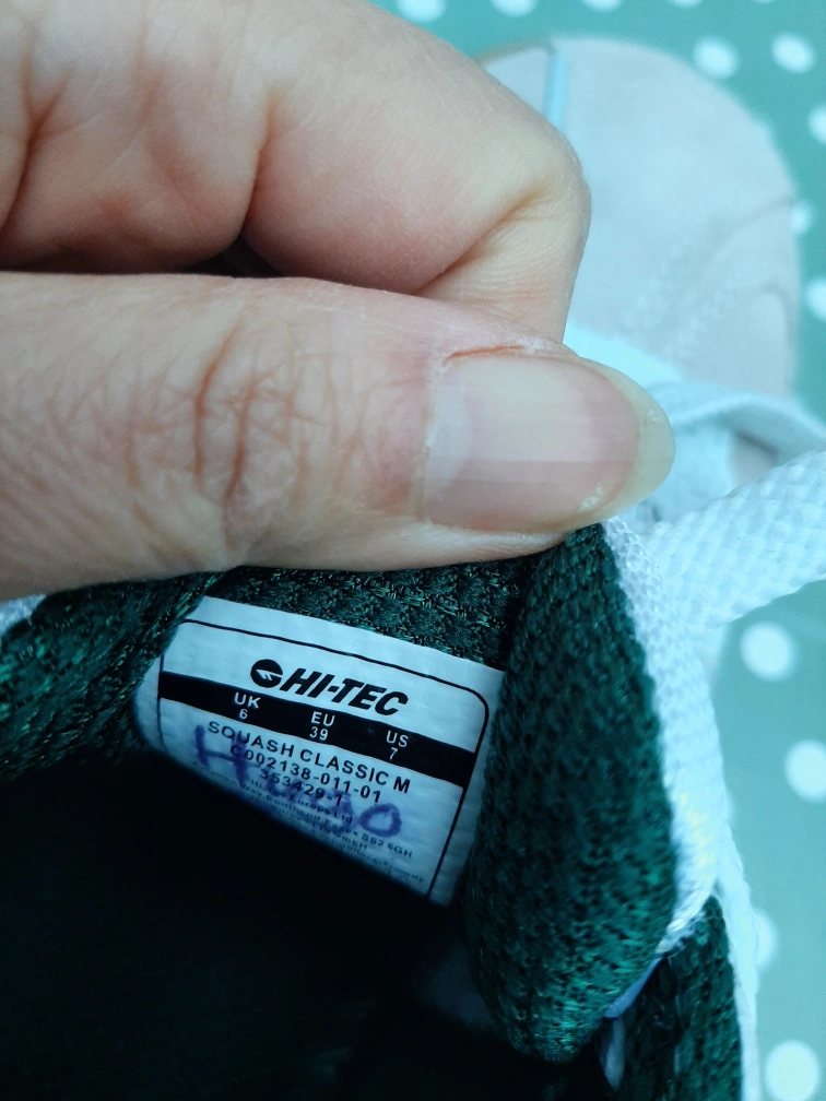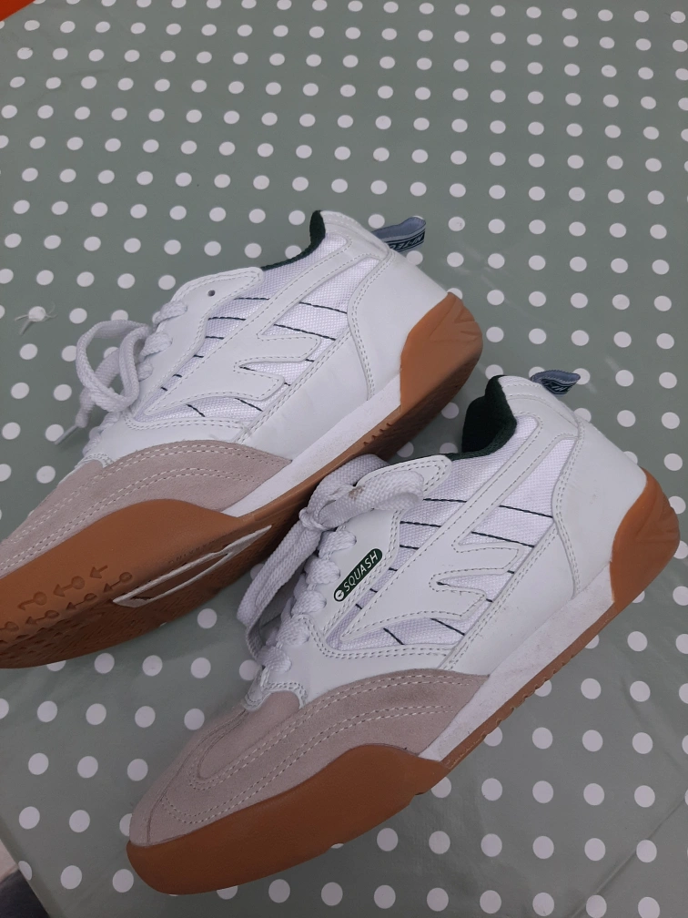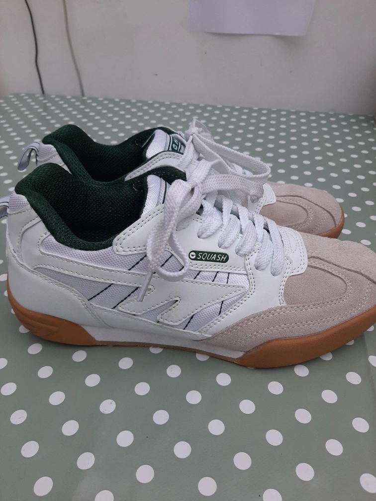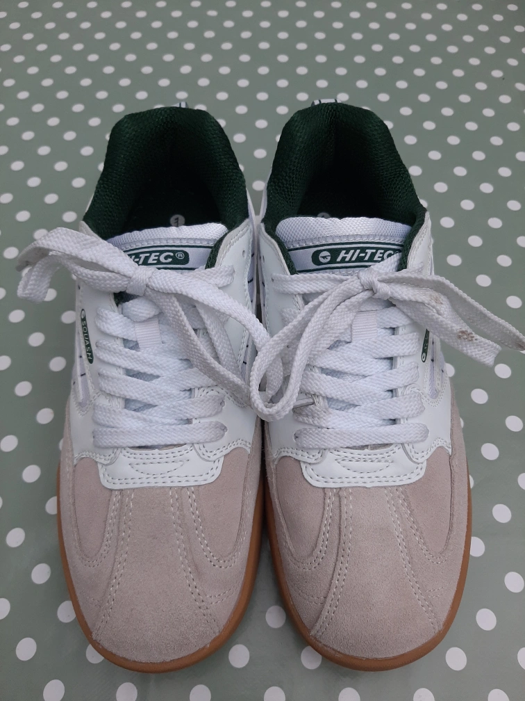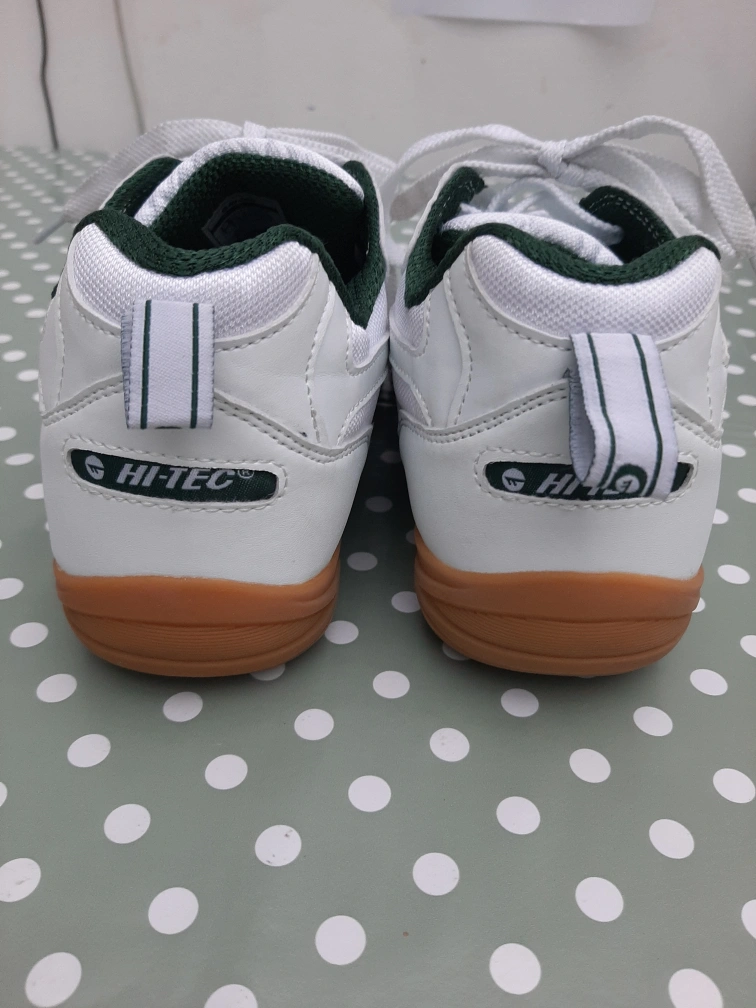 0 reviewsPair of Hi-Tec Squash Classic trainers. Size UK 6. White and beige colourway. Green accents. Lace-up fastening. Very Good condition. These shoes are essential for secondary indoor shoes for PE at a school. Very comfy and it was hardly used. The retail price is £45, but I will sell this for £10 only.