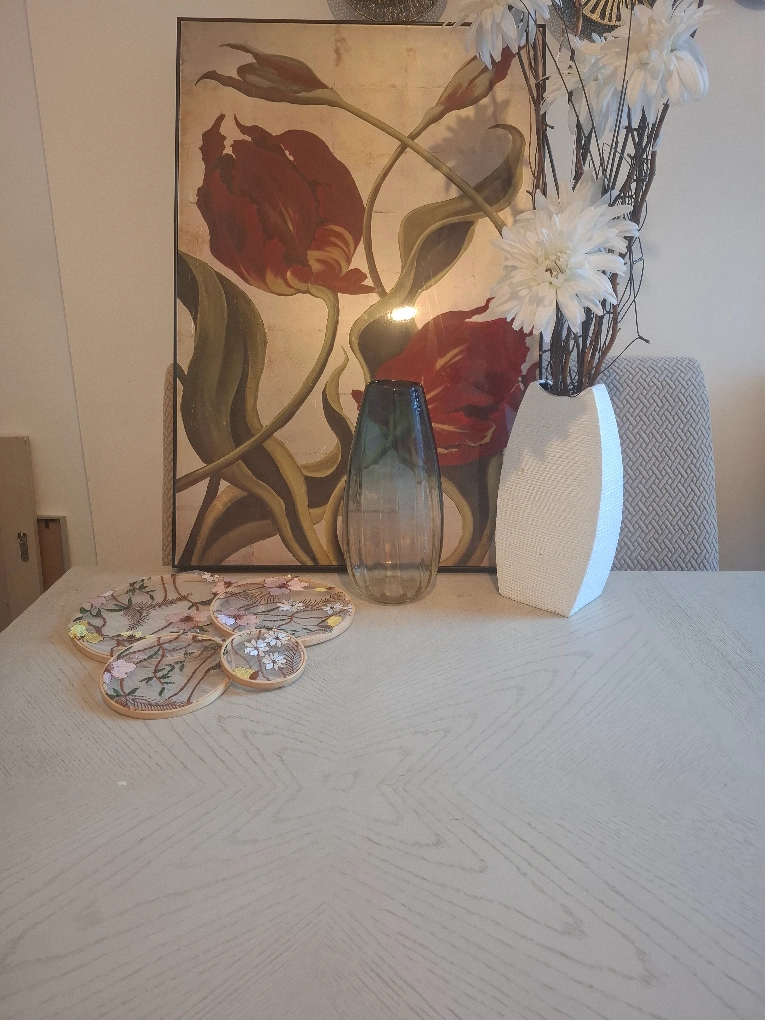 26 reviewsA selection of home decor items, including a glass vase, a white vase, a floral painting, and floral coasters. They would be a lovely addition to any room