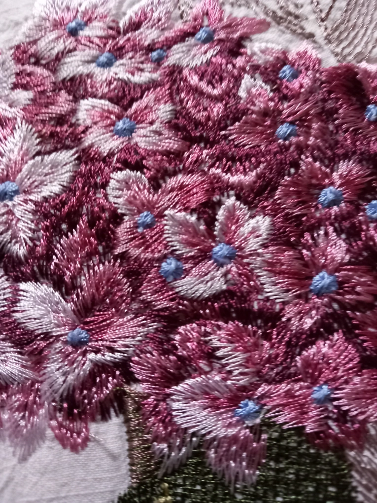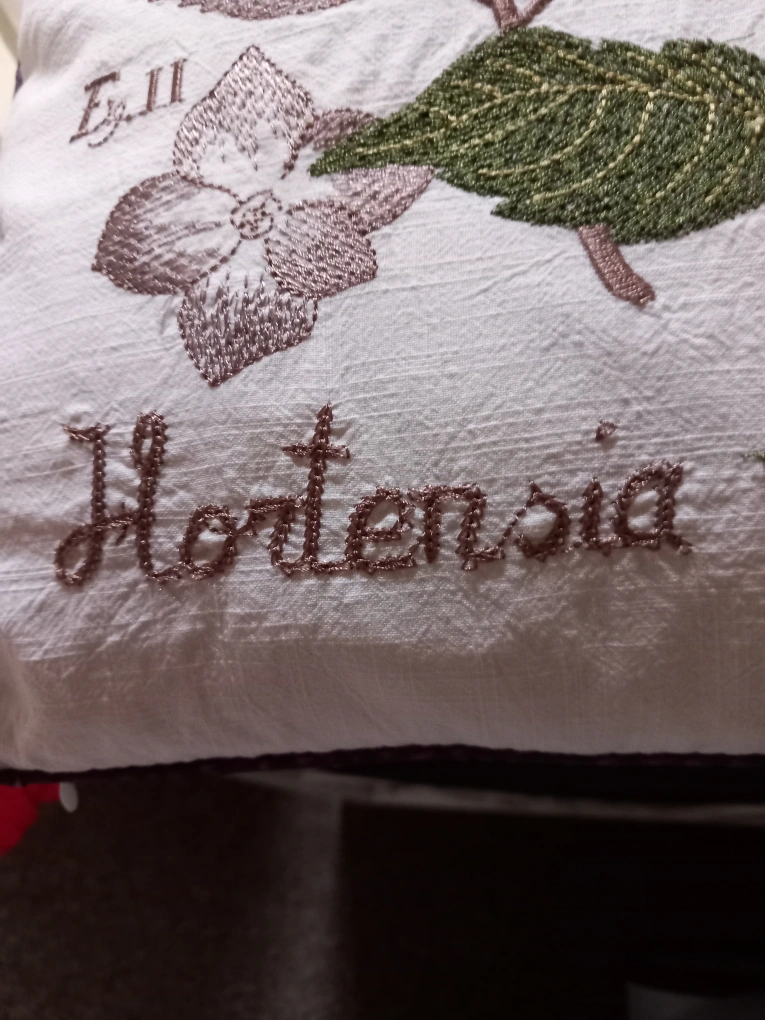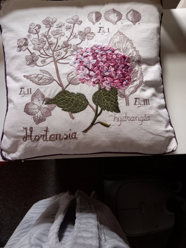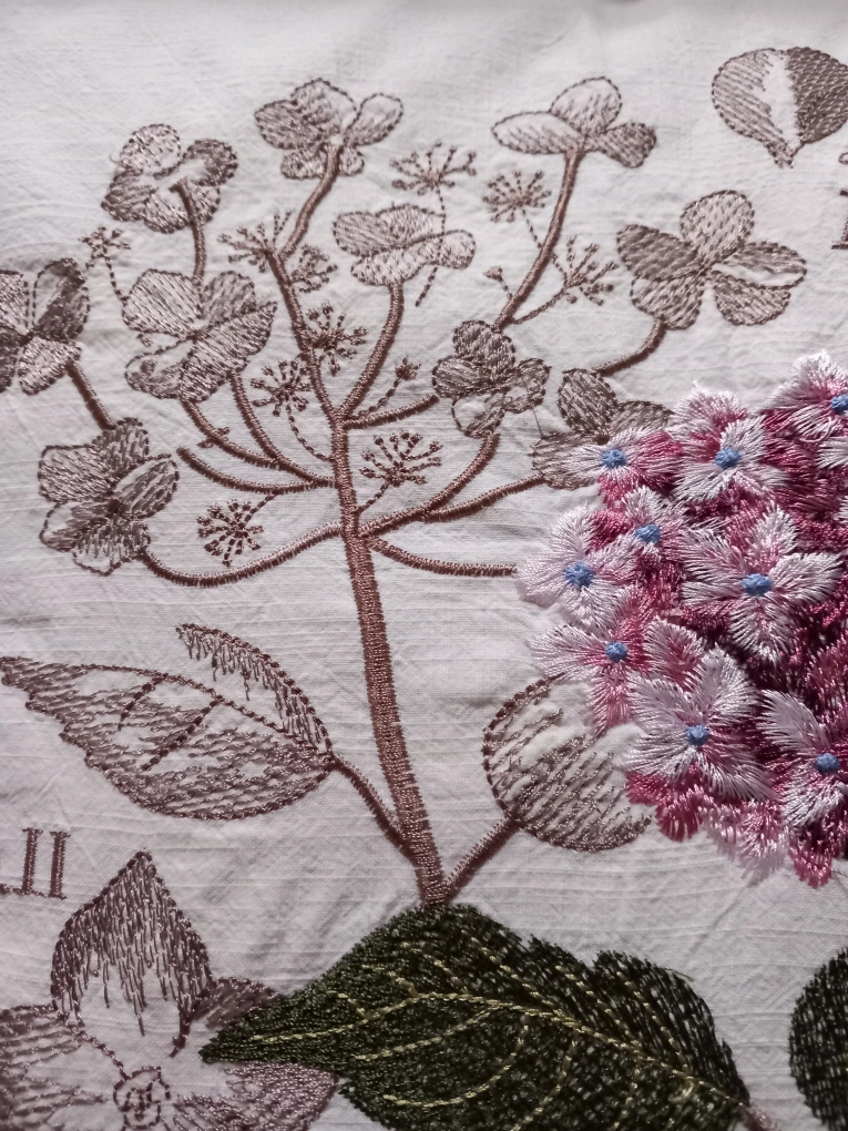 8 reviewsLovely embroidered cushion cover. Features a detailed hydrangea design. Cream coloured cotton with purple and green embroidery. Square shape, piped edges.