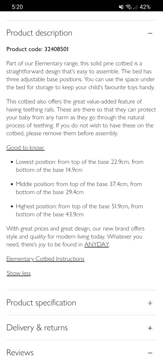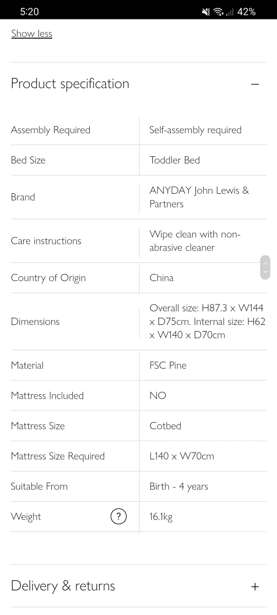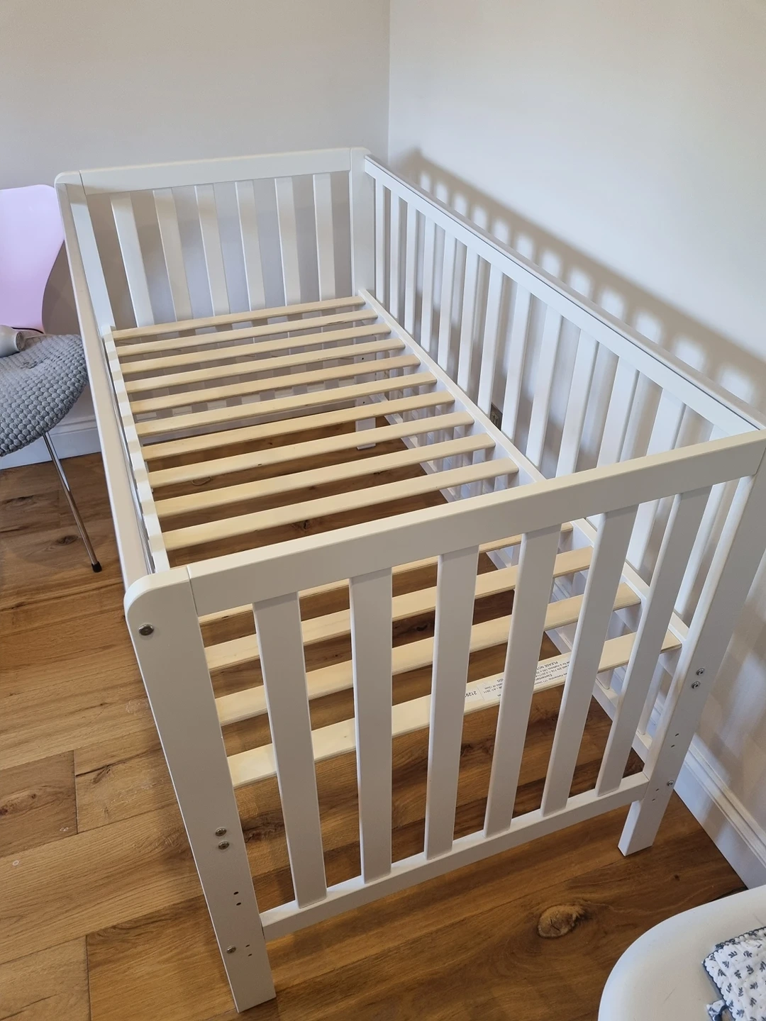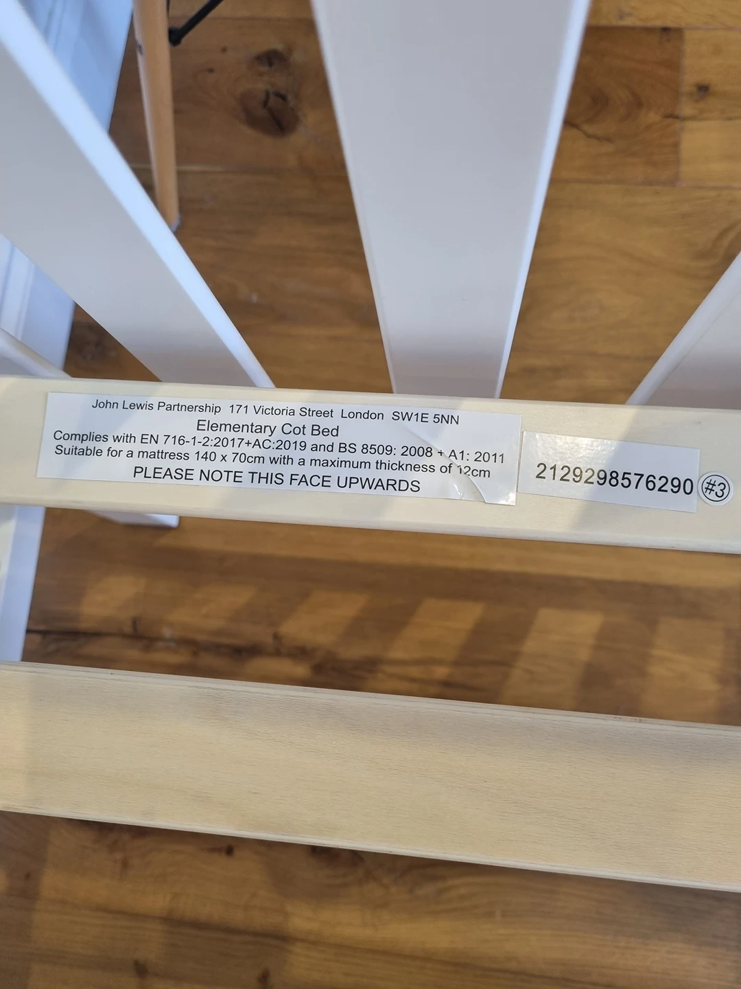 2 reviewsJohn Lewis Elementary Cot Bed Frame Purchased new for £125 Takes 140 x 70 mattress (not included) Solid pine Three adjustable base positions Teething rail Overall size: H87.3 x W144 x D75cm. Internal size: H62 x W140 x D70cm In perfect condition as only used for 3 weeks - selling as our baby prefers a larger bumper floor bed! Disassembled and ready to be taken away. Cash only. Collection from Wimbledon SW19