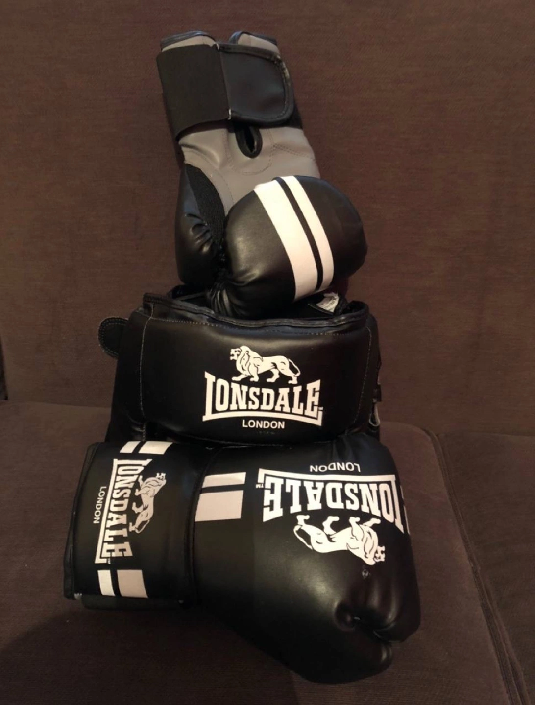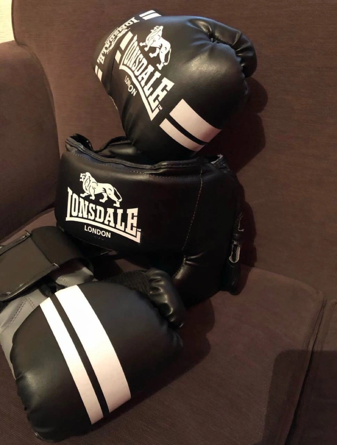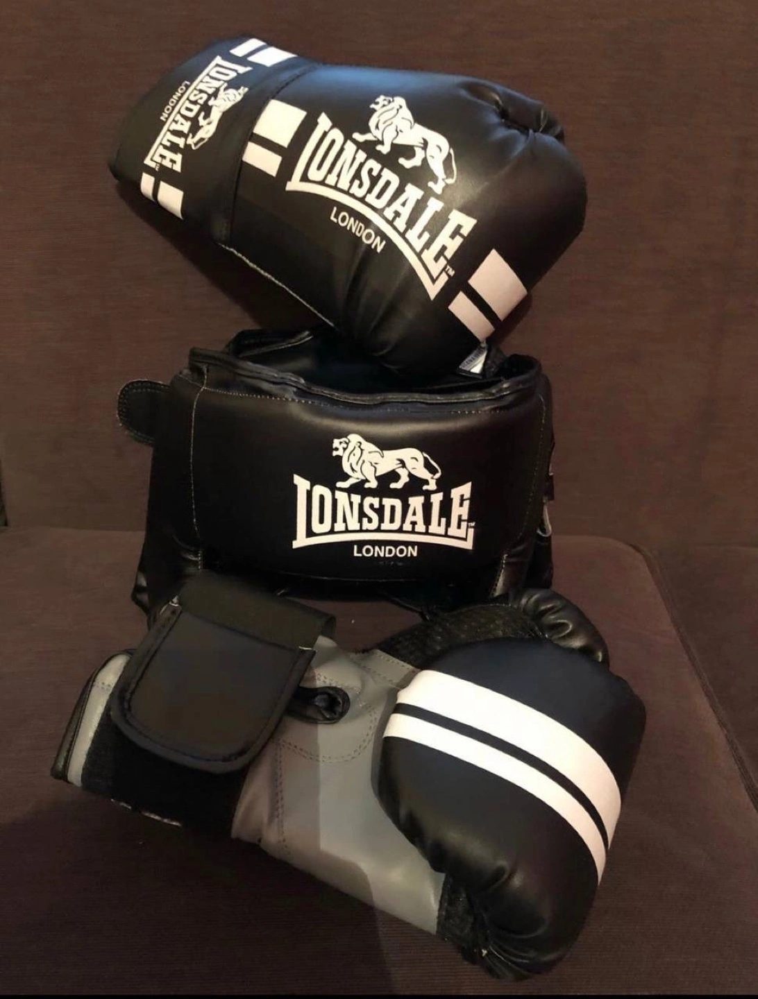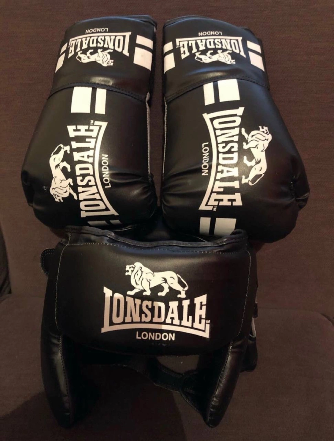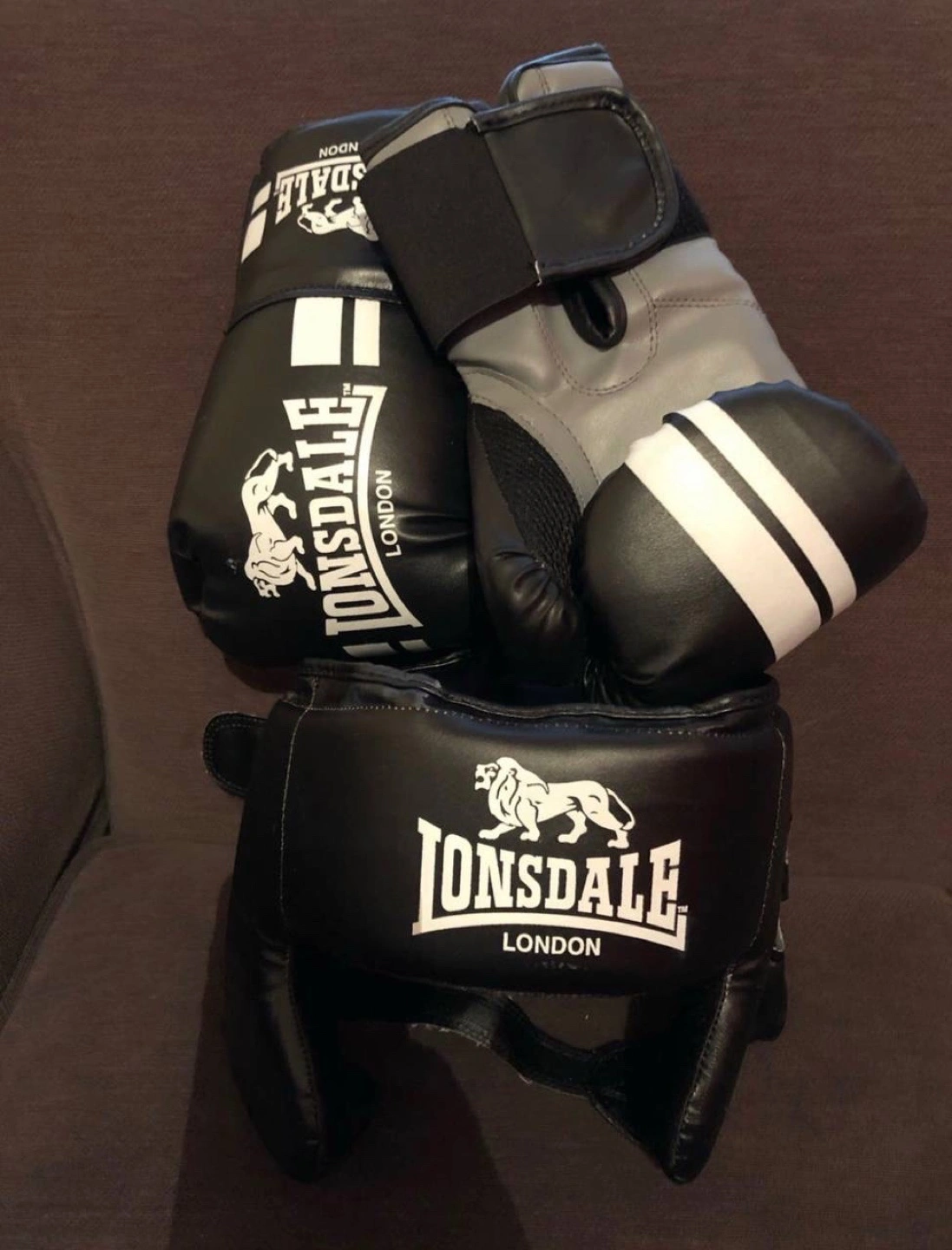 0 reviewsBoxing gloves and head guards in a perfect condition for £45 Youth Lonsdale boxing gloves and headguard. Black with white stripes. Good condition. Great for training.