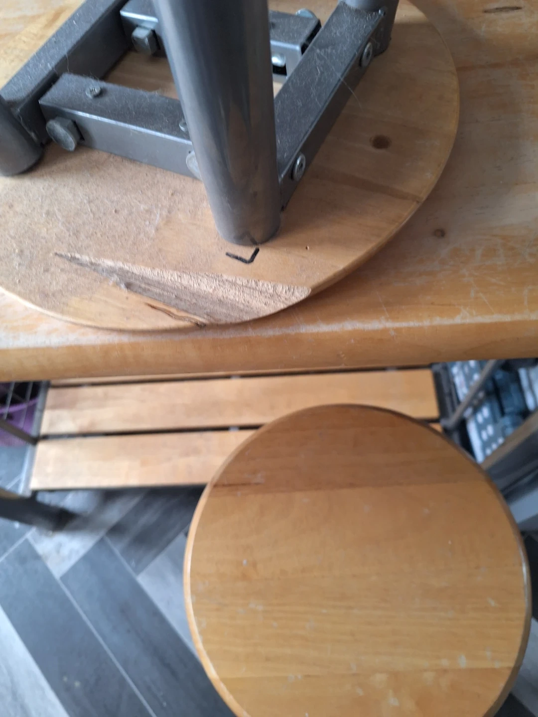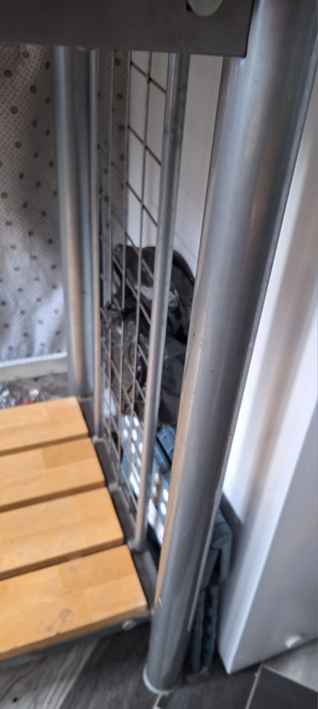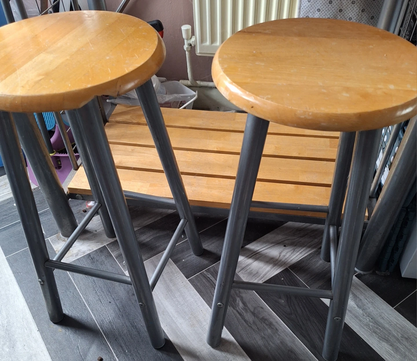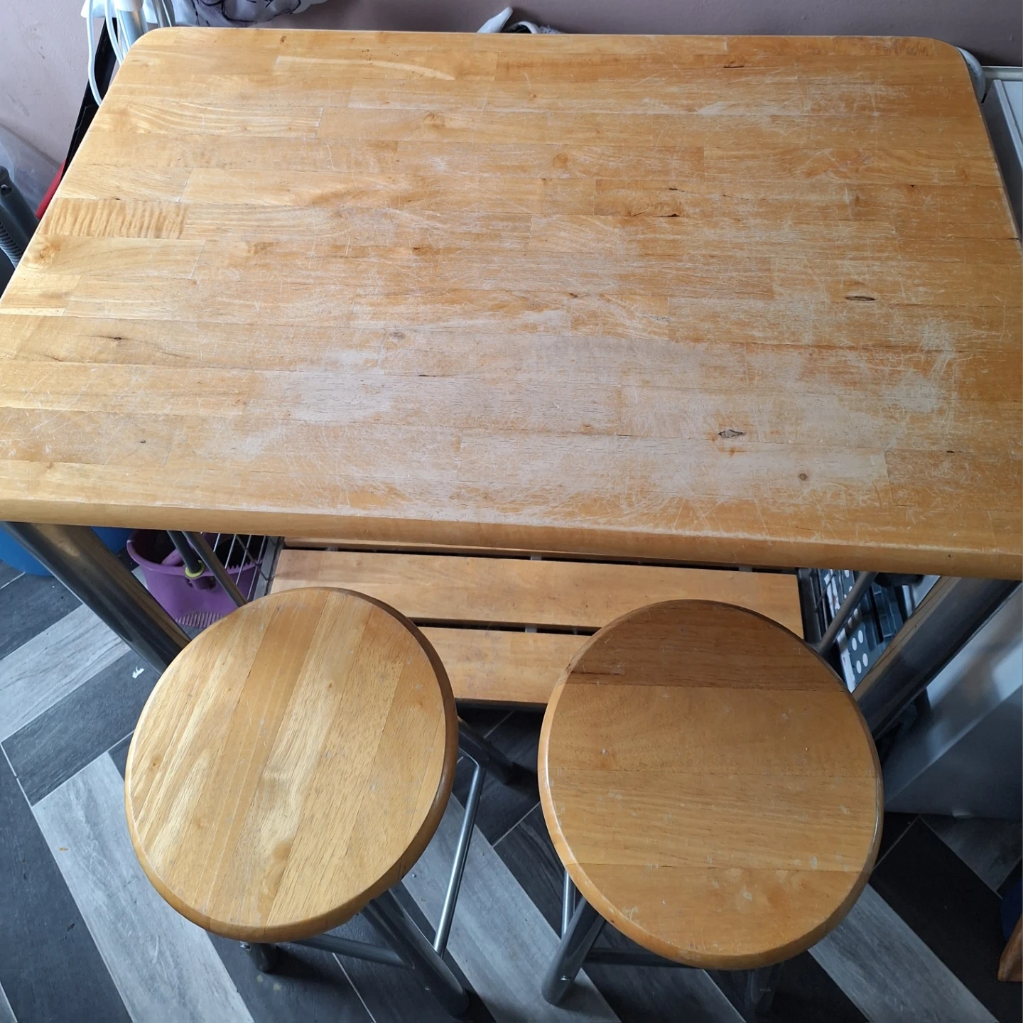8 reviewsThis is kitchen table/breakfast bar with 2 matching stools. I never got around to sanding and restaining it i had a tablecloth on it. Silver coloured legs on both the table and the stools. One stool has a lil chip in in underneath but can't see it when in use, the stools can be stored underneath the table which is where I mostly had them. Has a shelf underneath to put stools on or whatever else you want to use them for. The table has been taken apart so will fit in most cars. Pick up only in L6 area of Liverpool. I'm only getting rid as i've bought a new kitchen cabinet to take it's place as its just not getting used. Any questions please ask.