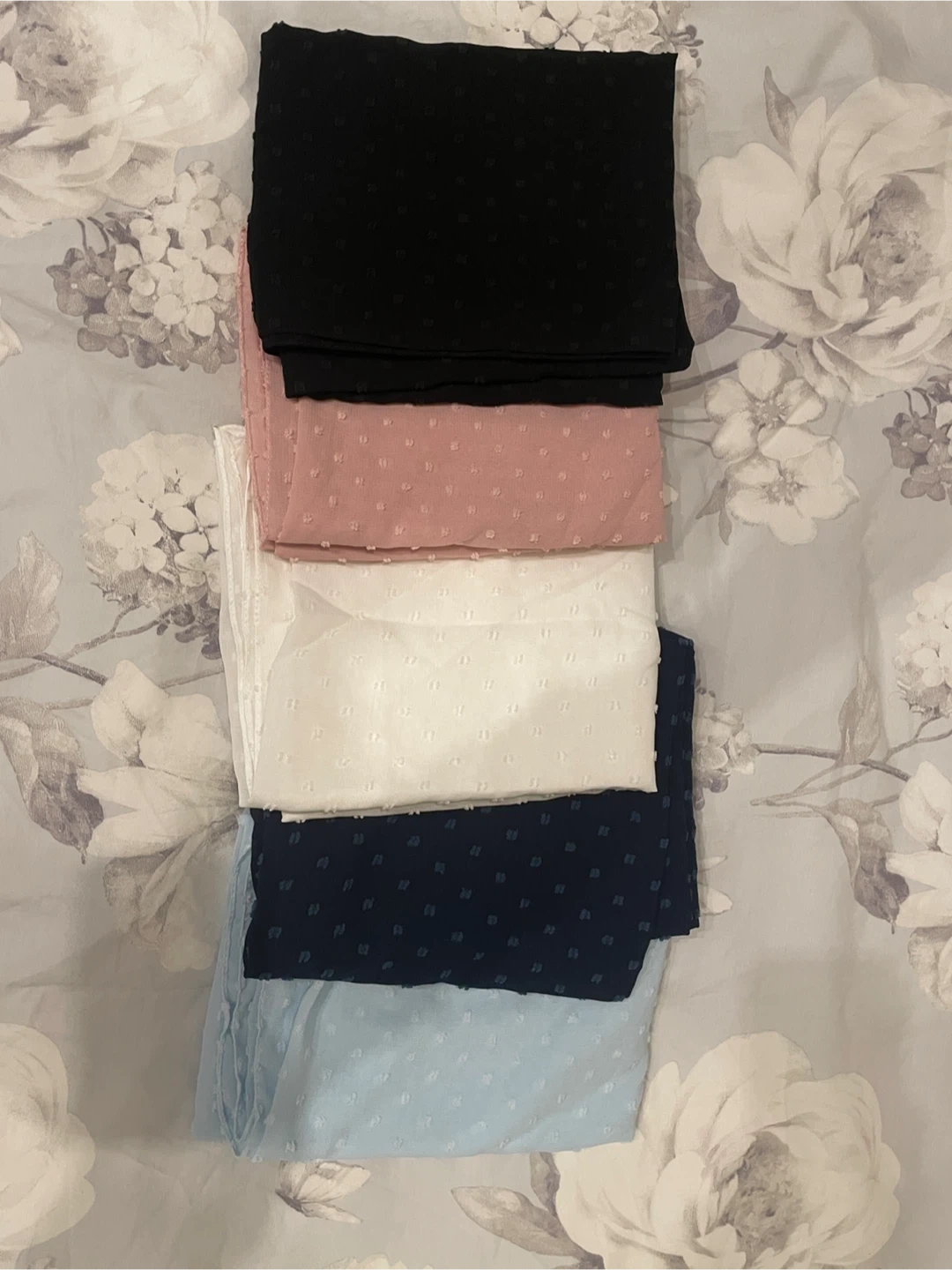 4 reviews5 chiffon scarves for £10 Each scarf for £2 Colors: baby blue, navy, white, pink and black. Measurements: L: 68 inch W: 28 inch