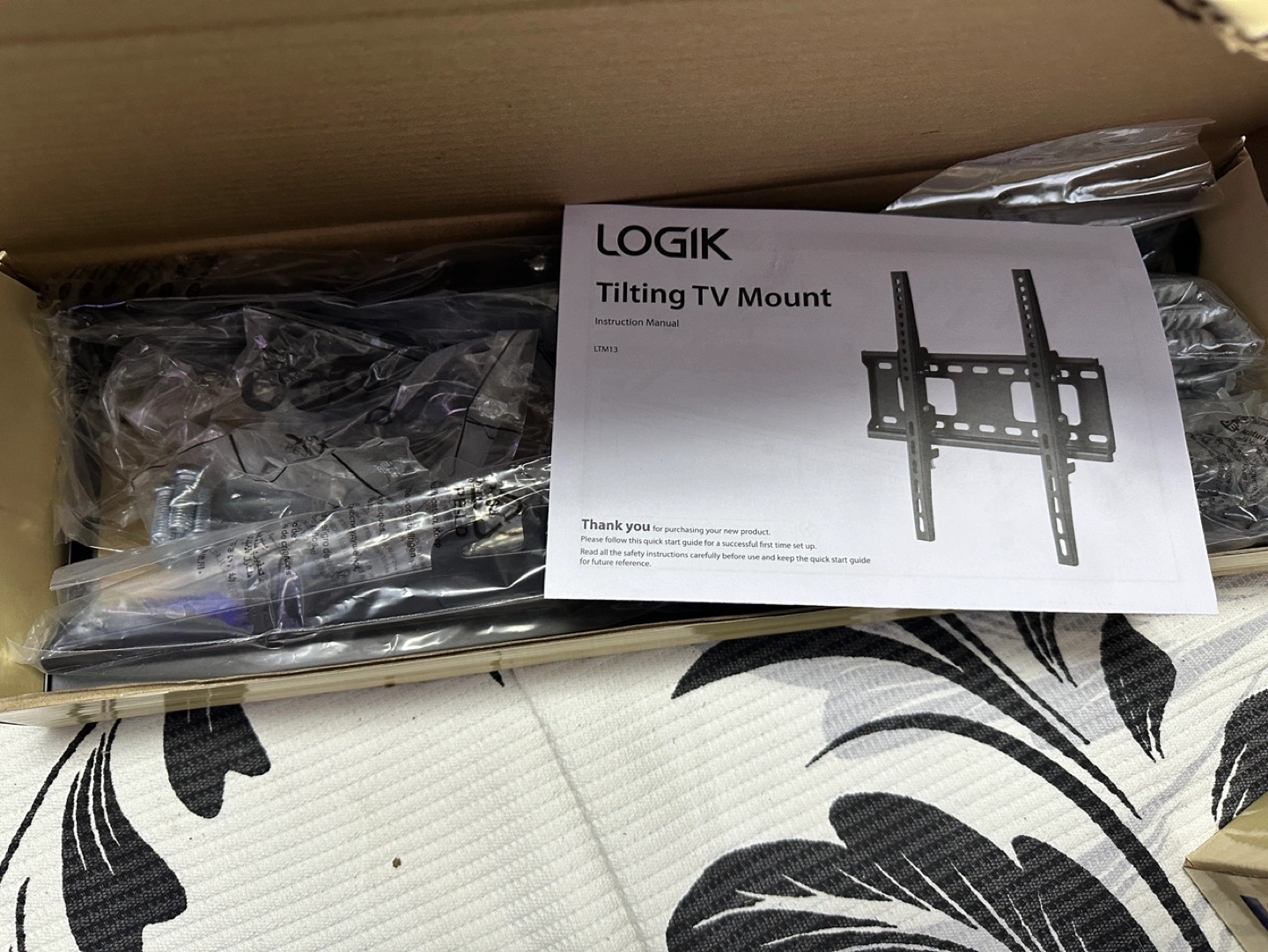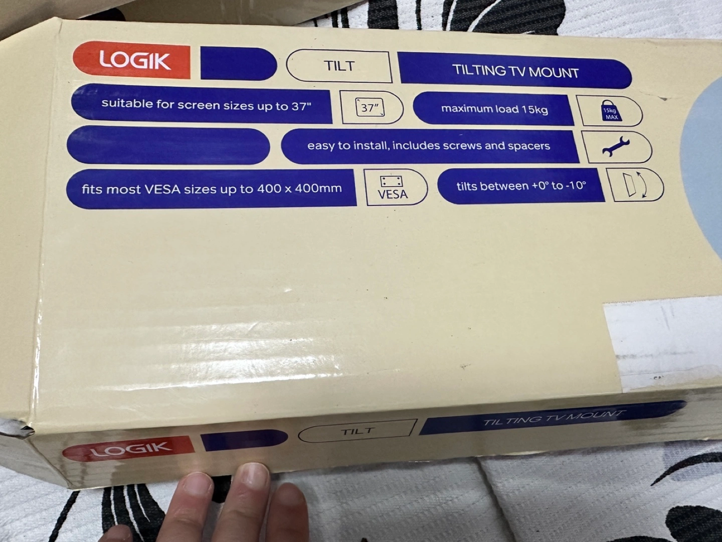 Show allTilting TV mount, suitable for screens up to 37 inches. Maximum load 15kg. Easy to install, includes screws and spacers.