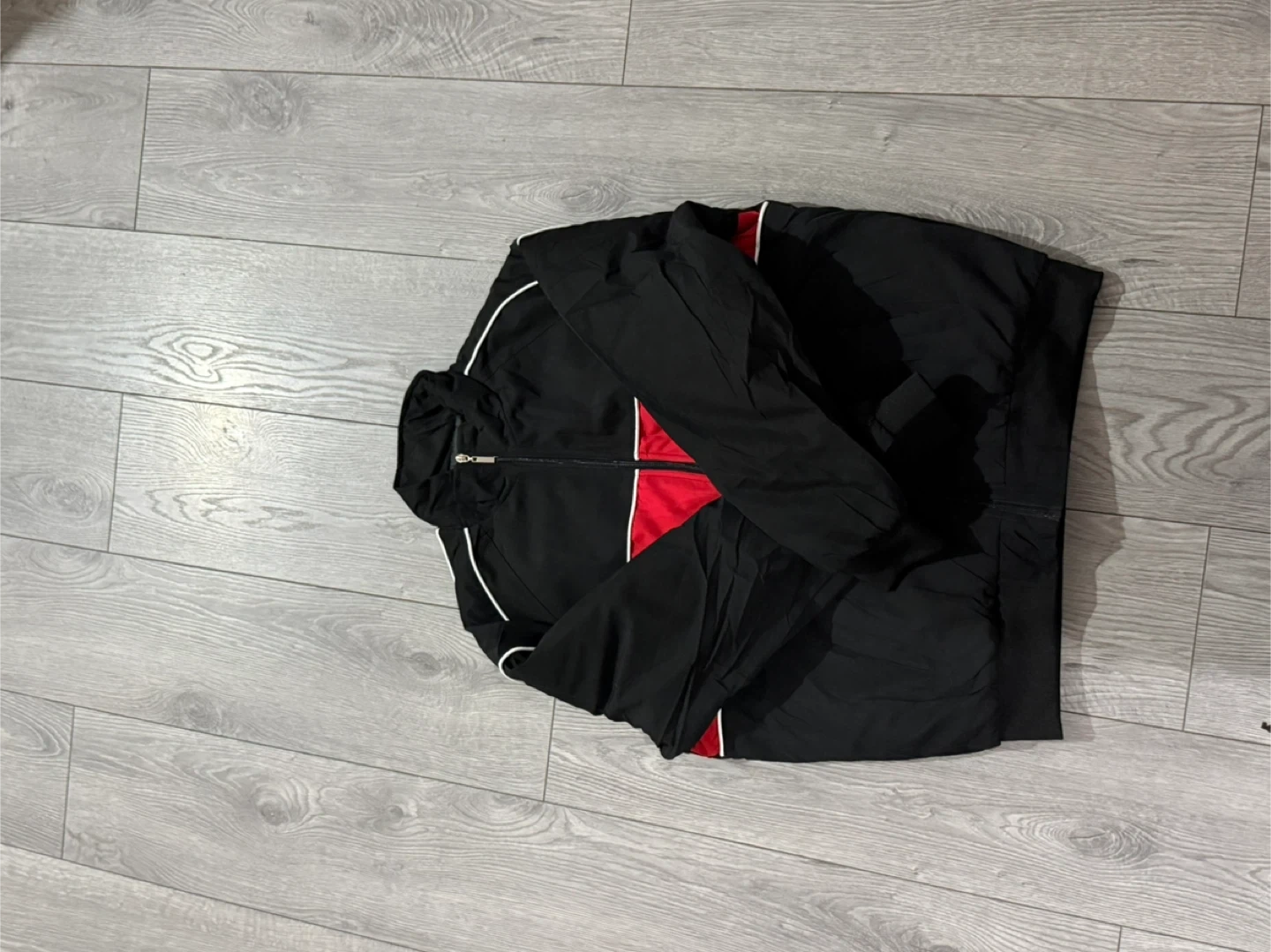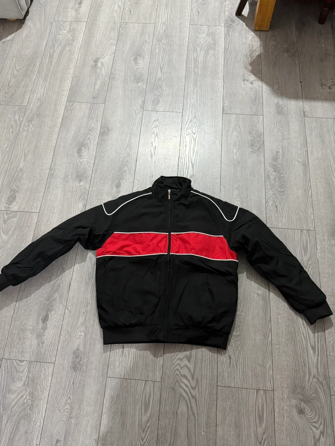 0 reviewsSelling a Manfinity track jacket in black and red. It's a size small and made in China. The jacket is made of 100% polyester.