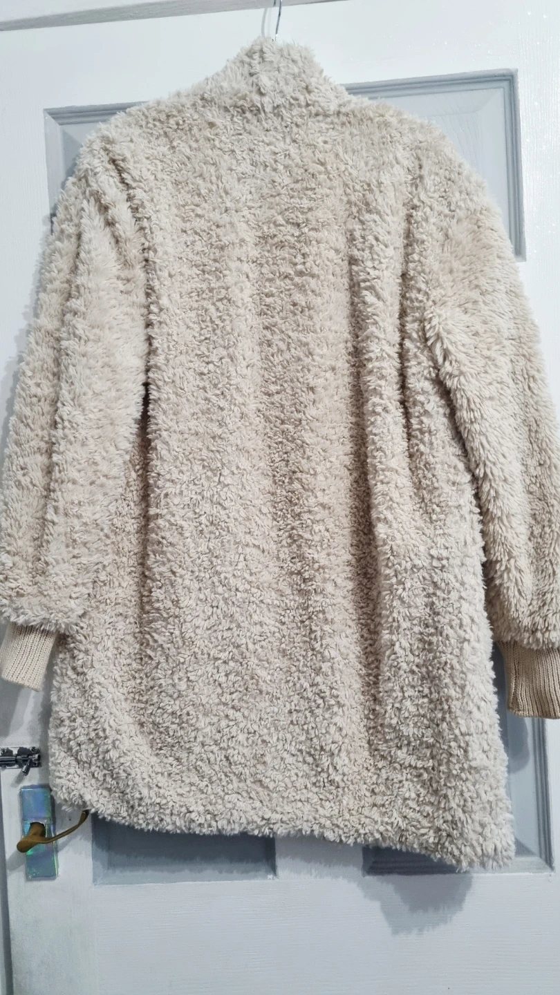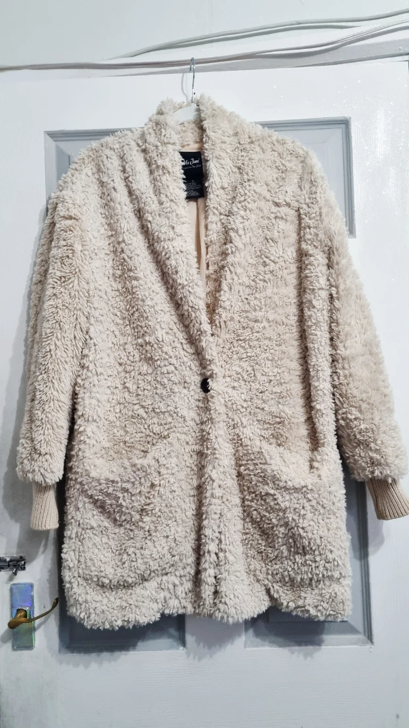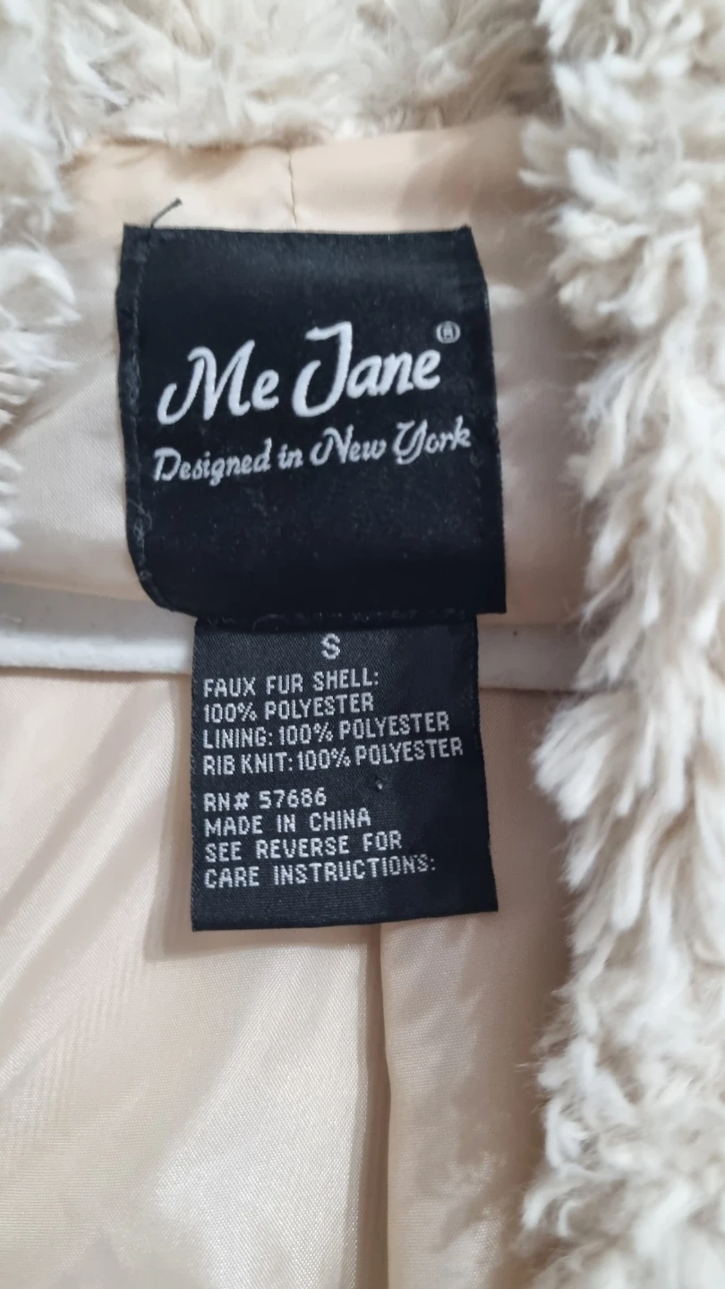 24 reviewsHere's a lovely Me Jane faux fur jacket in a cream colour. It is a size 12 although label says small.and made of 100% polyester for both the shell and lining. The rib knit is also 100% polyester. It's in great condition and ready for a new home