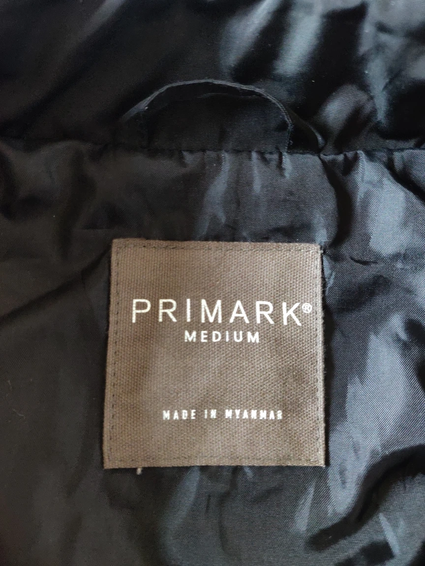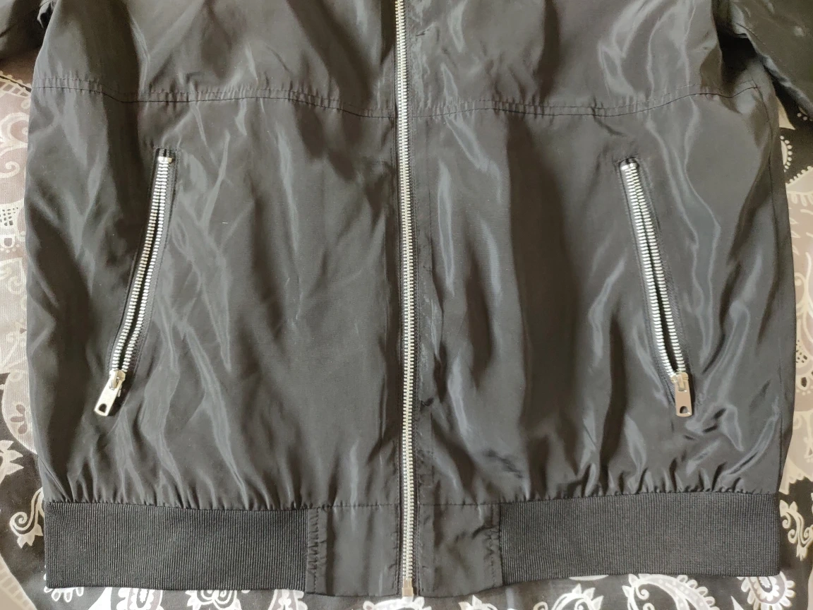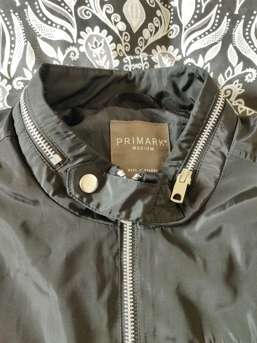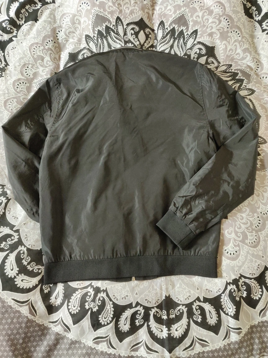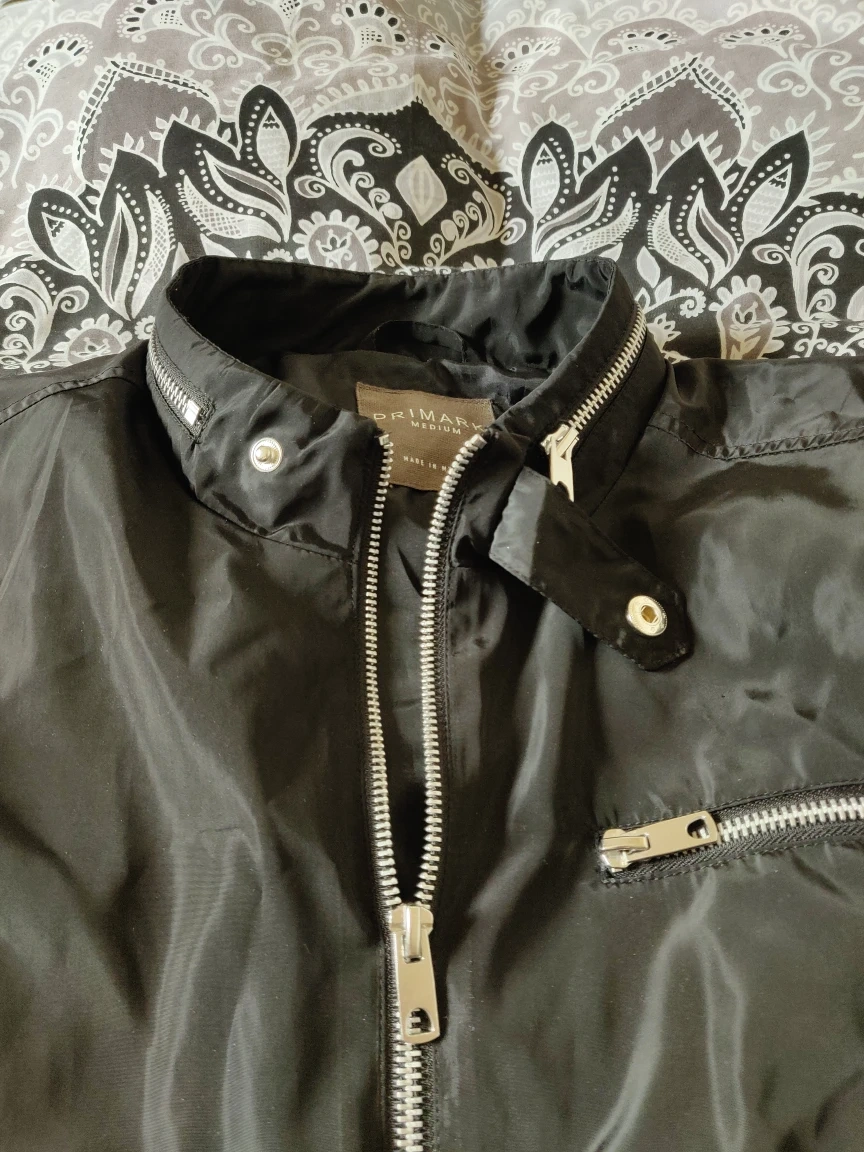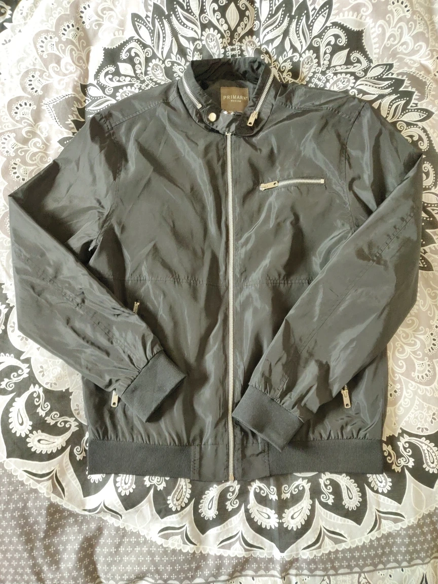 1 reviewBlack bomber jacket for men bought in a Primark store. It has been barely worn so it is in excellent condition. Elastic material at the waist and wrists. There are 2 slash and 1 welt pocket with zippers. The closure is made up of a full zipper and a collar button. The back zipper at the collar is just decorative, it DOES NOT hold a hoodie in there. Size M. 100% polyester.