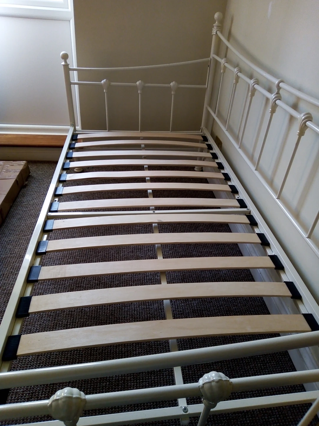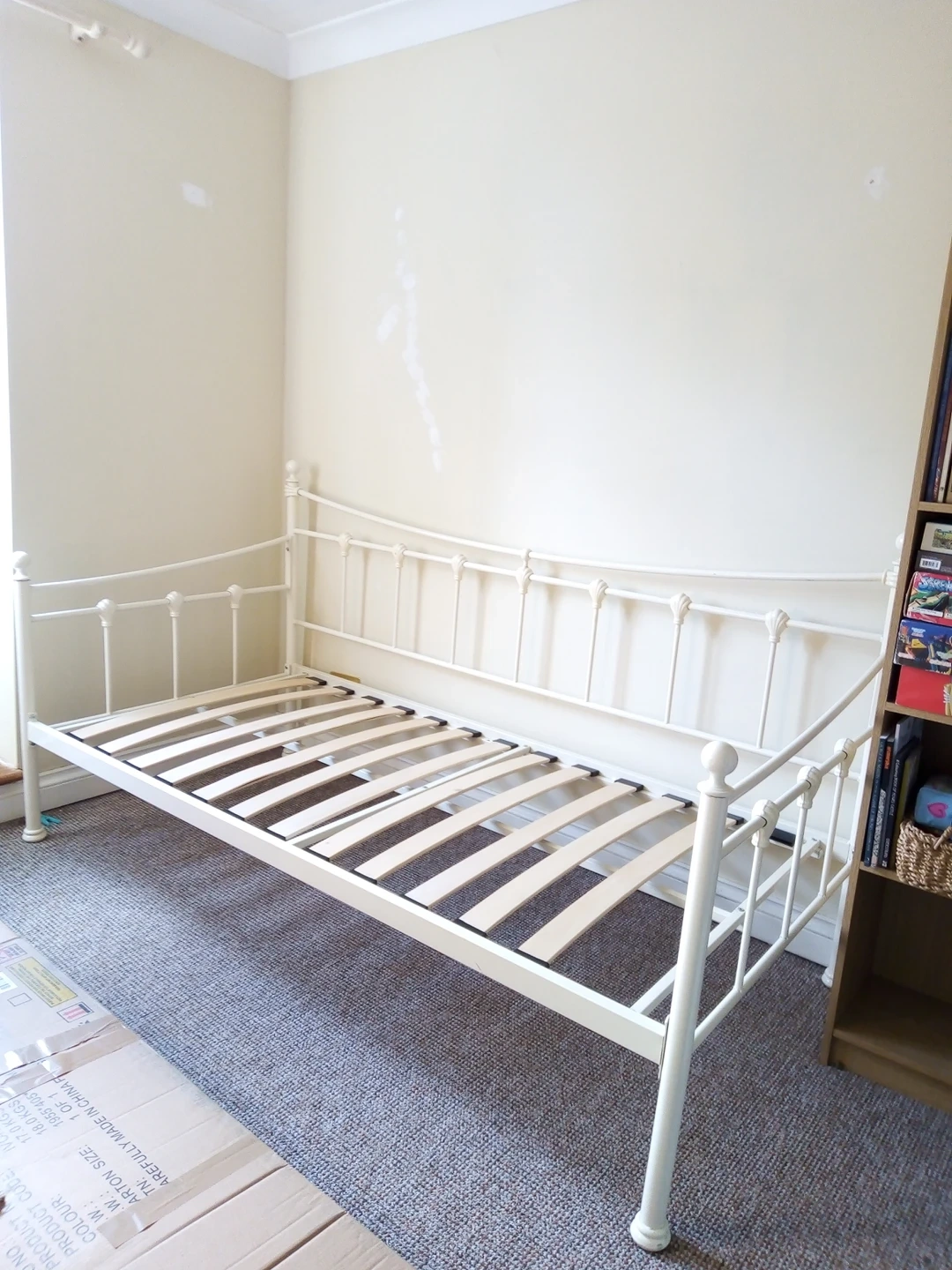 1 reviewFor sale: Cream metal day bed, similar to IKEA design with under bed Trundle bed. Day bed has one slat missing but other slats are sturdy so does not cause a problem. Trundle bed is BNIB, never assembled. Day bed used by visiting grandchild a few times. Measurements: length=196cm width=96cm standard single mattress fits each bed or large double if beds are put together.