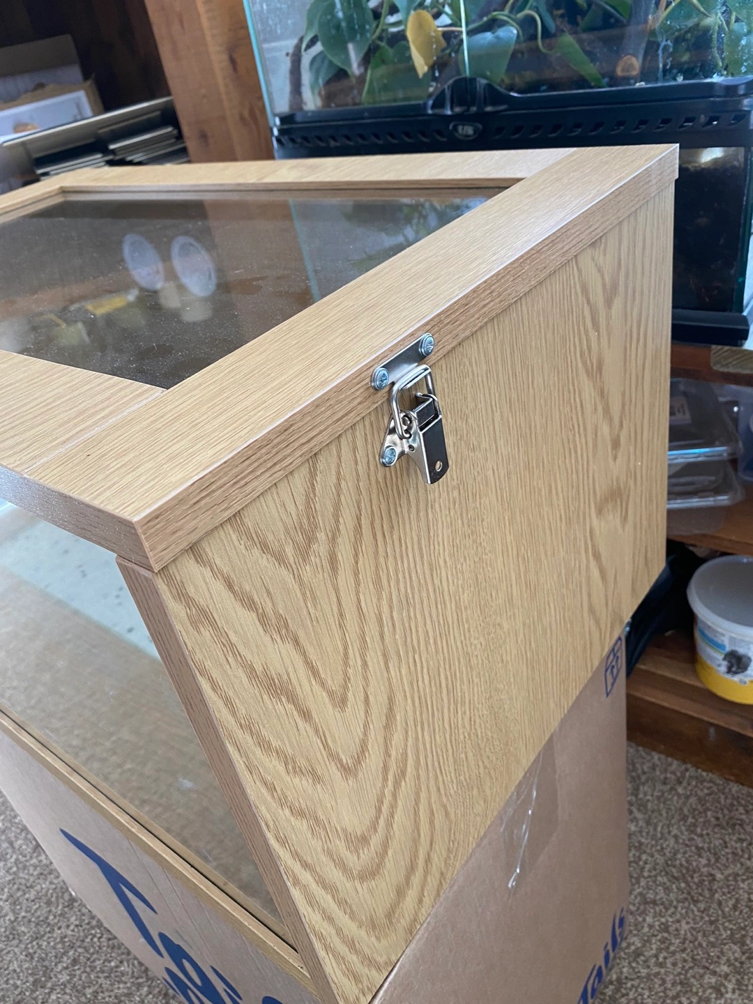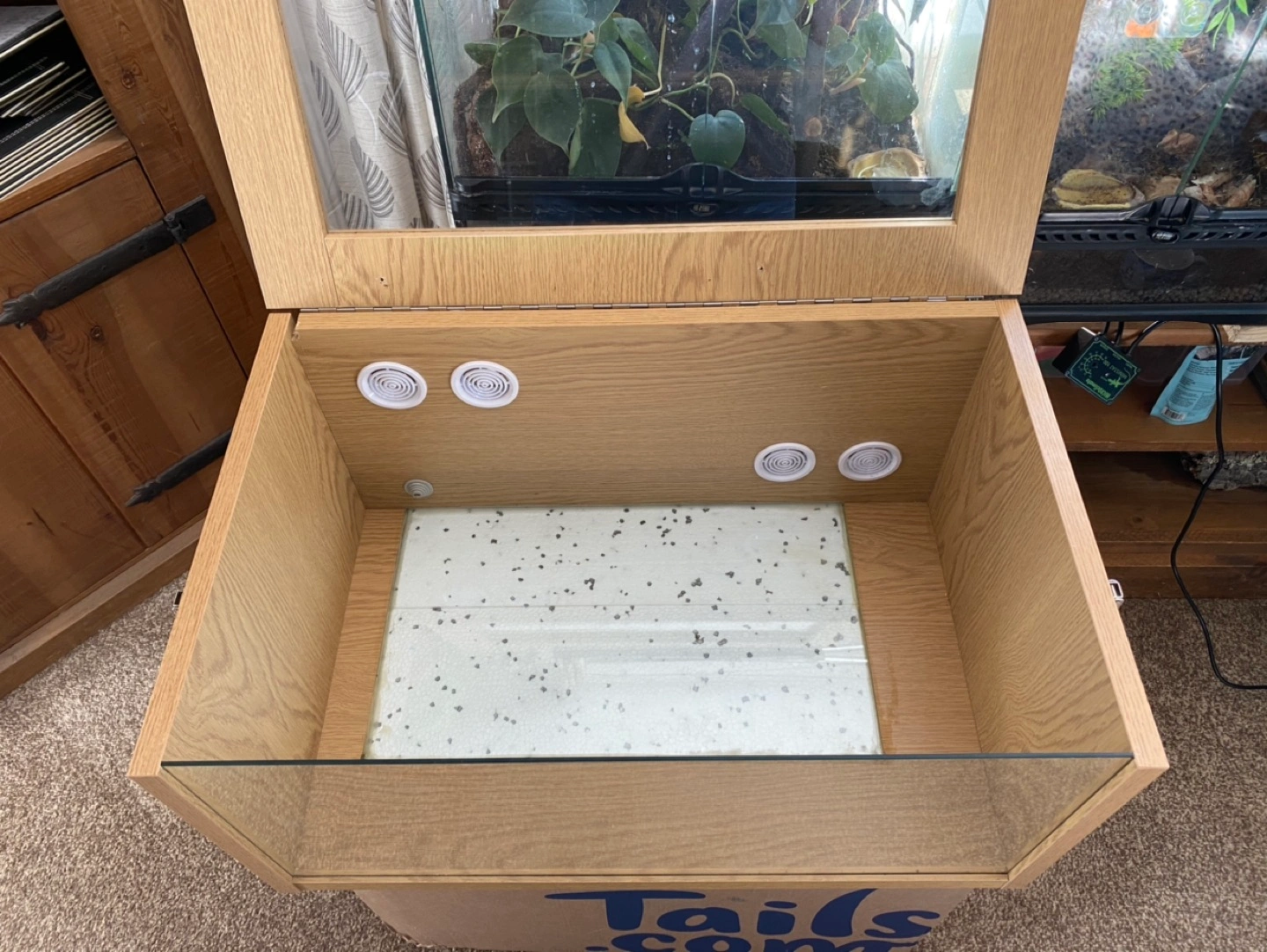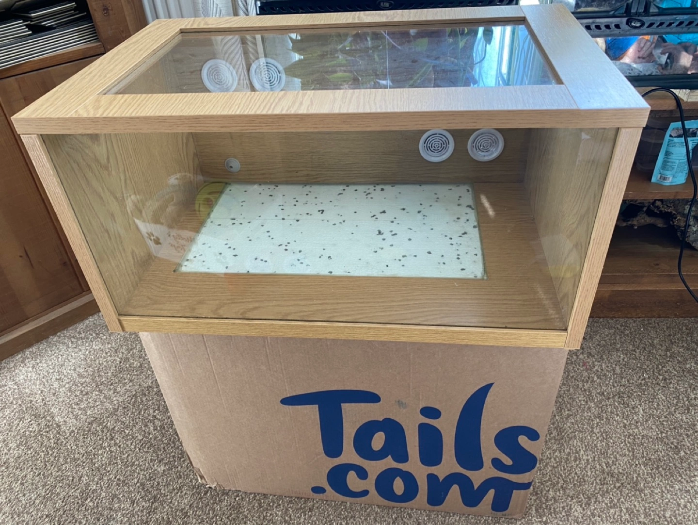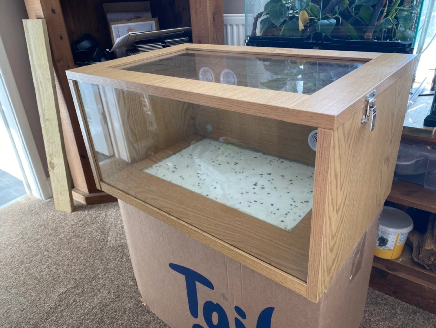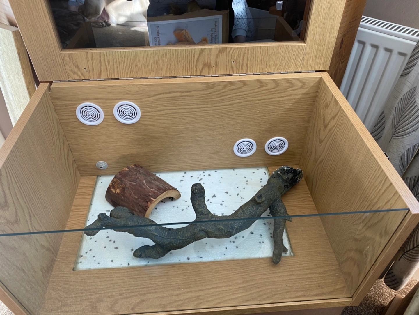 4 reviewsMonkfield Terrarium Wooden and glass Terrarium in oak effect. 24” long by 12” high by 15” deep. Hinged lid with two secure fasteners on the sides. Four air vents positioned on back panel to aid in a good air flow and ventilation and rubber Gromit for thermostat sensor (thermostat not included) so no need for any drilling. A double layered glass base makes it easy to install a heat mat and an insulating layer of polystyrene below the glass base ensures the heat is projected into the Terrarium, (heat mat not included). Ideal for geckos, young snakes or any reptile that lives in a dry habitat. Includes a wooden hide and artificial branch. £45.00