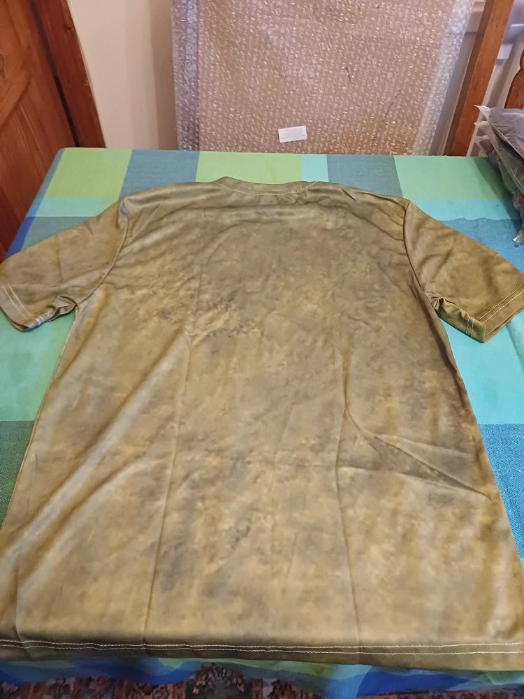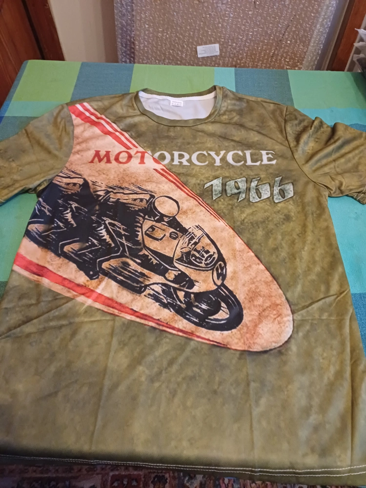 243 reviewsGreen T-shirt with a printed motorcycle image on the front. The print has red detailing. There is no print on the back of the t-shirt. The T-shirt is a size SMALL The t-shirt is made from a soft material that is comfortable to wear. It would make a great gift for any motorcycle enthusiast.