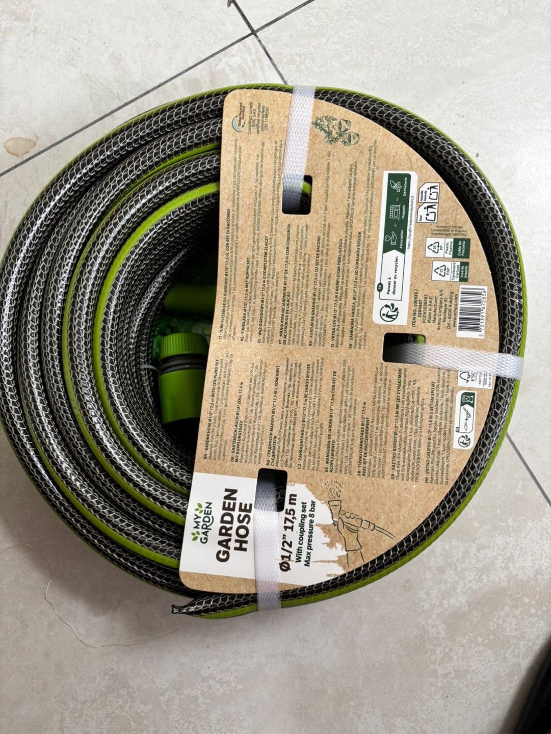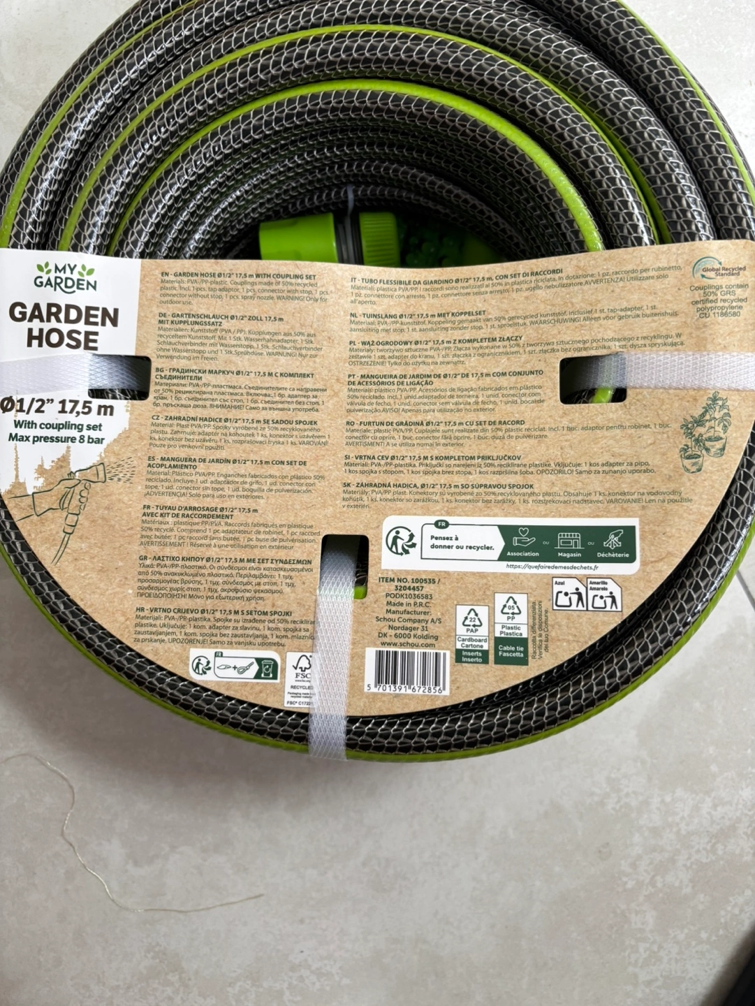 1 reviewSelling a My Garden garden hose, 1/2" diameter and 17.5 metres long. It comes with a coupling set and is suitable for a maximum pressure of 8 bar. The packaging indicates that the components contain recycled certified recycled material. Perfect for keeping your garden watered!