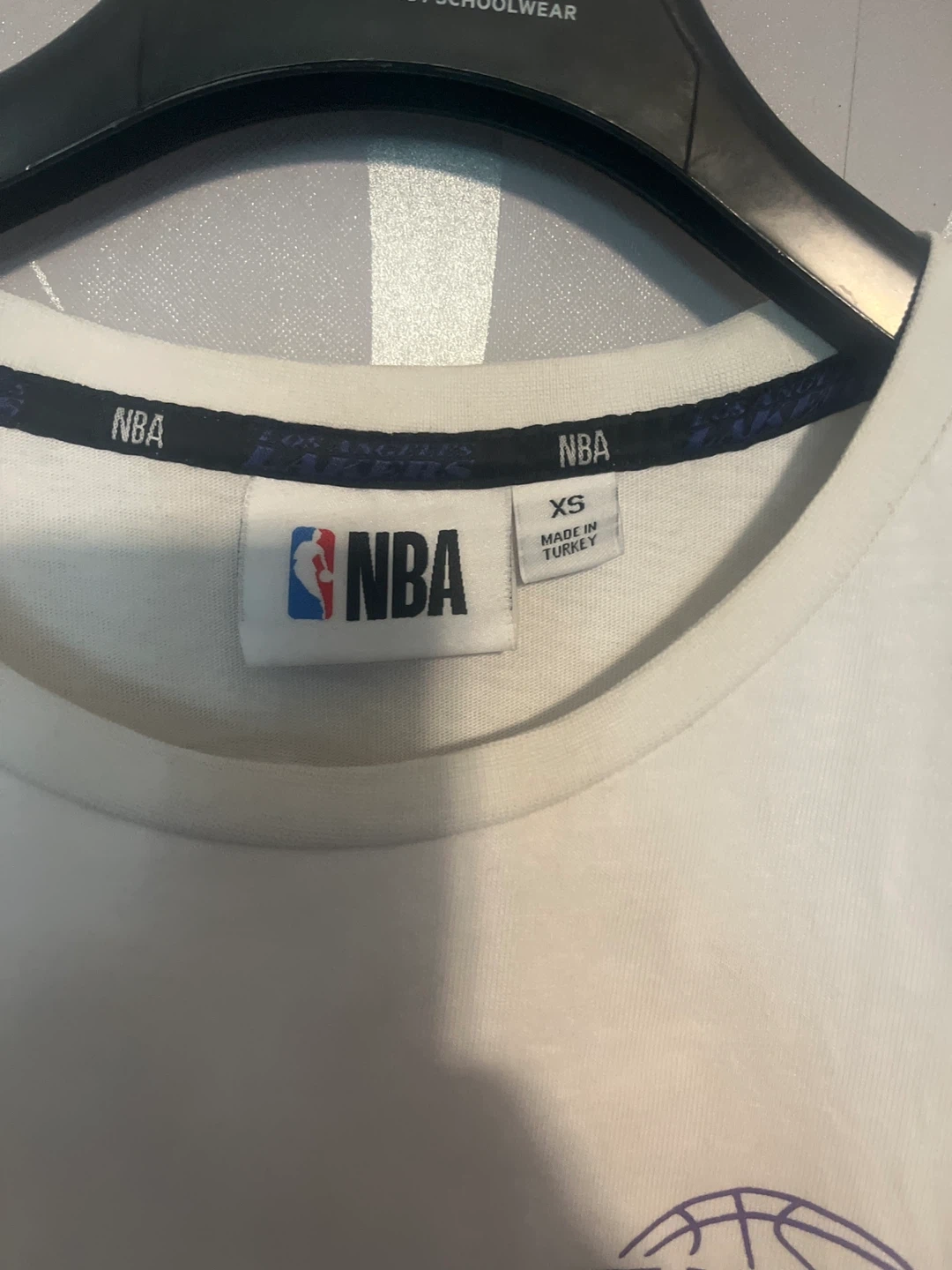 2 reviewsHere's a Los Angeles Lakers t-shirt featuring LeBron James. It's an official NBA item and is a size XS. The shirt is white with purple and gold accents, showcasing the Lakers logo and James' number 6 on the back