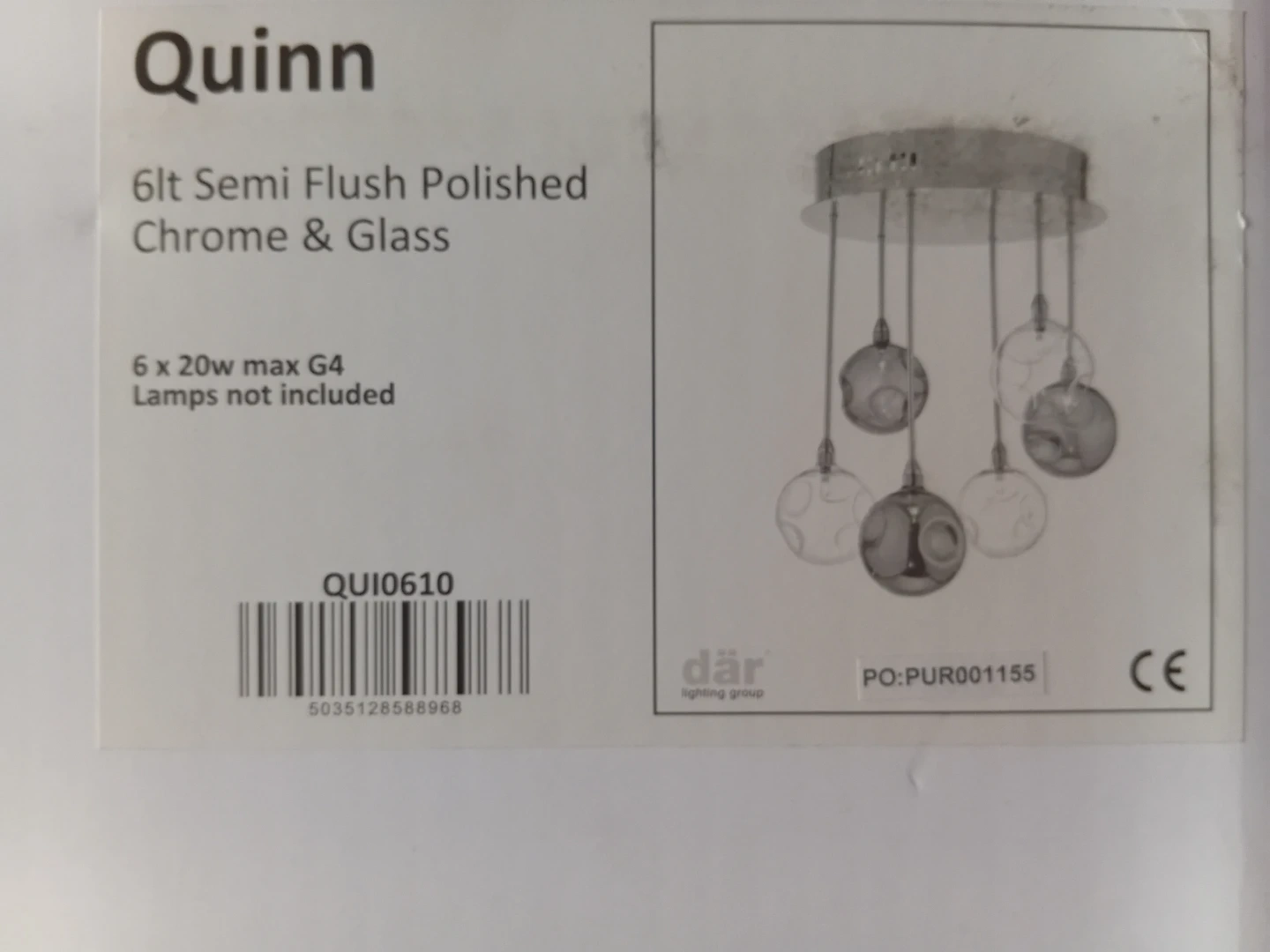 16 reviewsNEW. Dar Semi Flush Ceiling Light. QU10610 Quinn. 6 Lights. Smoked/Clear. Hand Blown Glass. Polished Chrome. Approximate Size 38cm High x 30cm Diameter. Requires 6x 20w G4 Capsule Bulbs. (Not Provided). Never been out of the box. Only opened it to take photo's. Paid £138. Asking less than half price. Collection Preferred from B90 4XA. Postage costs would be extra. No Returns or Refunds. Prompt collection advised as item remains For Sale till payment is received.