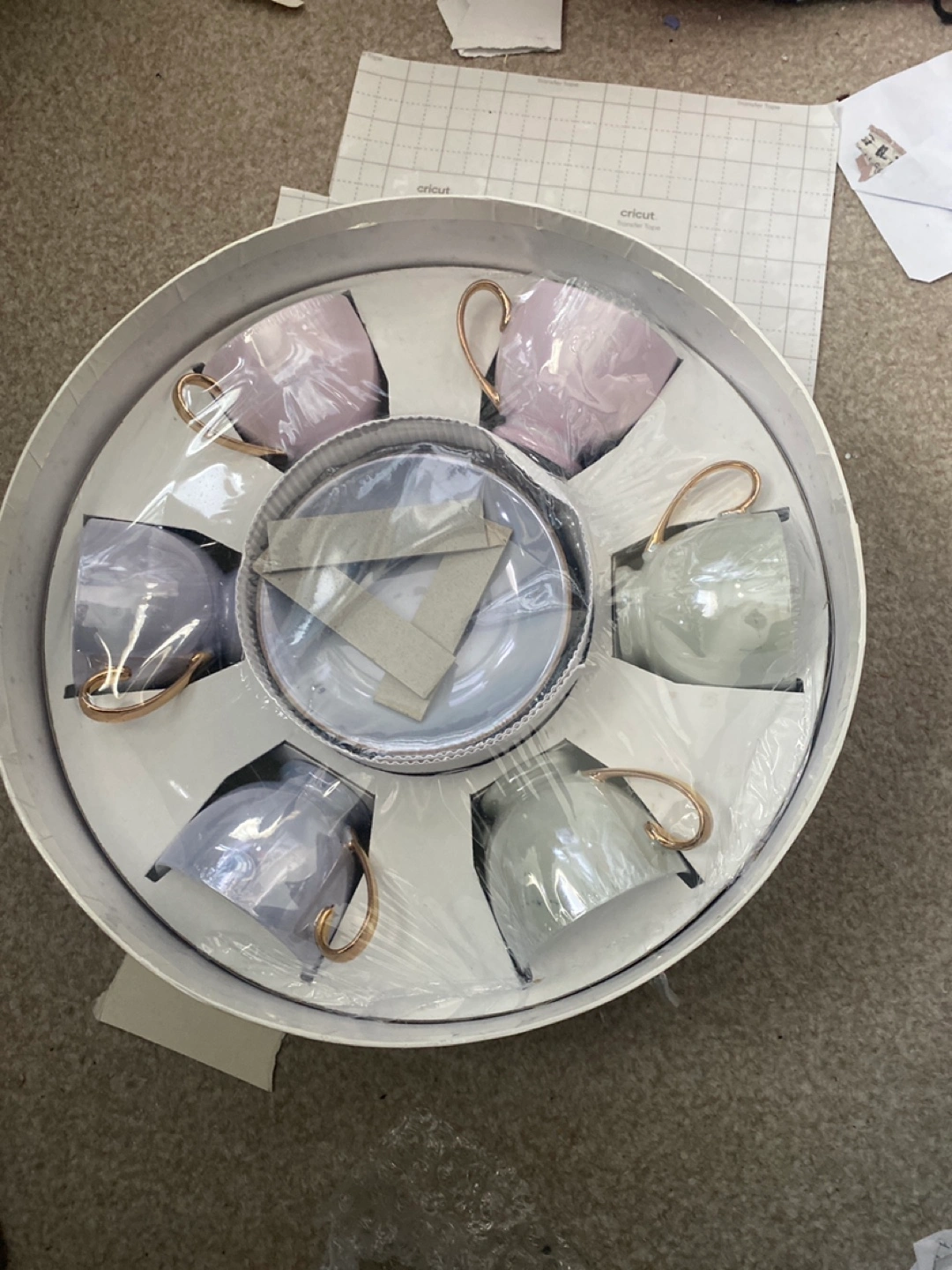 33 reviewsSelling a brand new tea /coffee cup set, complete with a box The set includes six cups in pastel shades and matching saucers. It's all neatly packaged in its original box, making it a lovely gift or a treat for yourself the colours are iridescent in pale blue green and lilac With carry handle
