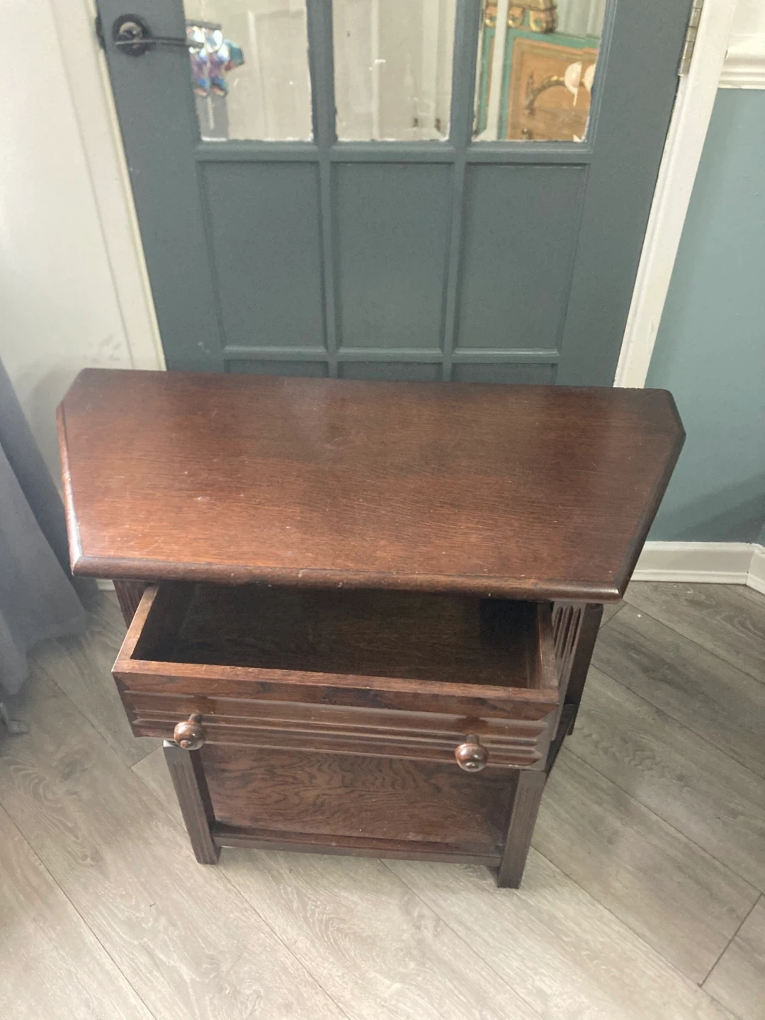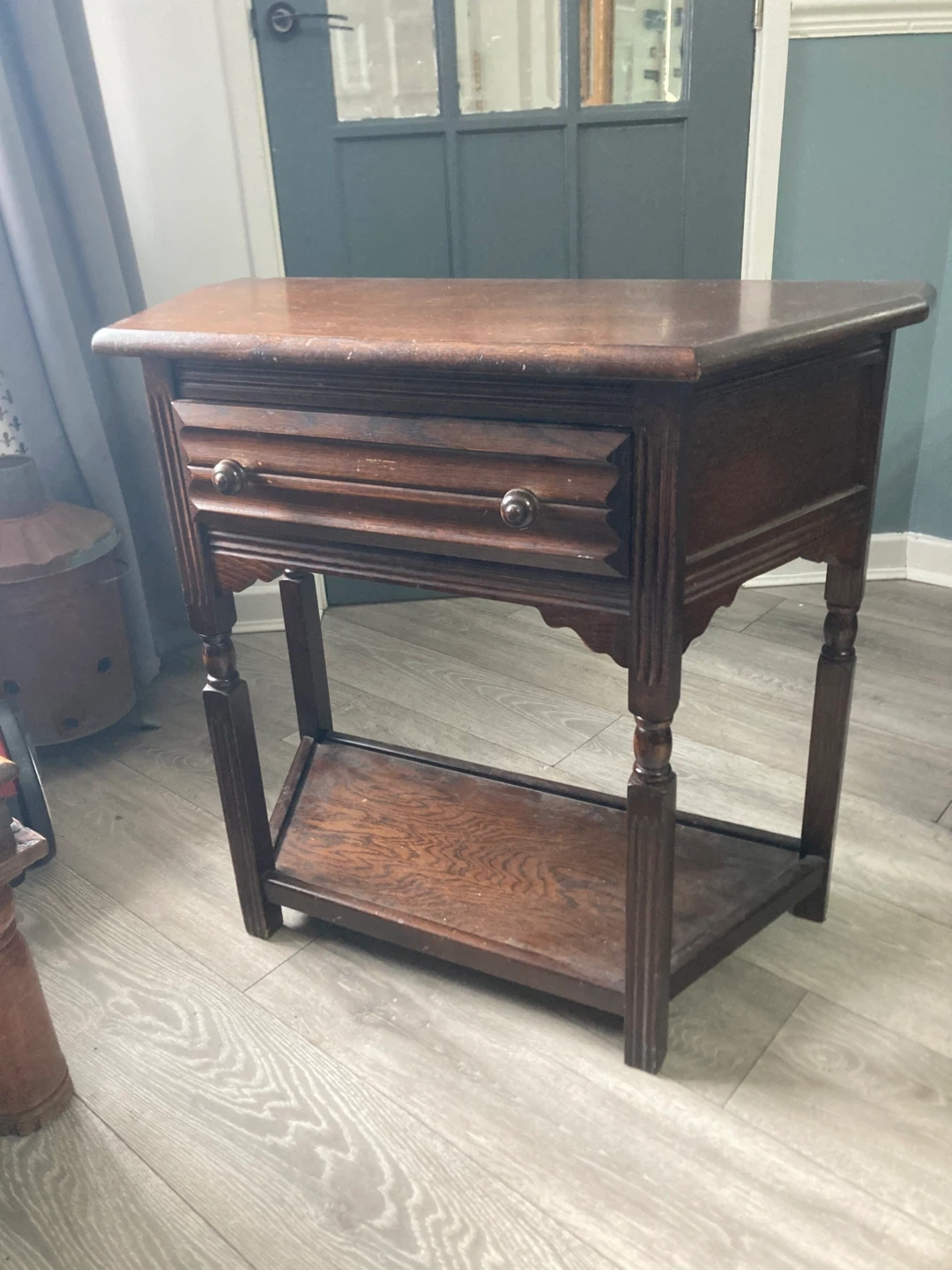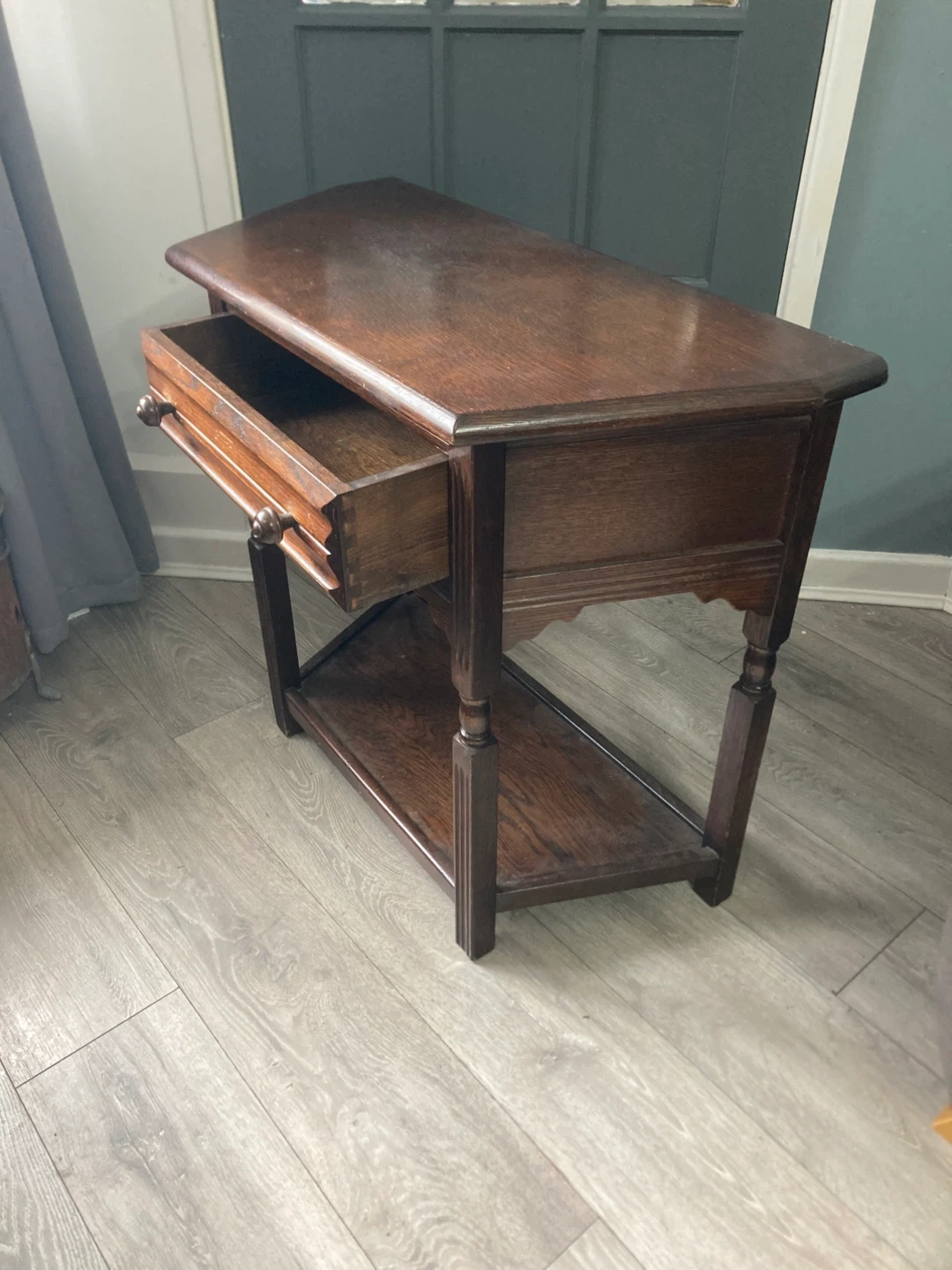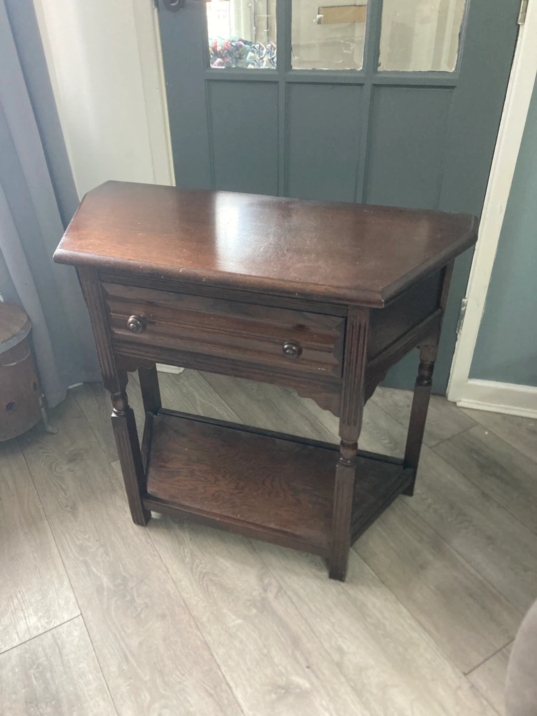 334 reviewsA lovely dark antique wood side table, perfect for a hallway or living room. It features a handy drawer and a shelf underneath for extra storage. It's in good condition and ready for a new home!