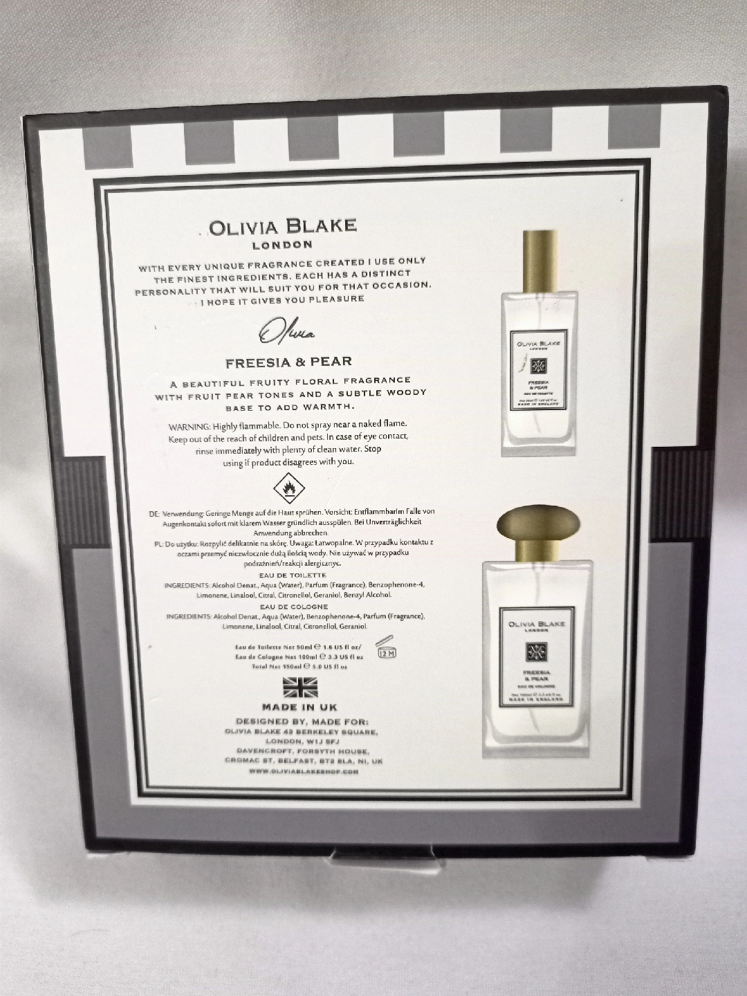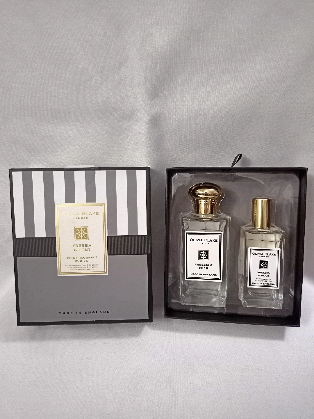 141 reviewsOLIVIA BLAKE LONDON FINE FRAGRANCE DUO SET FREESIA & PEAR EAU DE COLOGNE 100ml & EAU DE TOILETTE 50ml UNUSED PRACTICALLY AS NEW CONDITION.