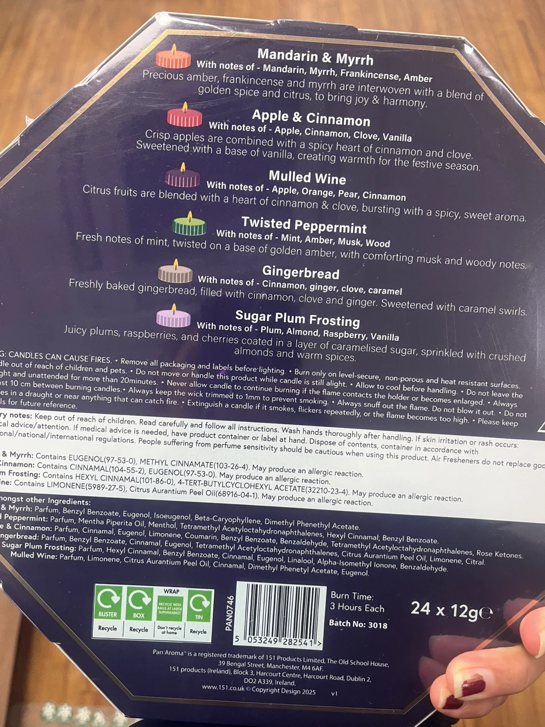 2 reviewsSelling a Pan Aroma advent calendar containing 24 scented tealights. Scents include Mandarin & Myrrh, Apple & Cinnamon, Mulled Wine, Twisted Peppermint, Gingerbread, and Sugar Plum Frosting. A lovely way to count down to Christmas!