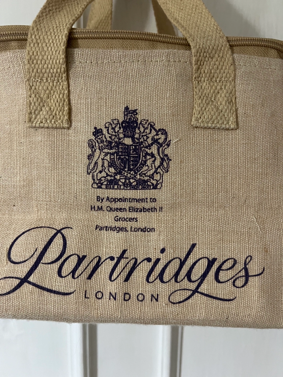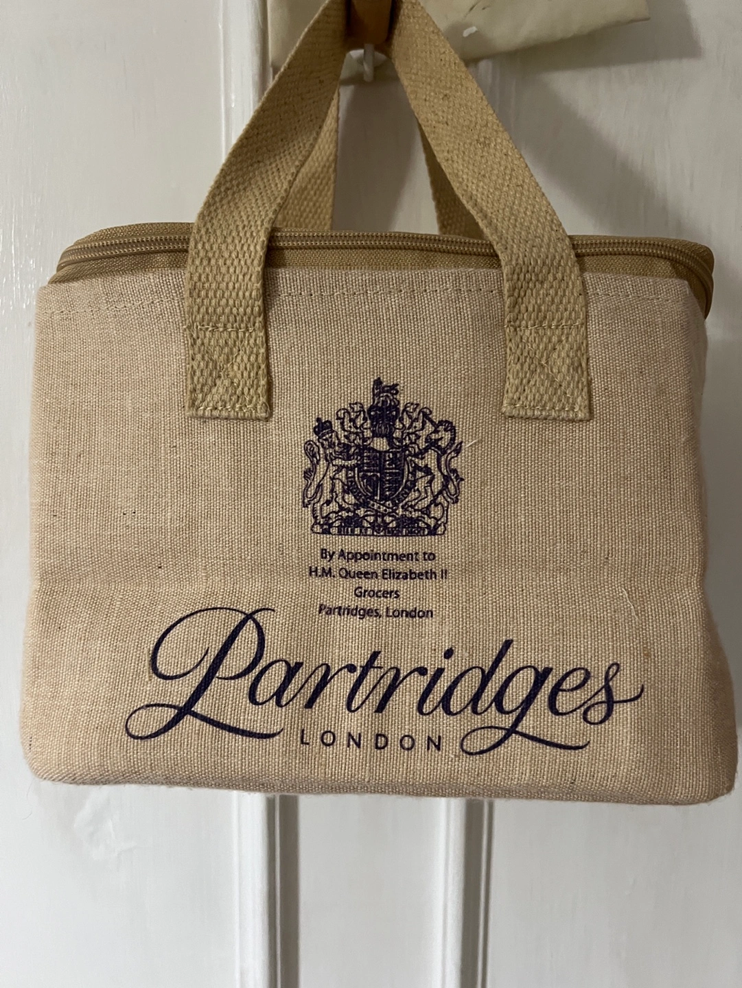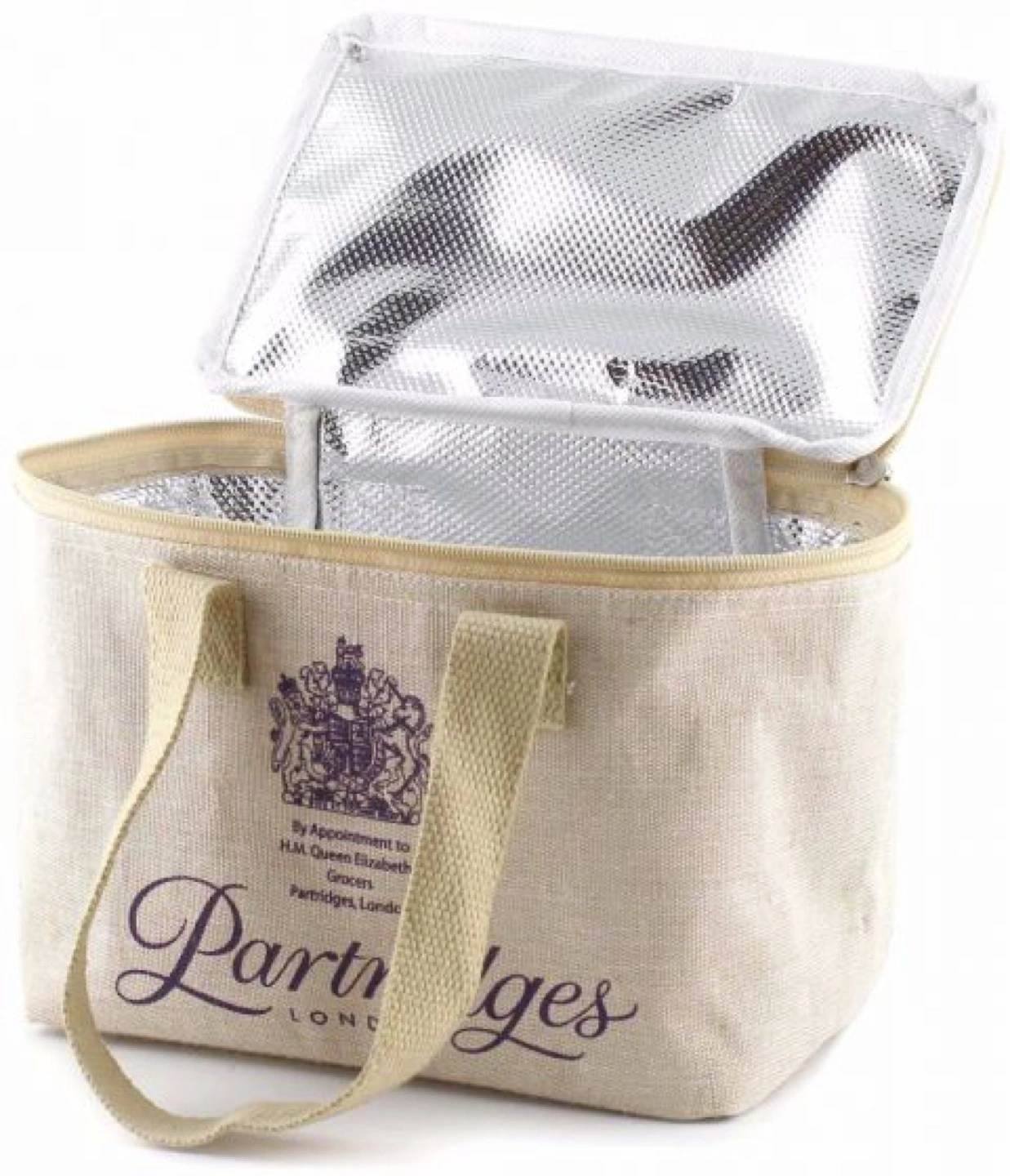 Small insulated shopping bag. Beige fabric with Partridges London branding. Zip closure and two short handles. Ideal for picnics or keeping groceries cool.