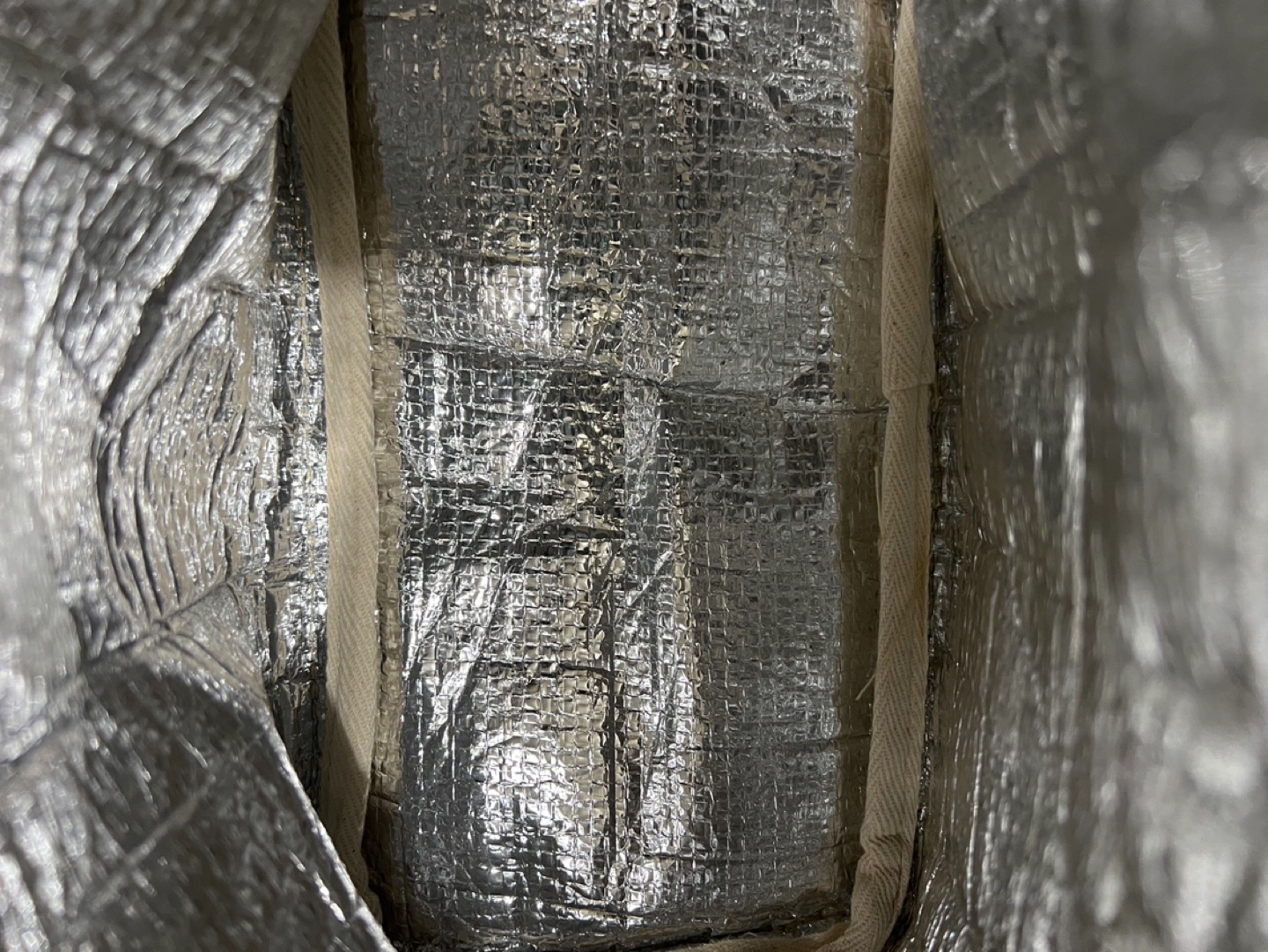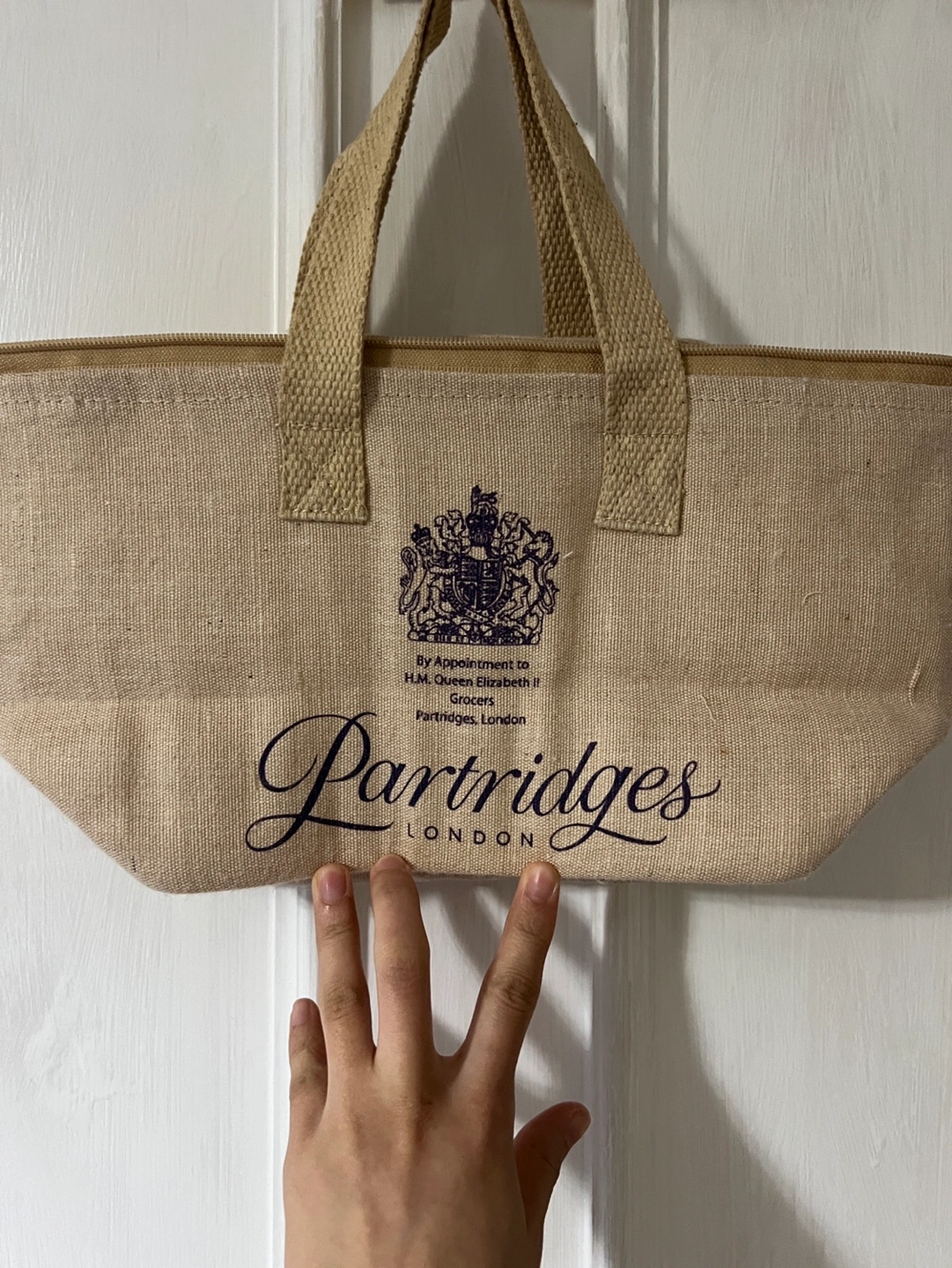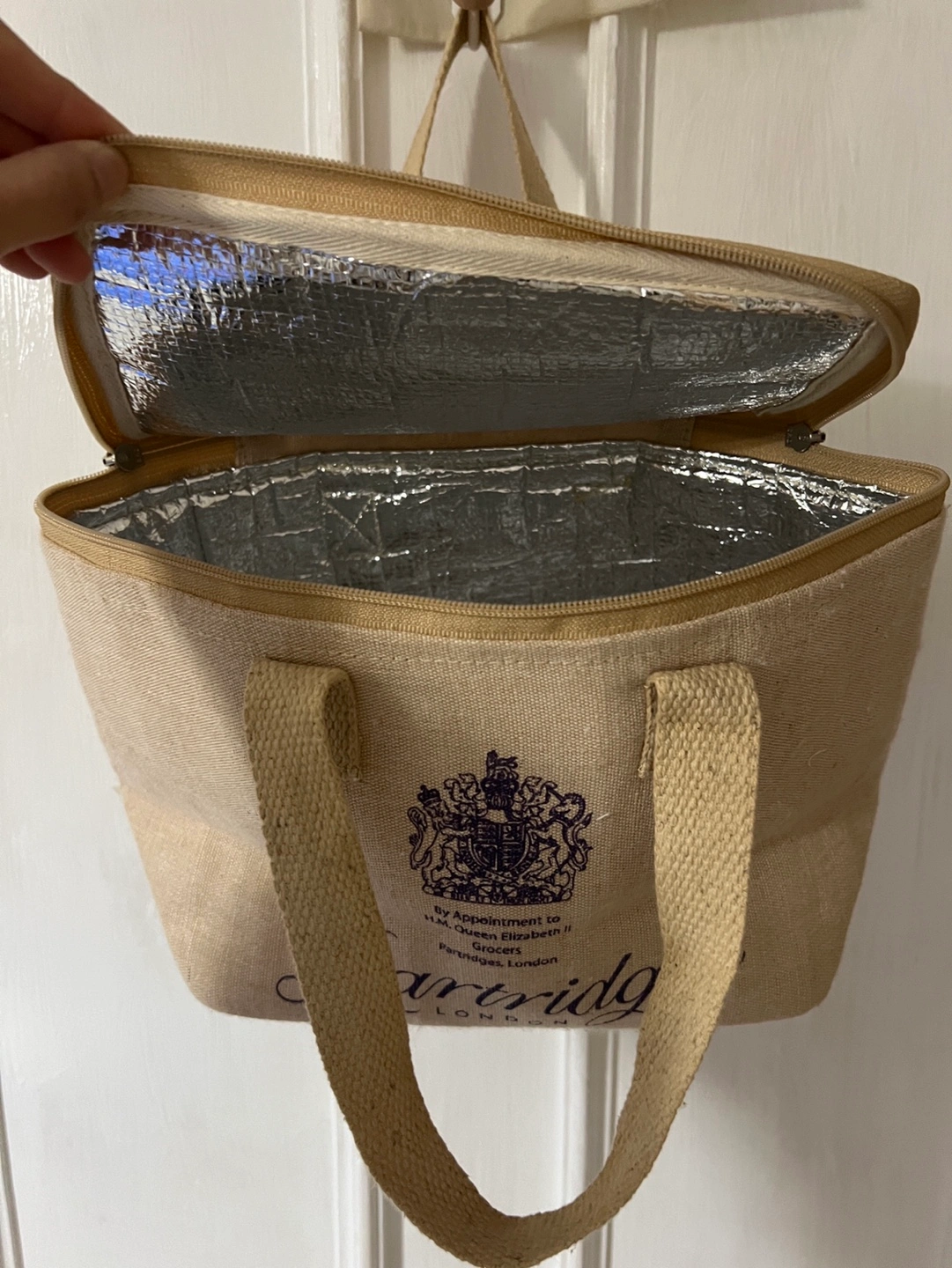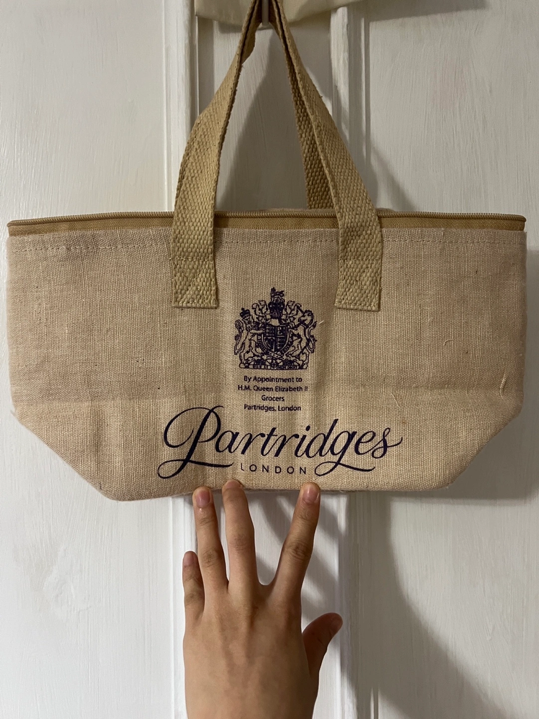 Small insulated shopping bag. Beige fabric with Partridges London branding. Zip closure and two short handles. Ideal for picnics or keeping groceries cool.