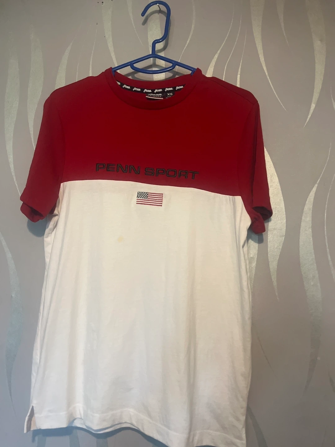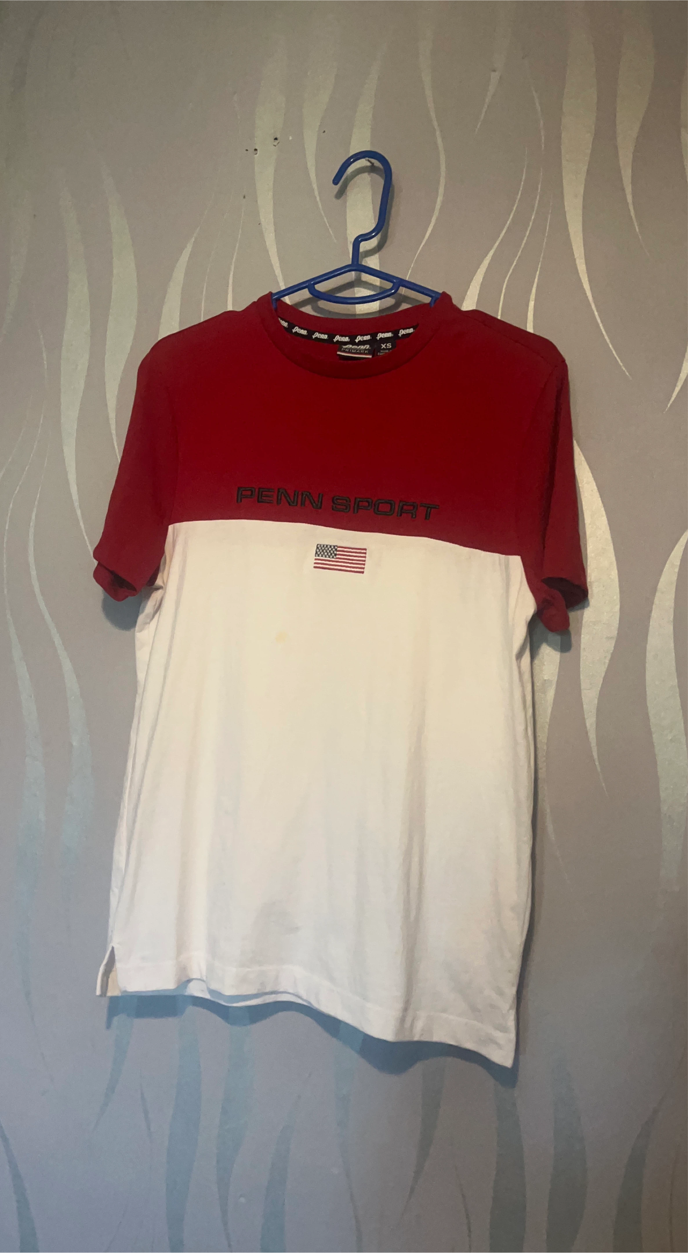 2 reviewsHere's a Penn Sport t-shirt in a striking red and white colour block design. It's a size XS and features the Penn Sport logo across the chest, along with an American flag detail. Perfect for casual wear!
