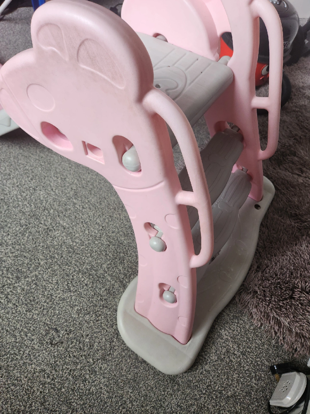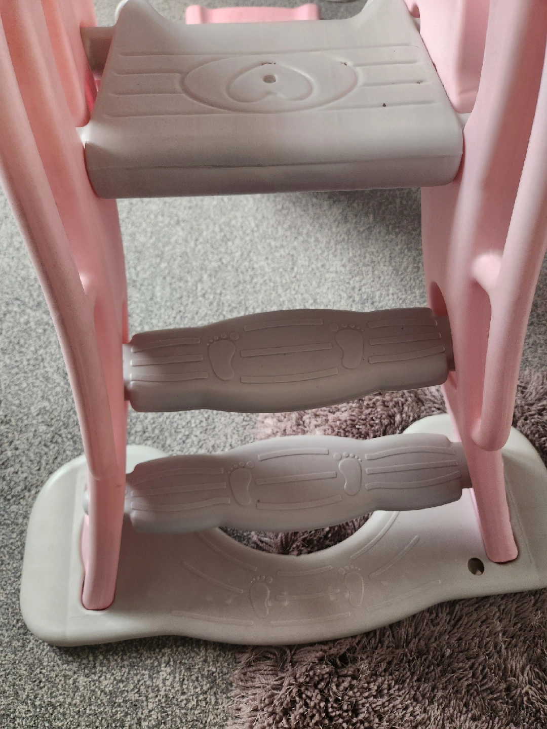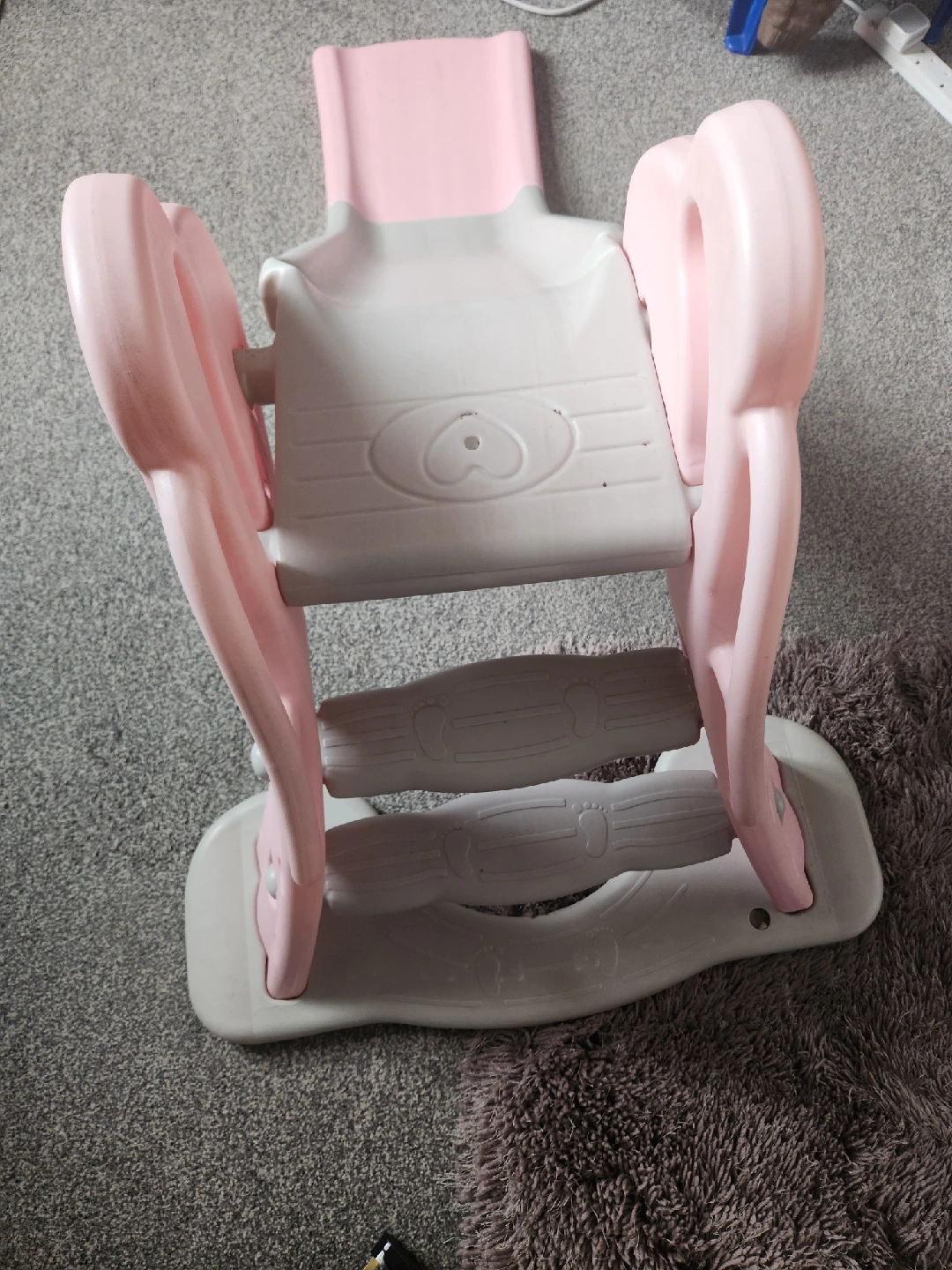 9 reviewsSelling a cute pink and white slide for little ones! It's in good condition and perfect for indoor or outdoor fun. The steps have little foot prints on them!