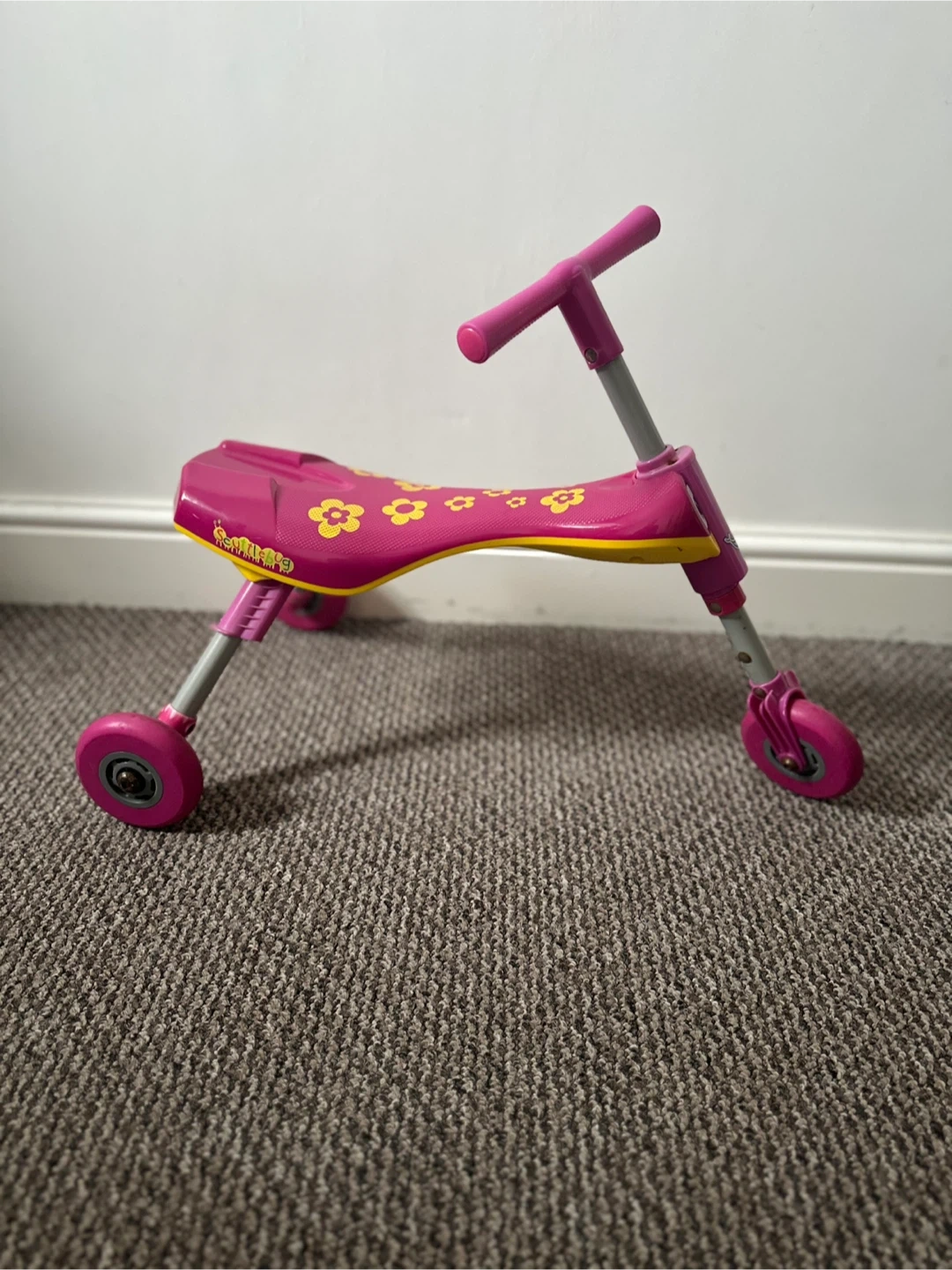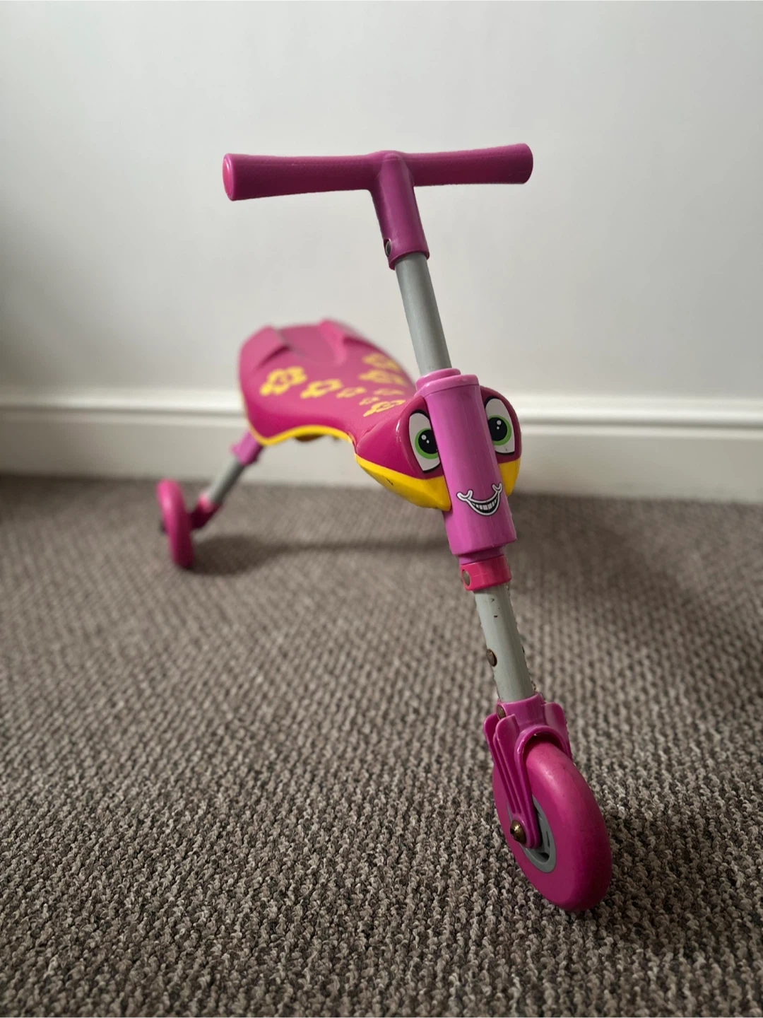 9 reviewsHere's a cute pink Kiddimoto folding scooter, perfect for little ones! It's in great condition and ready for some fun adventures. It's lightweight and folds easily for storage or taking on the go. Ideal for children learning to scoot!