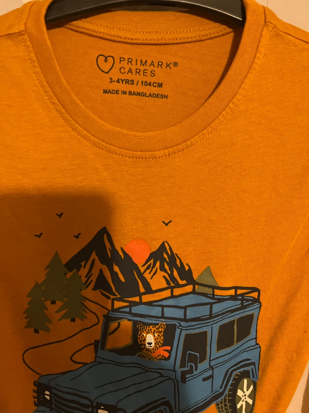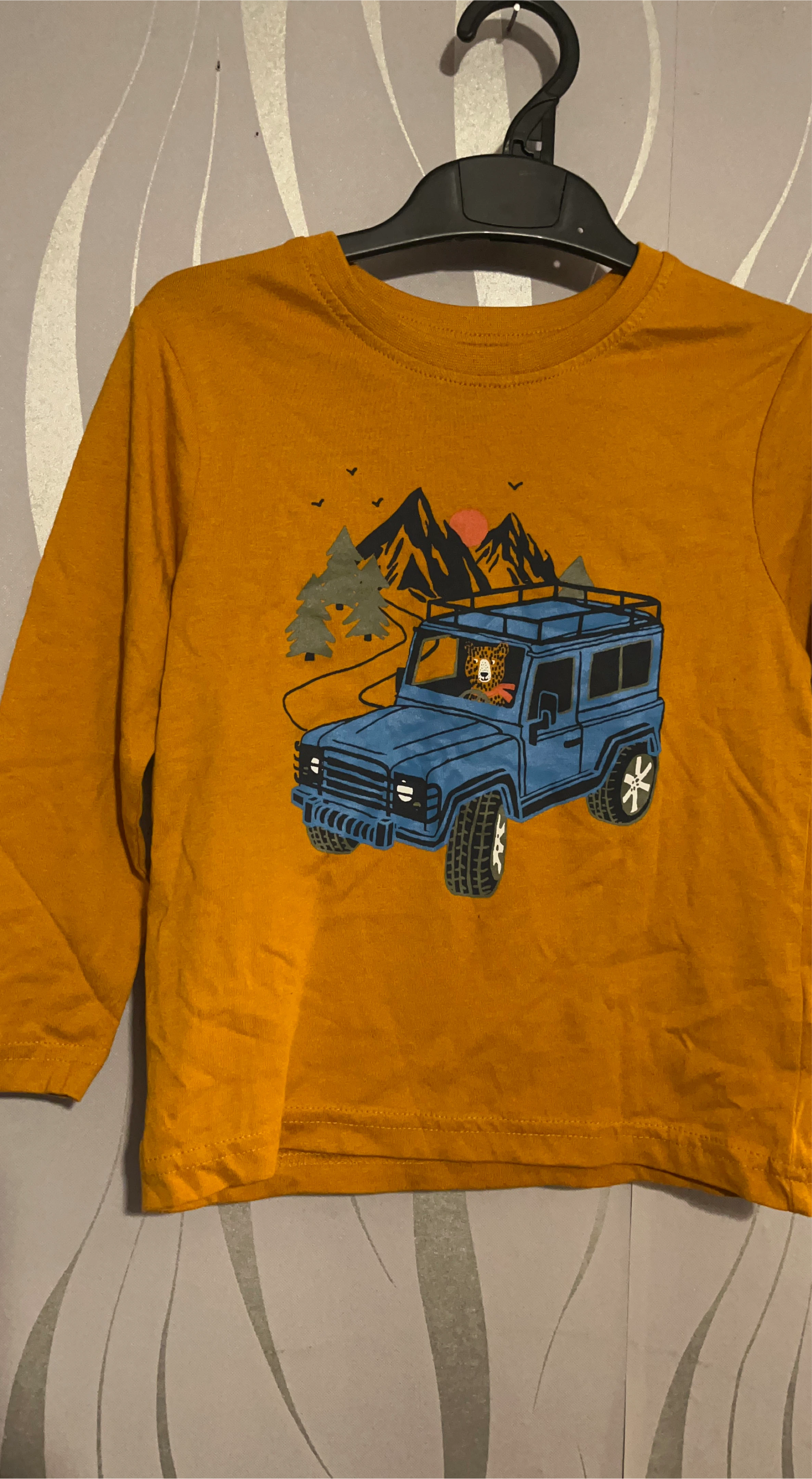 2 reviewsA lovely long-sleeved top from Primark Cares. It's in size 3-4 years (104cm). The top features a fun design with a blue jeep, mountains and trees on a mustard yellow background