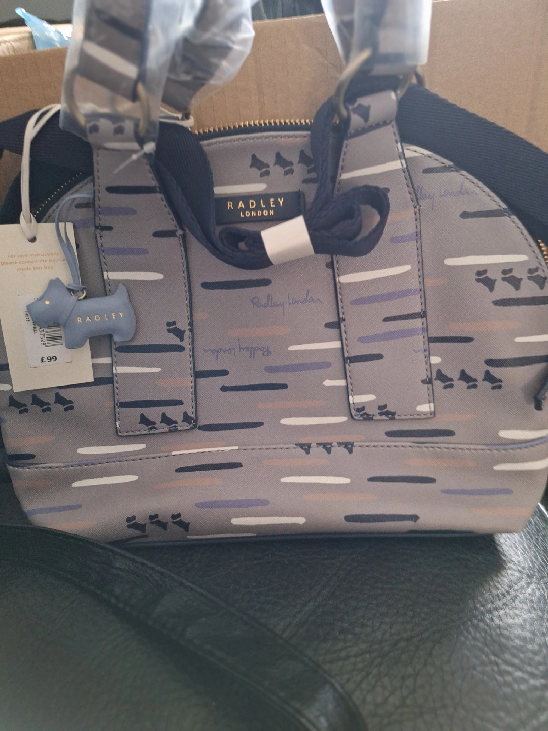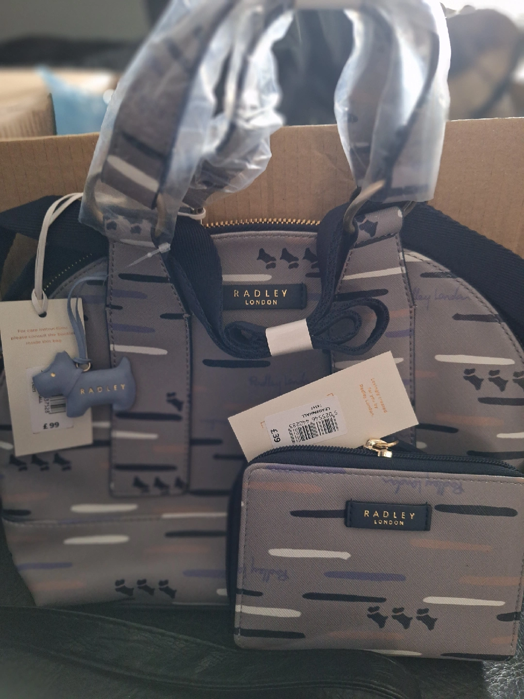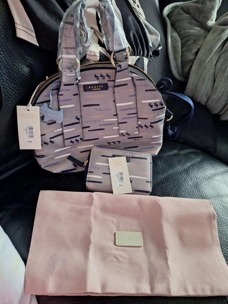 7 reviewsBrand new still with tags matching radley bag and purse set with pink dust bag. Bag has a few inner pockets and a zipped pocket with the leather radley dog, has a long strap so can be used as a shoulder or cross body bag, it is navy blue. It is a pvc and leather exterior and a polyester lining with navy piping to the edges. The matching purse has lots of card slots and an inner zipped pocket. As you can see in the pictures these were not cheap at a total of £138 for both, and still have all the covers on the bag and price cards attached. Lovely set. Only selling as they were a present but not used. I have other radley bag and purse sets for sale so please do check them out. No courier delivery!!