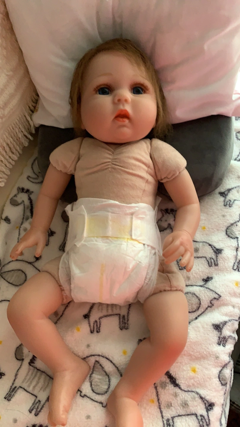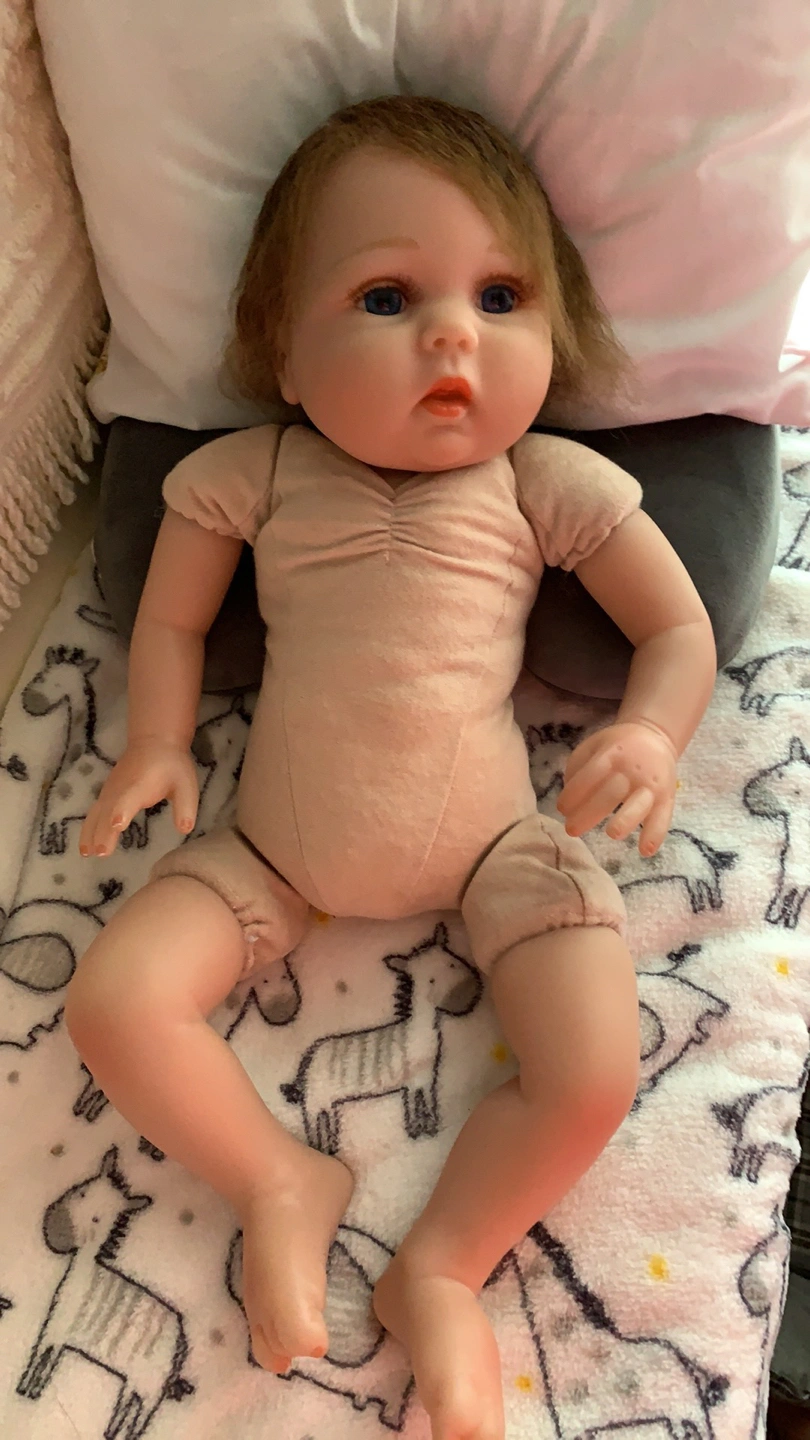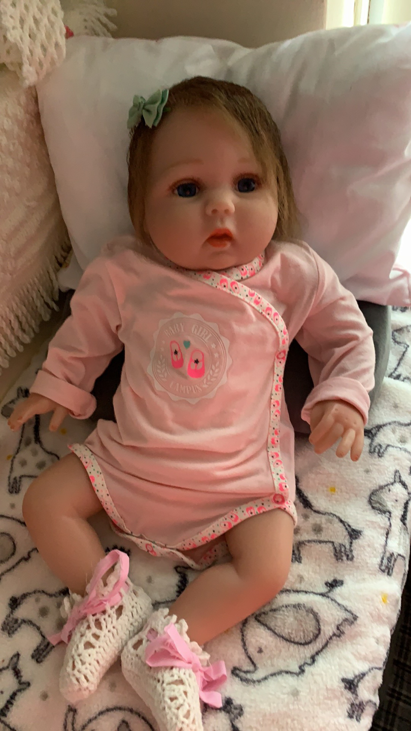 0 reviewsReborn baby girl on a soft suede doe body very soft squishy vinal arms and legs . She takes a magenetic pacifier comes in the clothes in pics and the dummy can do a box opening for extra eg with outfit sealed bottle baby brush/comb conditioner spray . Pick up or can post for extra .