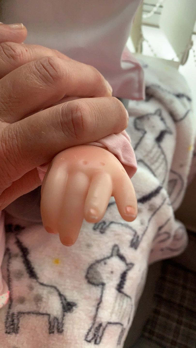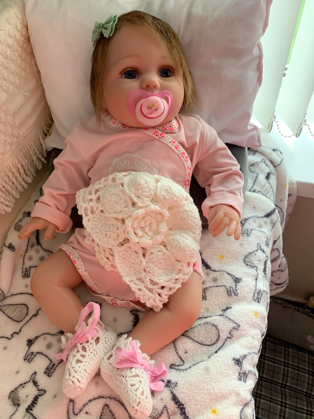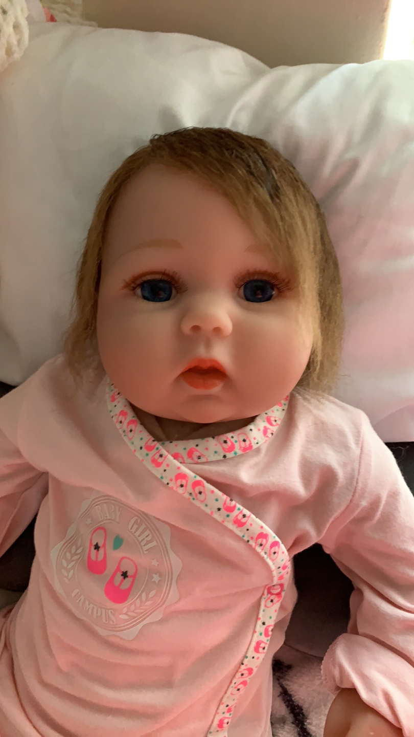 0 reviewsReborn baby girl on a soft suede doe body very soft squishy vinal arms and legs . She takes a magenetic pacifier comes in the clothes in pics and the dummy can do a box opening for extra eg with outfit sealed bottle baby brush/comb conditioner spray . Pick up or can post for extra .