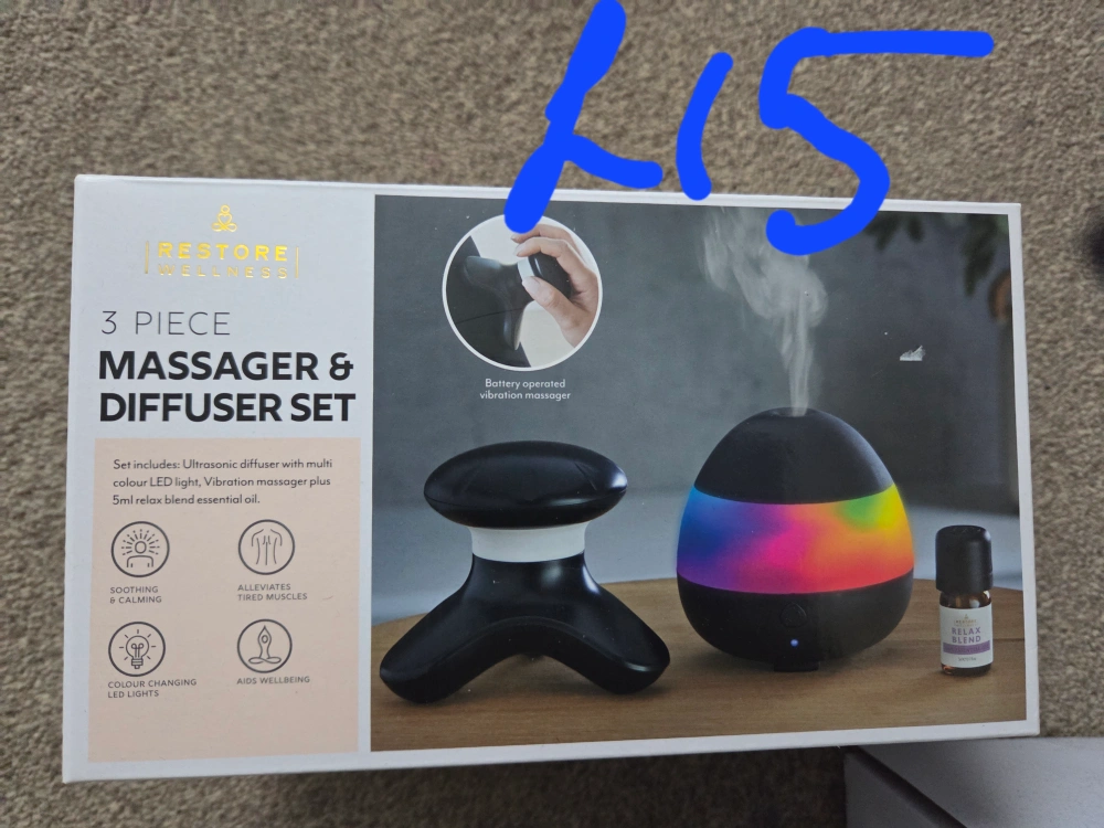 30 reviewsbrand new Selling a Restore Wellness 3 Piece Massager & Diffuser Set. Set includes: - Ultrasonic diffuser with multi colour LED light - Vibration massager - 5ml relax blend essential oil It features colour changing LED lights and alleviates tired muscles