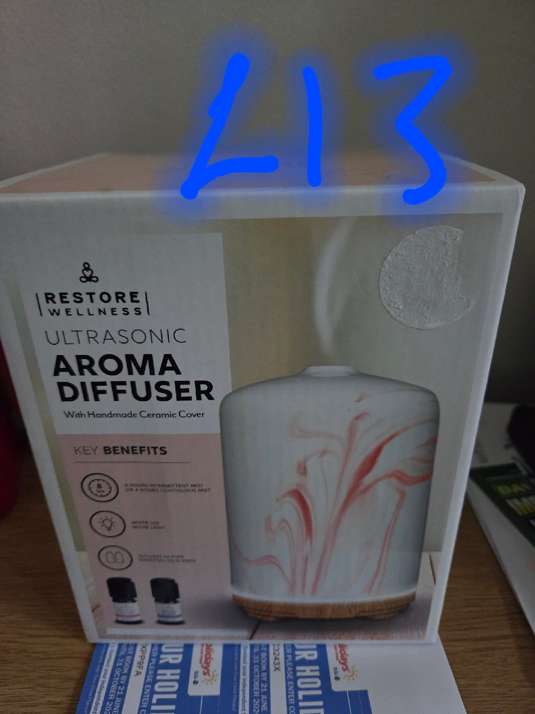 30 reviewsbrand new Selling a Restore Wellness Ultrasonic Aroma Diffuser with a handmade ceramic cover. Key benefits: - 8 hours intermittent mist or 4 hours continuous mist - White LED mood light - Includes 2x pure essential oil blends
