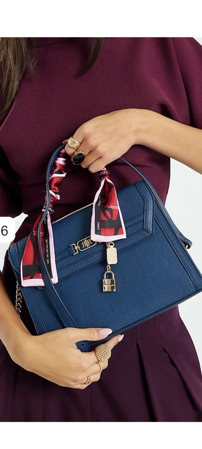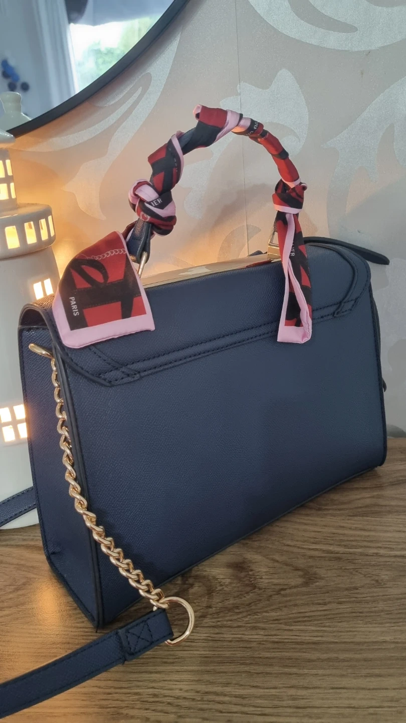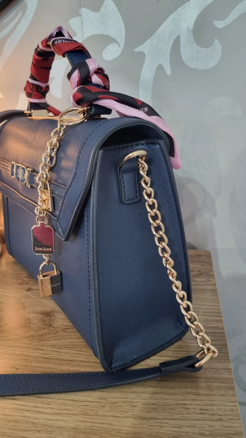 24 reviewsA stylish navy blue handbag from River Island. It's made from a textured faux leather and features gold-tone hardware, including a decorative lock and key charm. The top handle is adorned with a colourful scarf, and it also has a detachable chain strap for versatility. Great for adding a chic touch to any outfit! Excellent Condition. Paid £46 few weeks ago