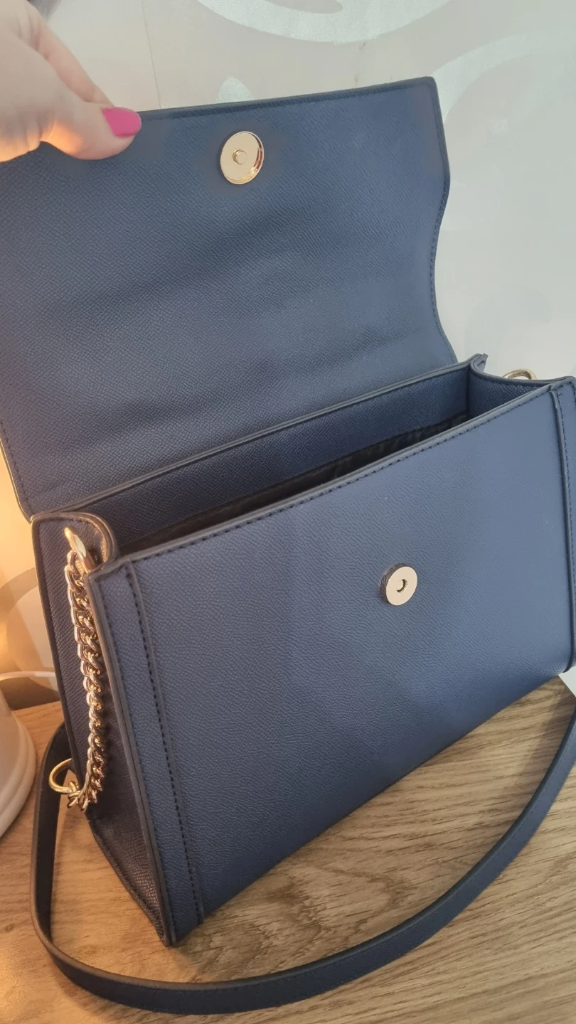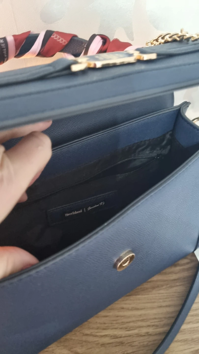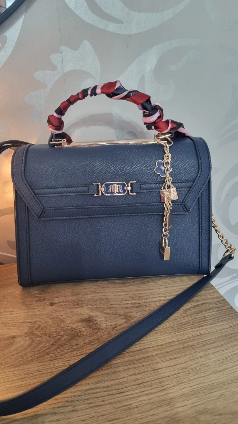 24 reviewsA stylish navy blue handbag from River Island. It's made from a textured faux leather and features gold-tone hardware, including a decorative lock and key charm. The top handle is adorned with a colourful scarf, and it also has a detachable chain strap for versatility. Great for adding a chic touch to any outfit! Excellent Condition. Paid £46 few weeks ago