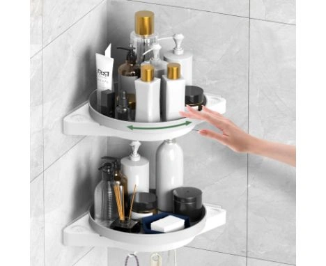 2 reviewsWhite, two-tier, rotating, corner shelf. Ideal for bathroom storage. 360° Rotate Rotate Corner Plastic Shower Organizer Storage Turntable MARKET PRICE:£26.14