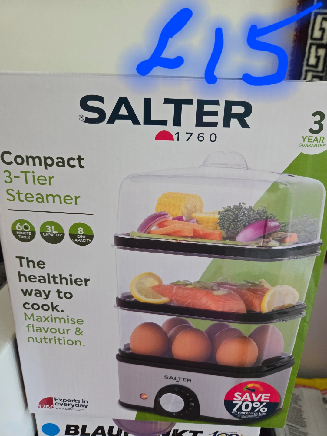 30 reviewsHere's a Salter Compact 3-Tier Steamer. It has a 3L capacity and can hold up to 8 eggs. It also has a 60-minute timer. The packaging says it helps you maximise flavour and nutrition. Grab a bargain!
