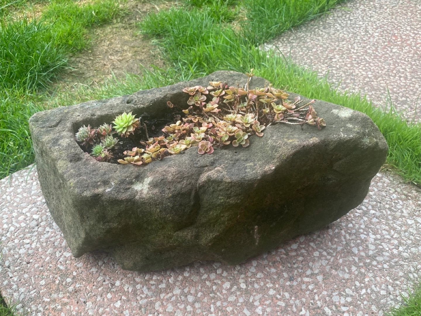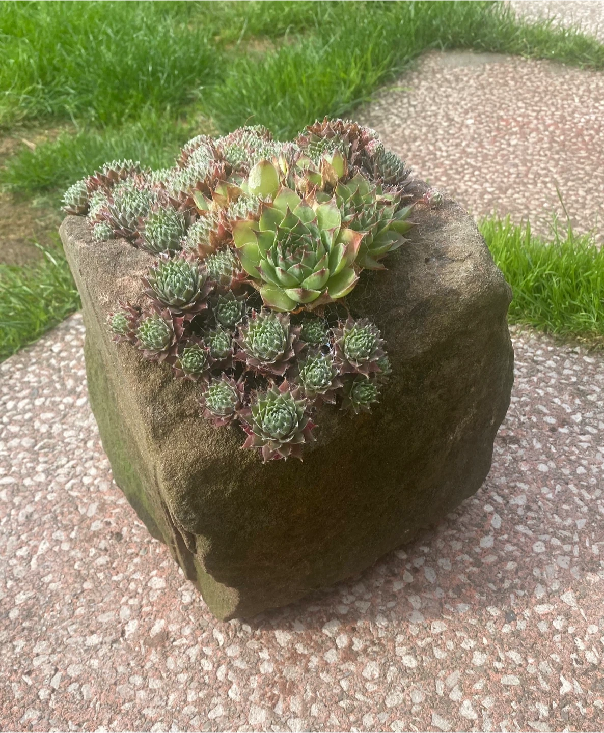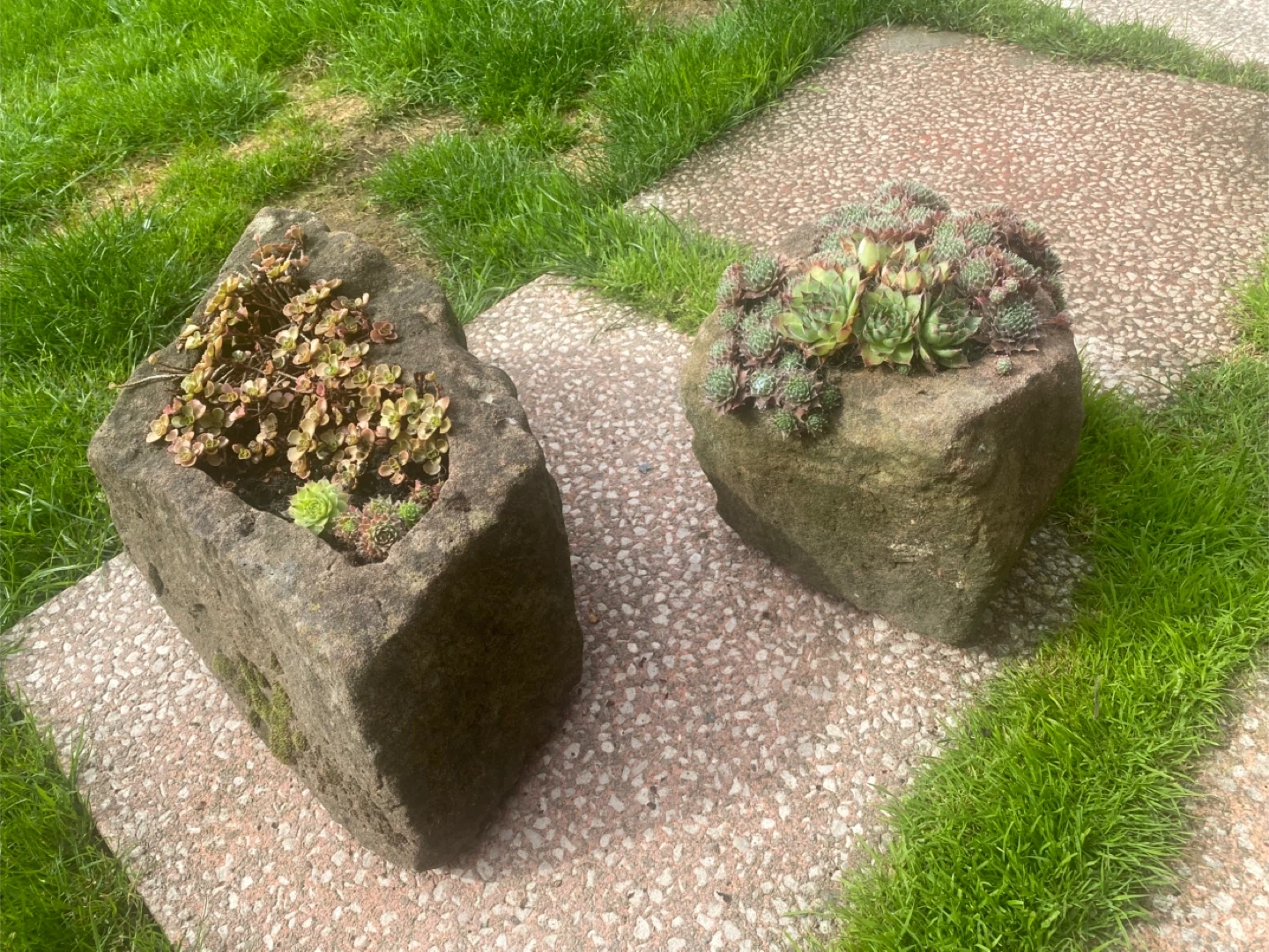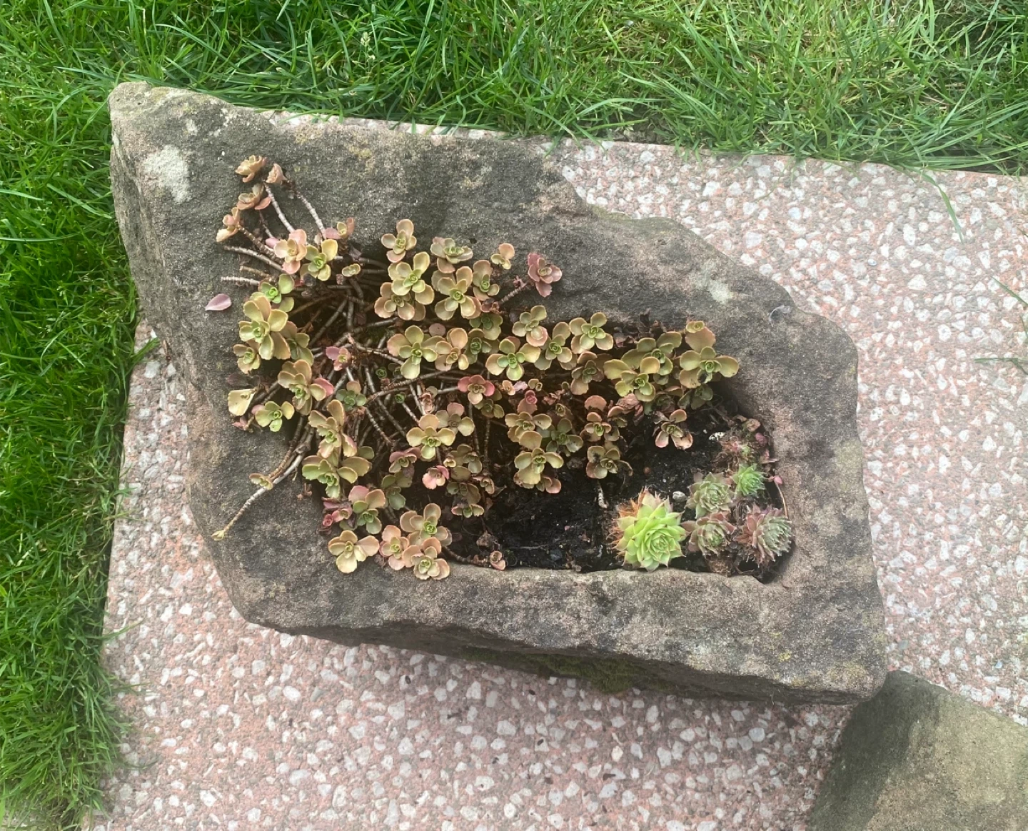4 reviewsI have two sandstone planters made from natural sandstone. These are very heavy, there are drain holes in the bottom and have a natural mossy weathered patina to them. Ideal for placing on paths and patios. Both are planted and established. The small one is roughly 200 x 200 x 200 mm, the large one is 300 x 260 x 200 mm (L,W,H) Due to the weight it’s collection only.