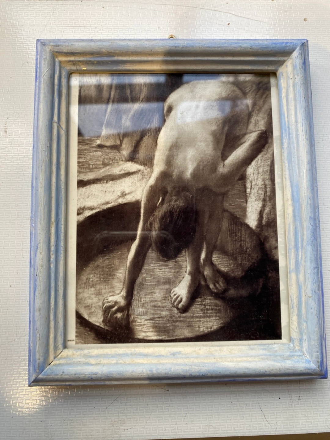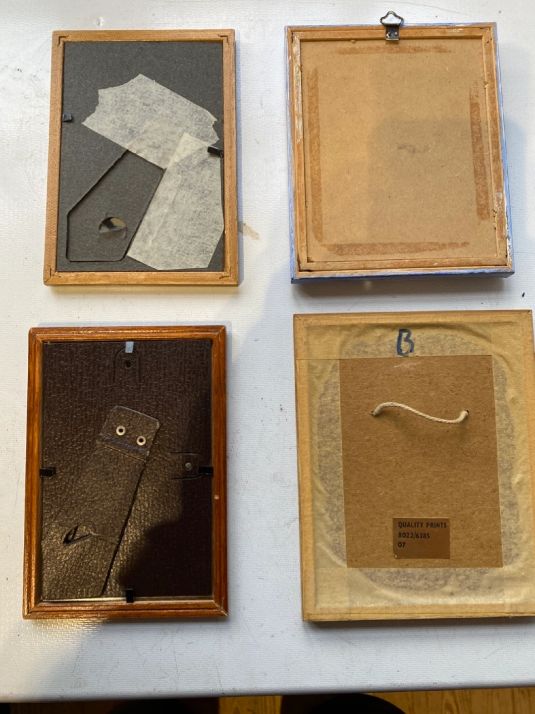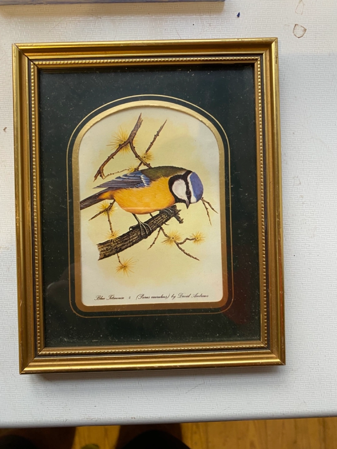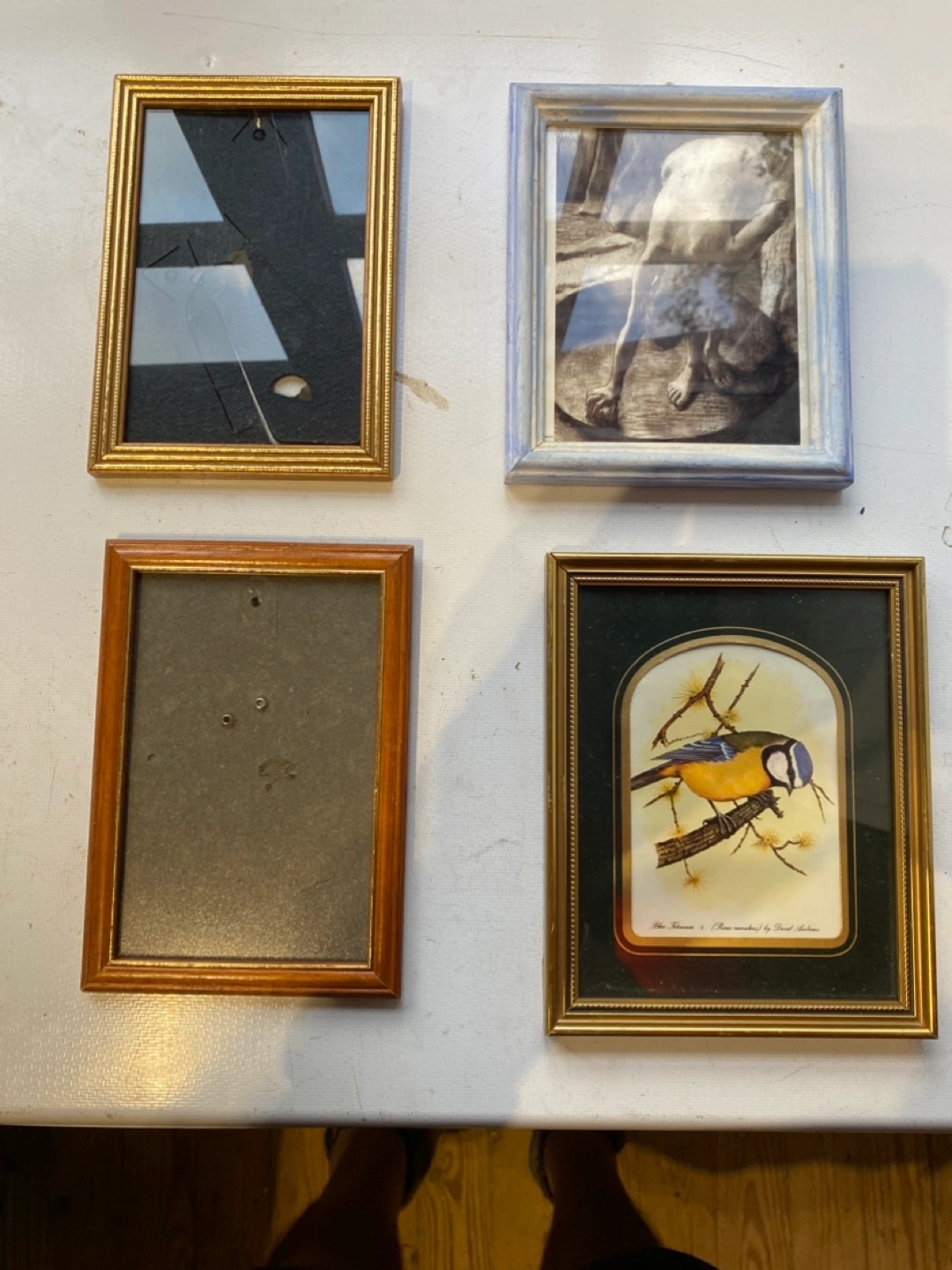 1 reviewA selection of picture frames in various styles and colours. One frame includes a print of a blue tit, and the other one is off someone looks like washing a big bowl, two will hang from the wall and two of them will sit on the table or shelf or side board or wherever you want them to be, as pictured above thanks for looking Tony.