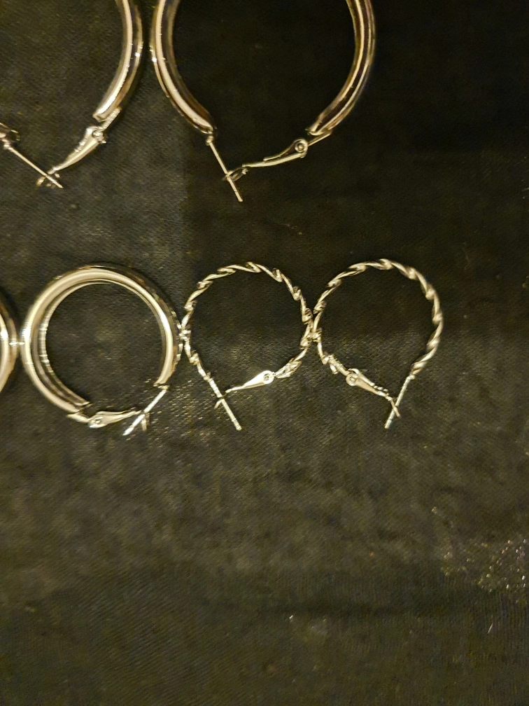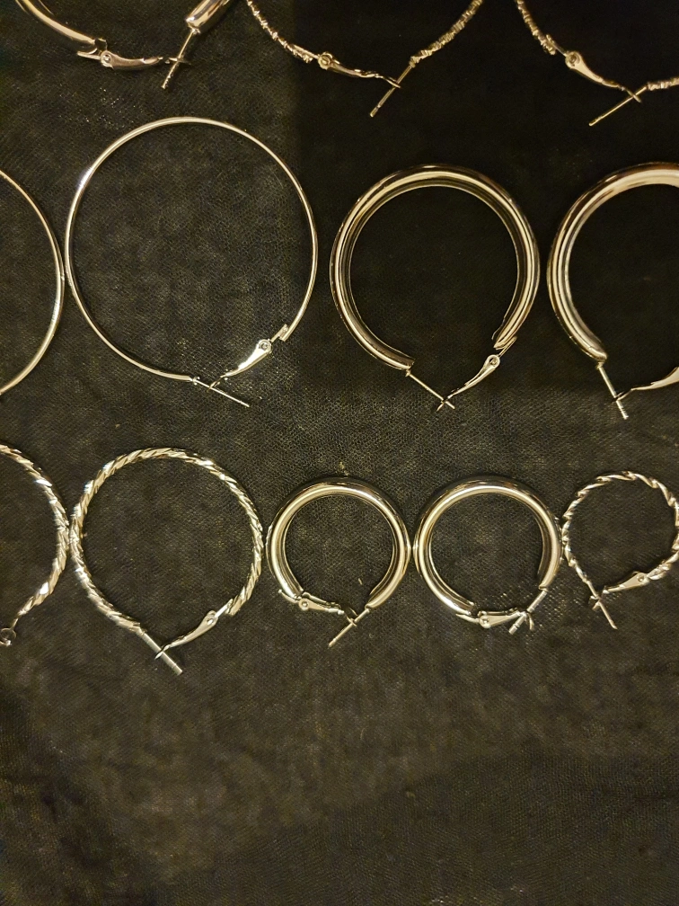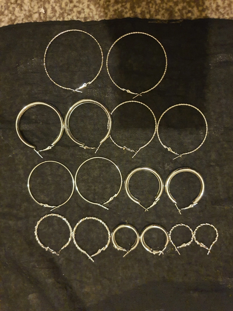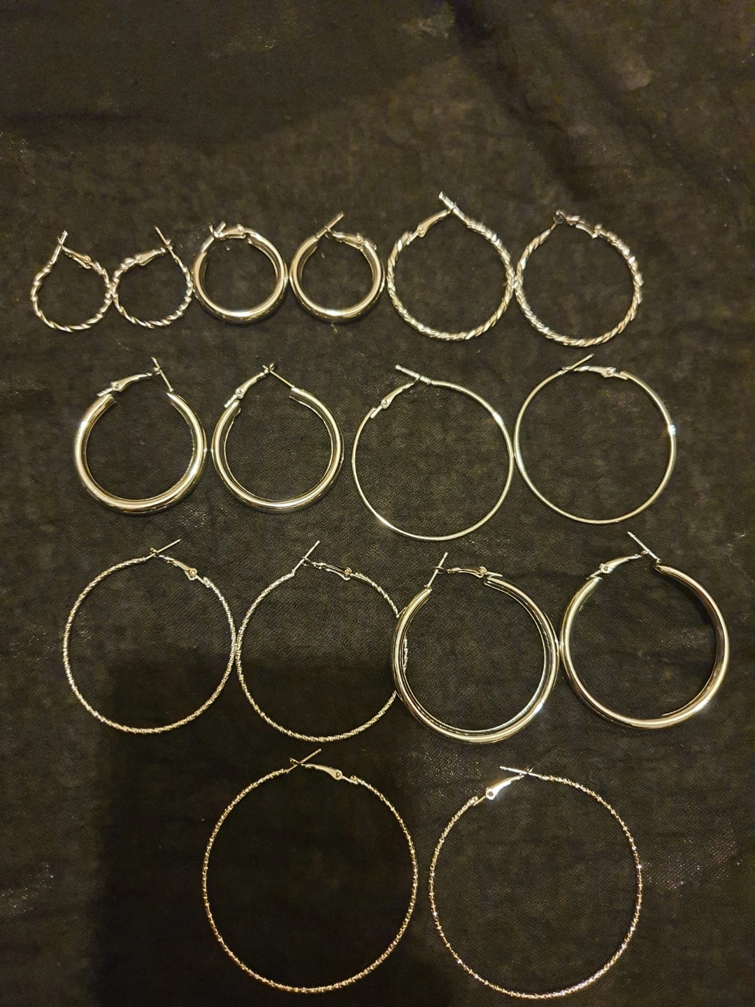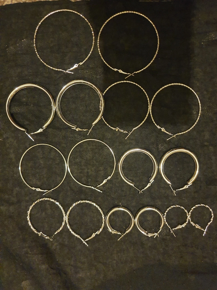 Here's a selection of silver hoop earrings in various sizes and styles. Perfect for adding a bit of sparkle to any outfit!