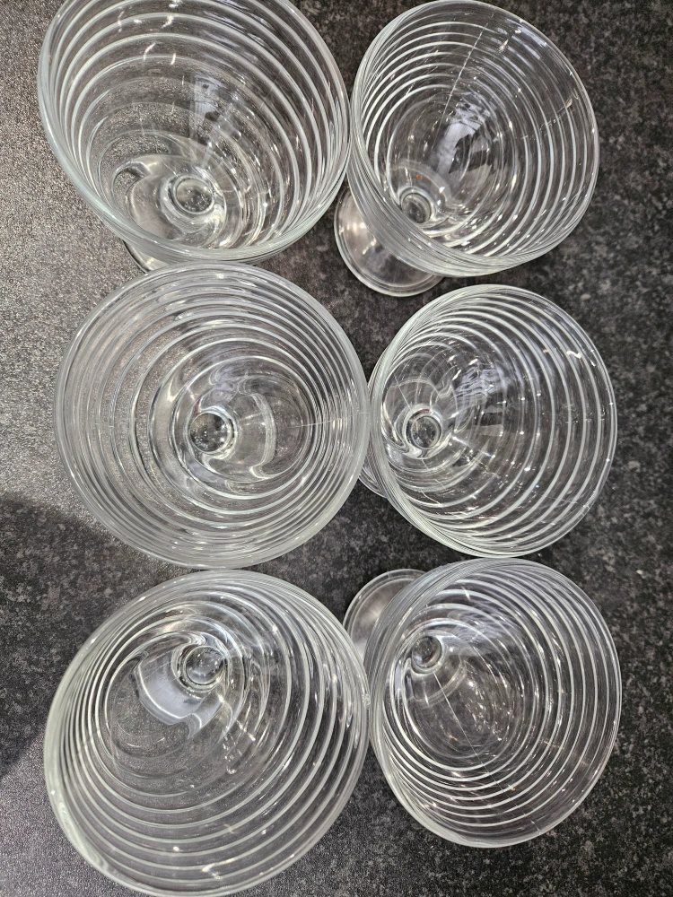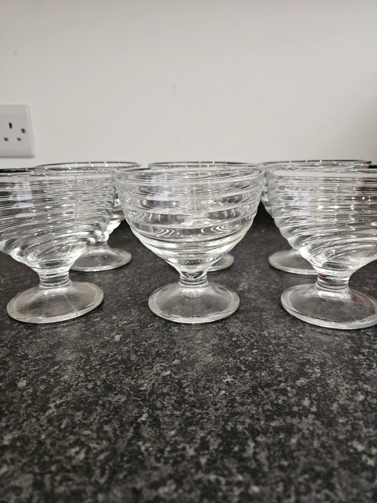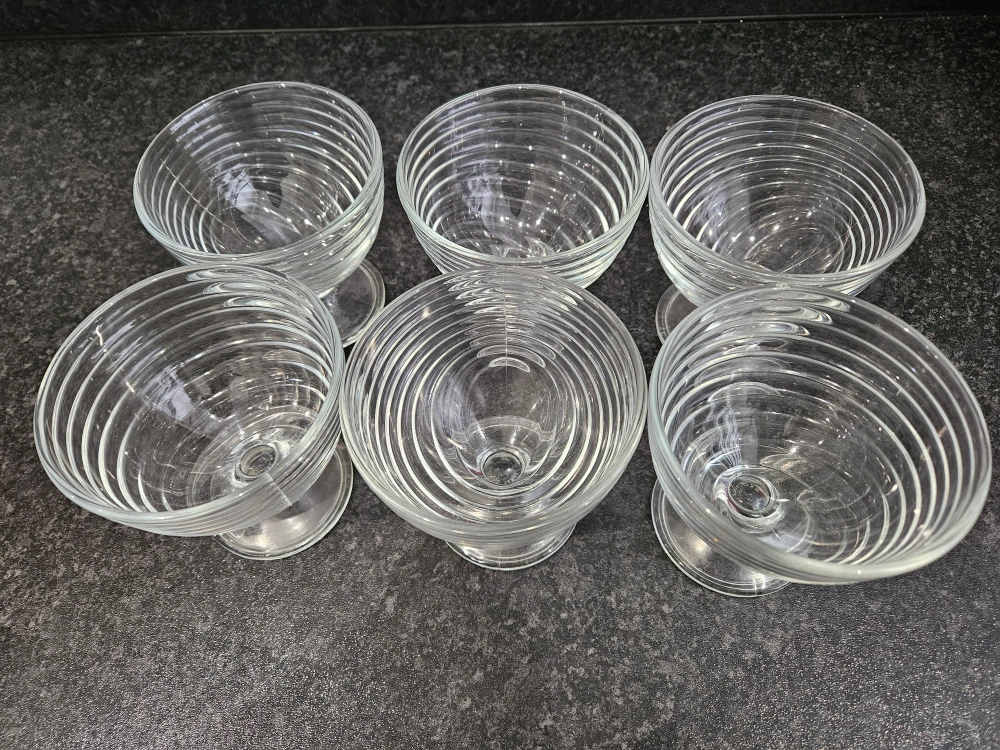 20 reviewsSix elegant, clear glass dessert dishes. Spiral design. Ideal for serving ice cream, trifles, or other desserts. Used but in good condition.