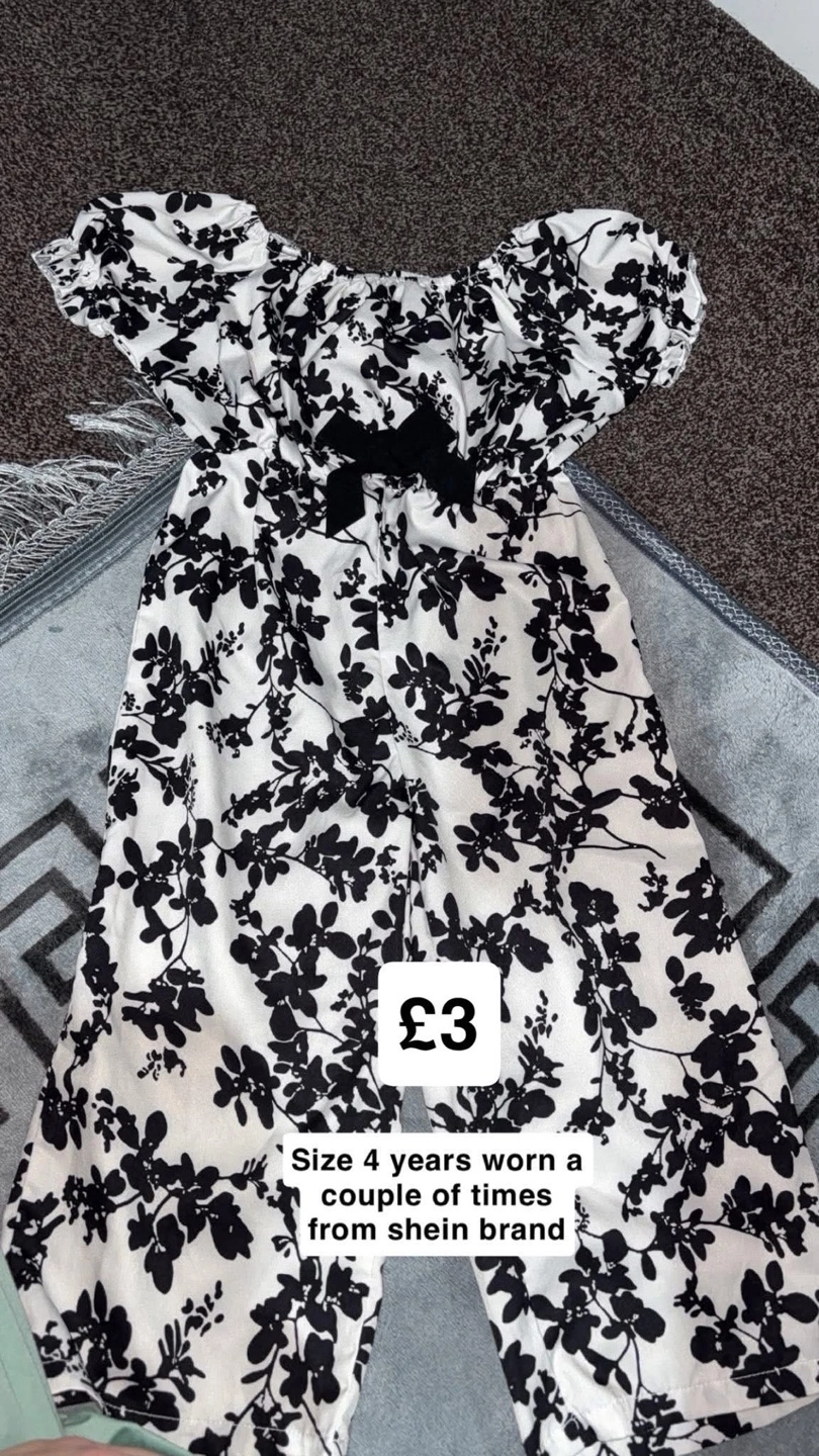 0 reviewsHere's a lovely jumpsuit from Shein in a size 4 years. It has a black and white floral pattern and a cute black bow. It's been worn a couple of times but is still in great condition!