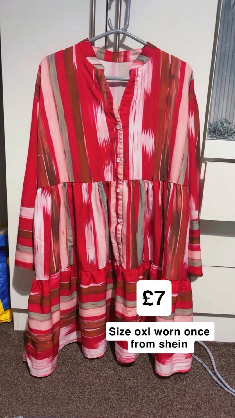 Show allSelling a Shein dress, size OXL. It's a lovely red colour with a unique patterned design. Worn only once, so it's in great condition!
