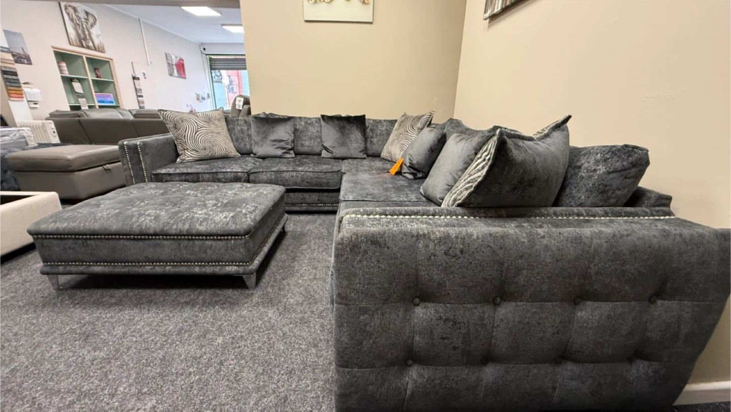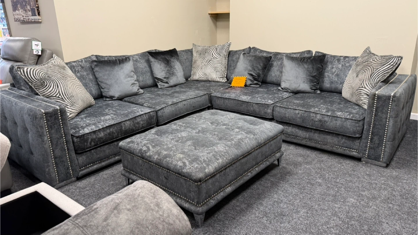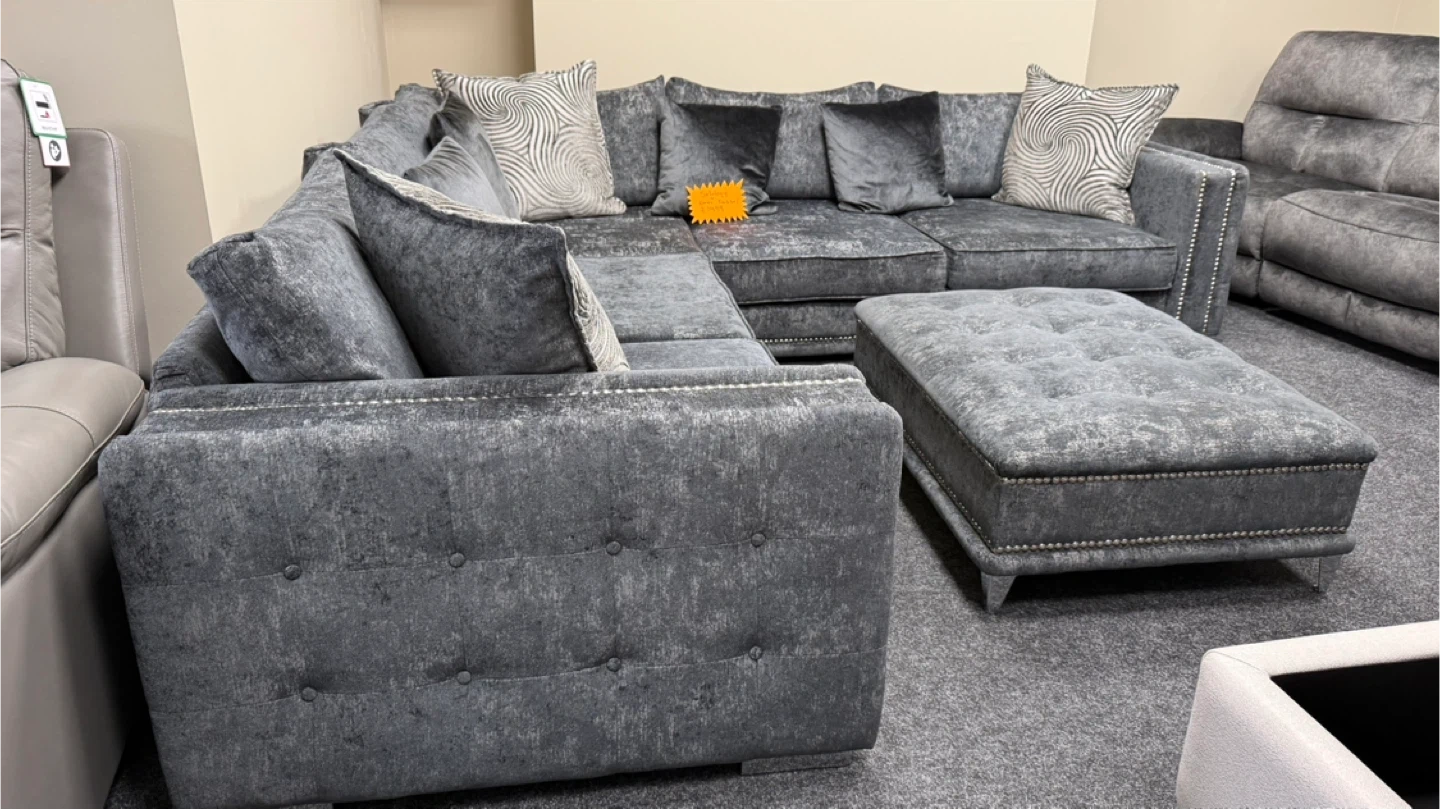 ✨ Stunning Grey Corner Sofa with Matching Footstool ✨ Upgrade your living room with this luxurious grey crushed velvet corner sofa featuring a modern studded design and deep, plush cushions for ultimate comfort. Includes matching large footstool — perfect for relaxing or extra seating! ✅ Stylish & Comfortable ✅ Premium soft-touch fabric ✅ Deep seats and thick cushions ✅ Modern silver stud detailing ✅ Includes matching scatter cushions 📍 Friendly Furniture 13 Railway Road, Leigh, WN7 4AA 📞 07543 783313 Measurement: 275 cm x 275 cm x 100 cm Seat depth: 75 cm Height: 75 cm 🕙 Open Monday – Saturday, 10am – 5pm 🚚 Same-day delivery available all over the UK 👀 Welcome to view and try in-store! #FriendlyFurniture #Sofa #CornerSofa #VelvetSofa #GreySofa #HomeComfort #LivingRoomStyle #FurnitureStore #Leigh #UKFurniture #SofaLove