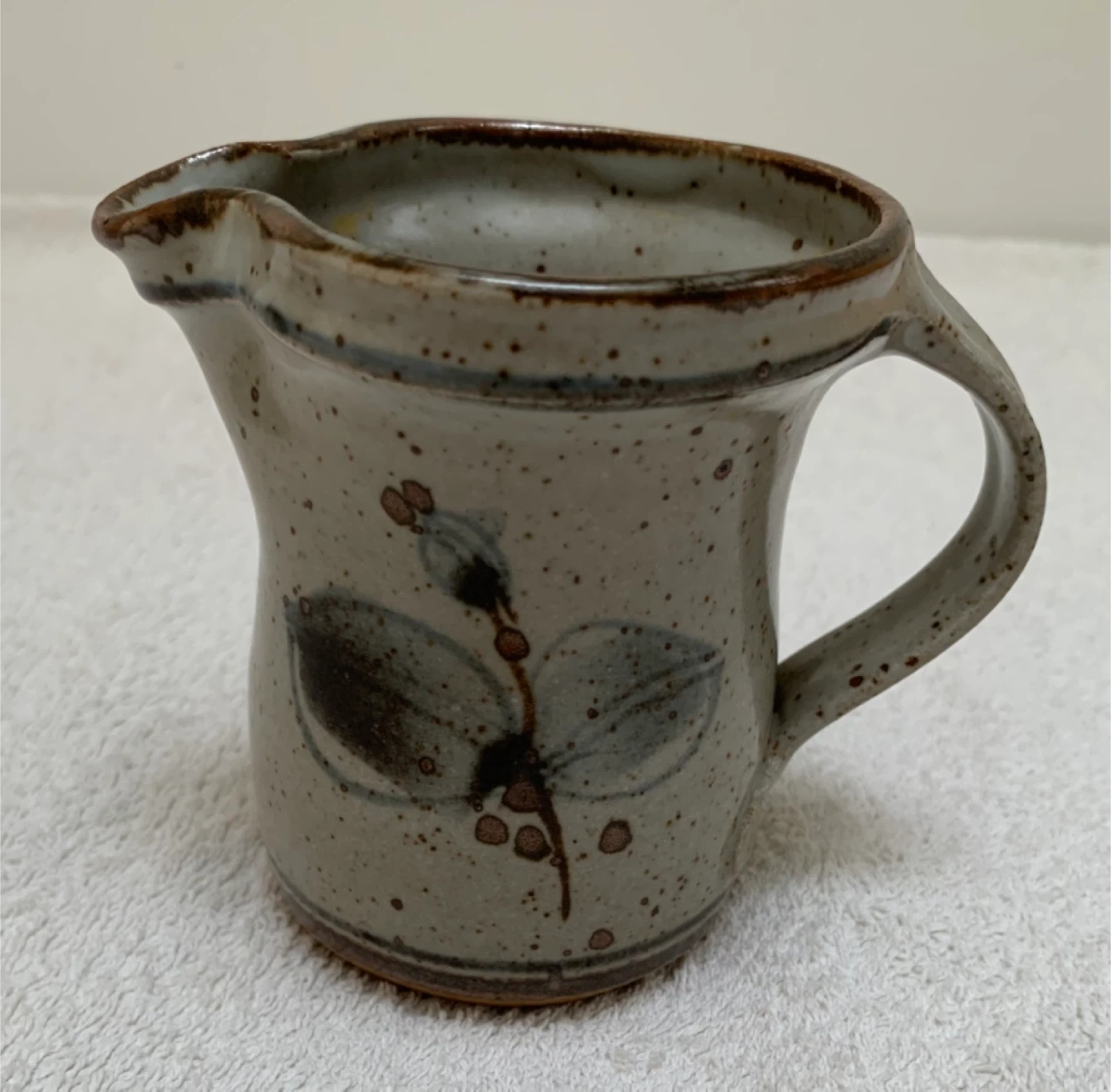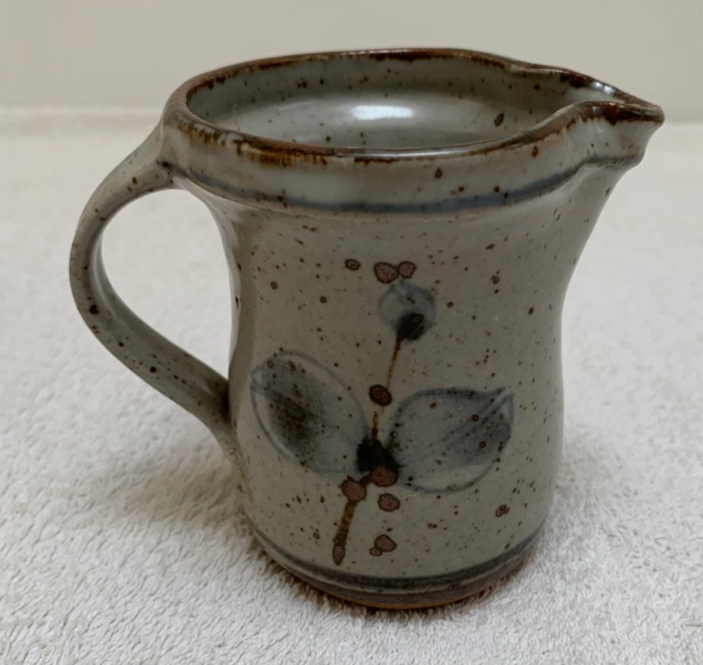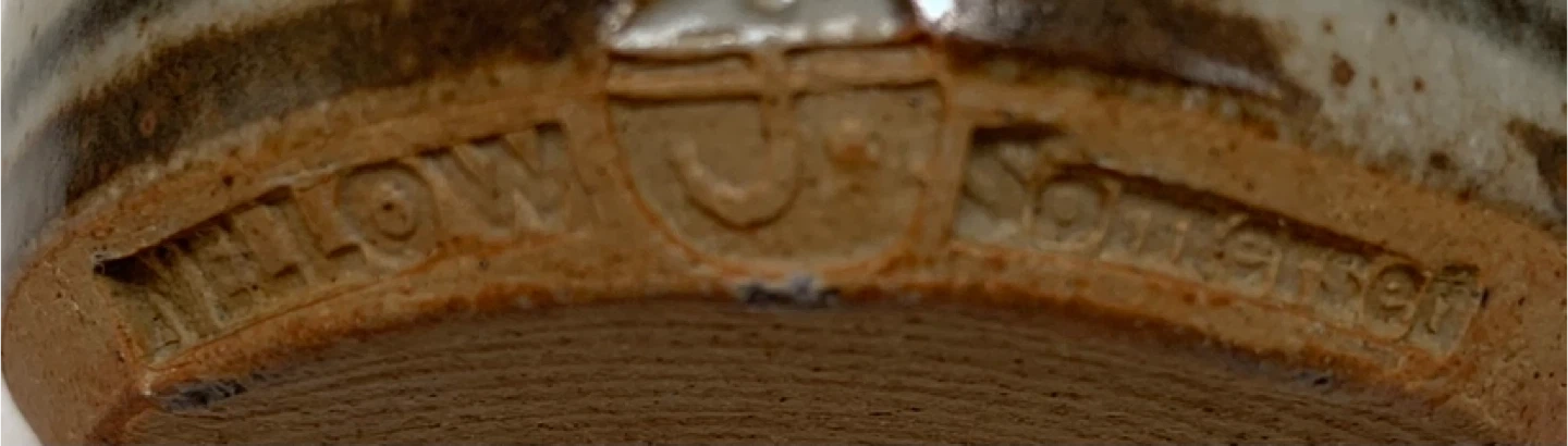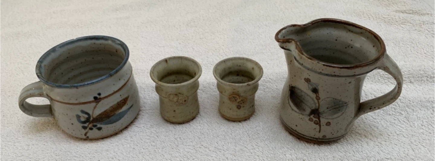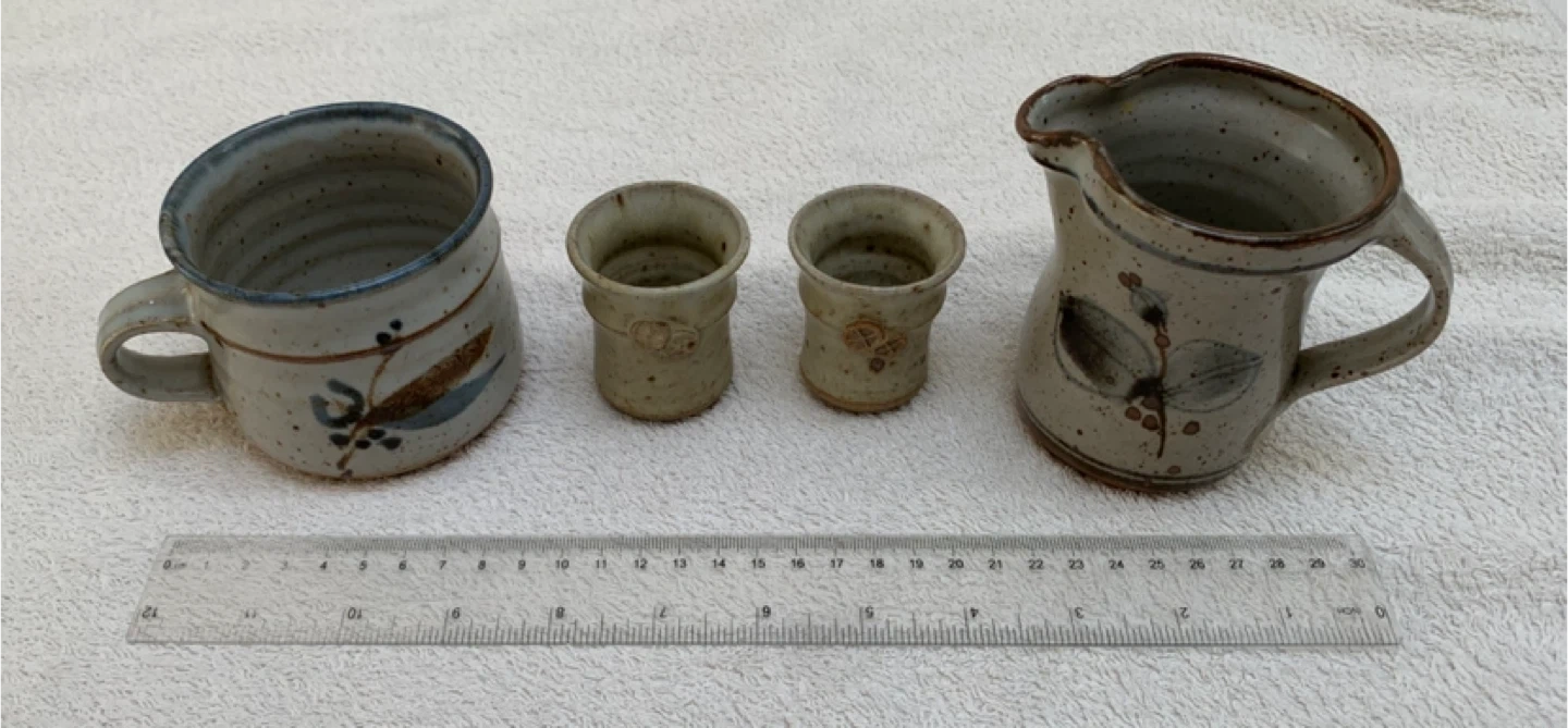 0 reviewsHarlequin set of grey Somerset stoneware. - One milk jug with plant motif, 11.0 x 8.3 x 9.6 cm (l/w/h) - One mug with plant motif, 10.5 x 8.5 x 7.1 cm (l/w/h) - Two egg cups, each with a raised decoration depicting two wheels, 5.4 x 4.8 cm (w/h) Each item is marked ‘Yellow Somerset’. The mug has a small chip, as per last photo.